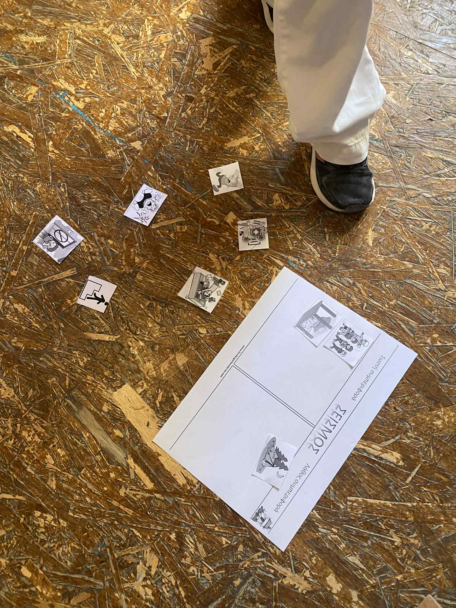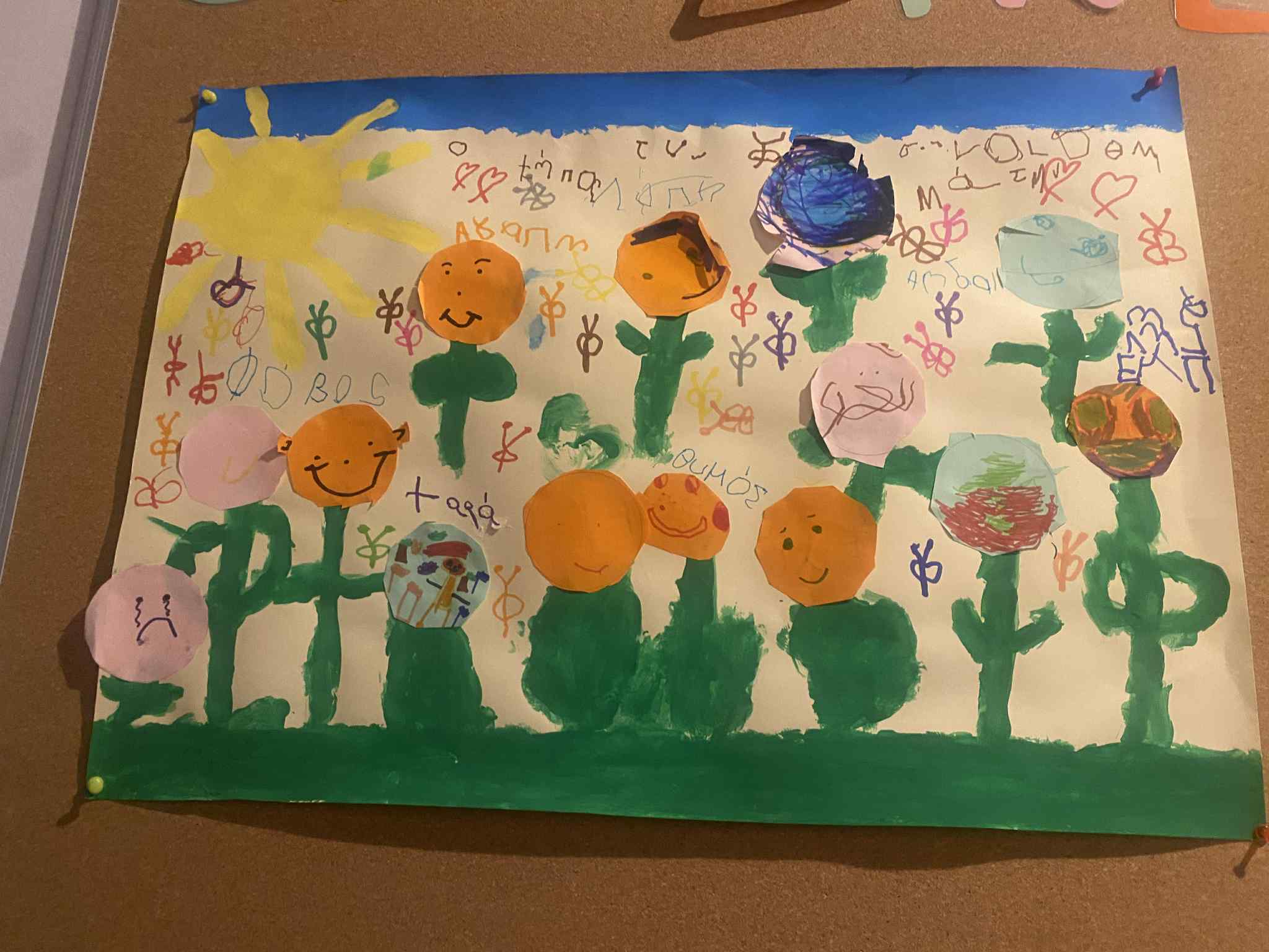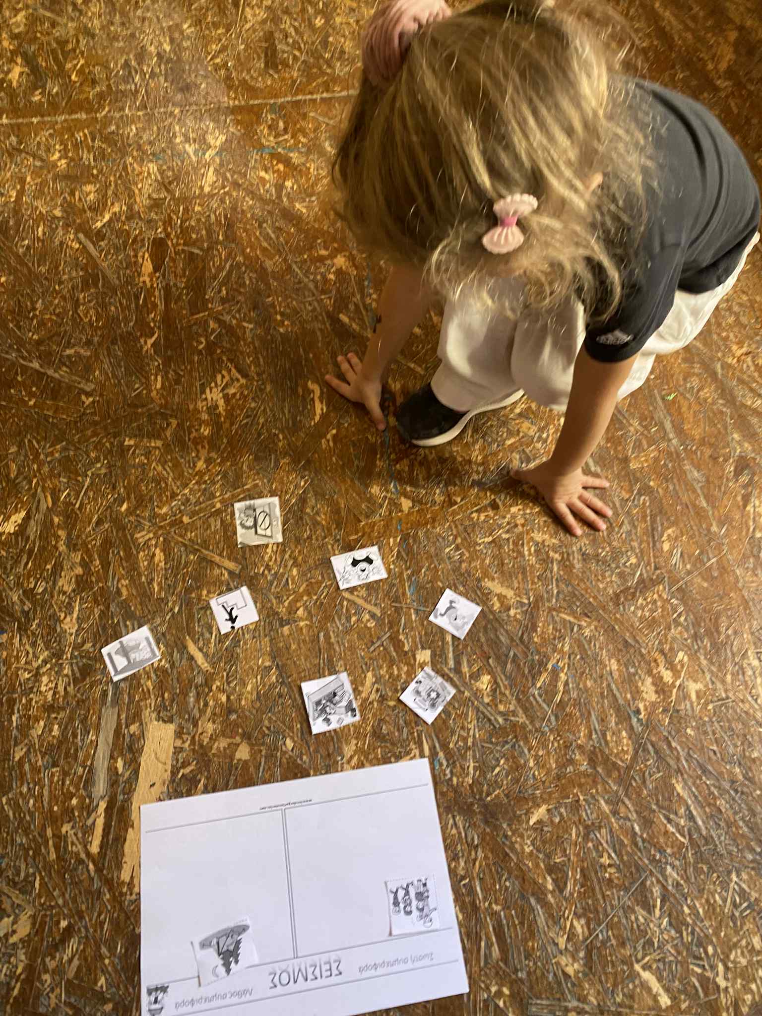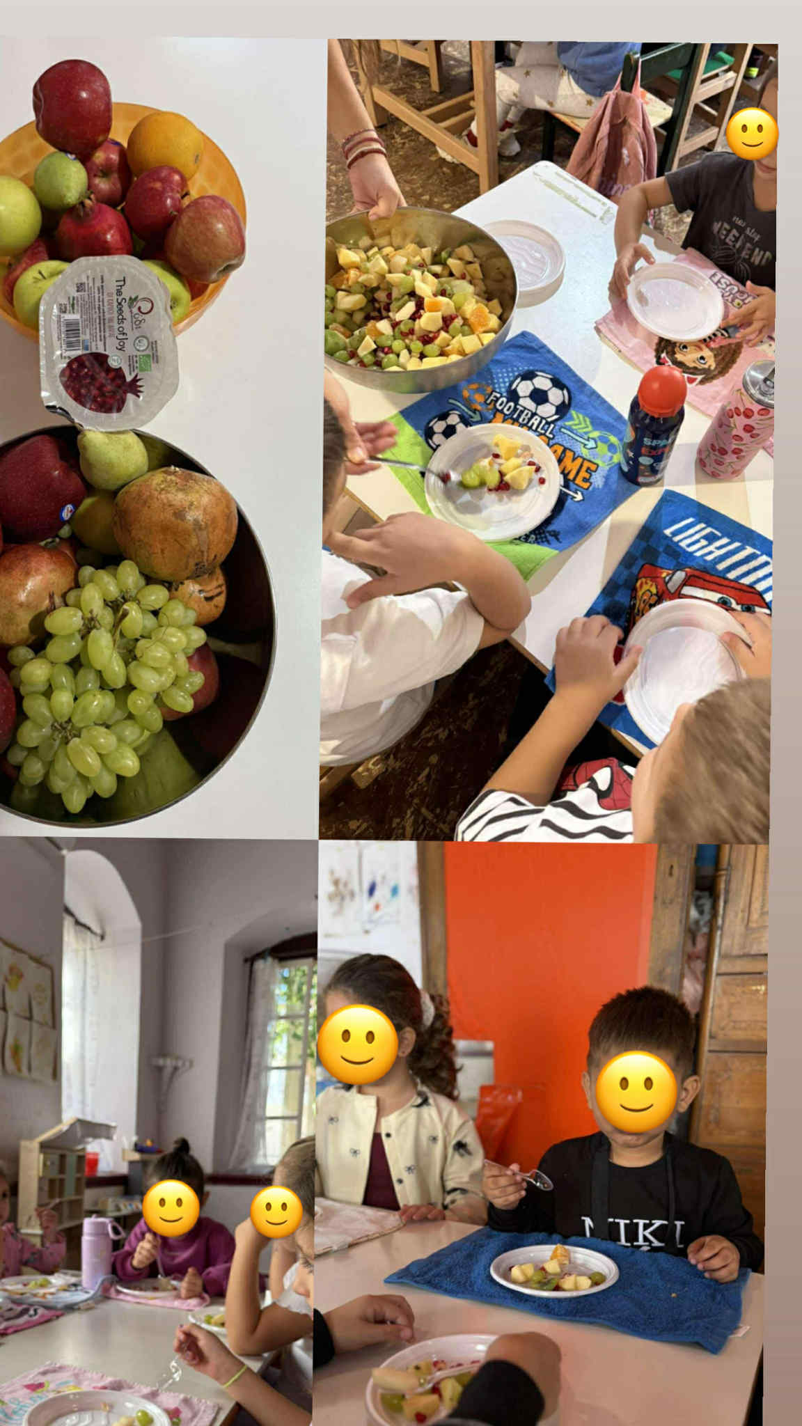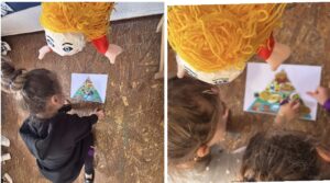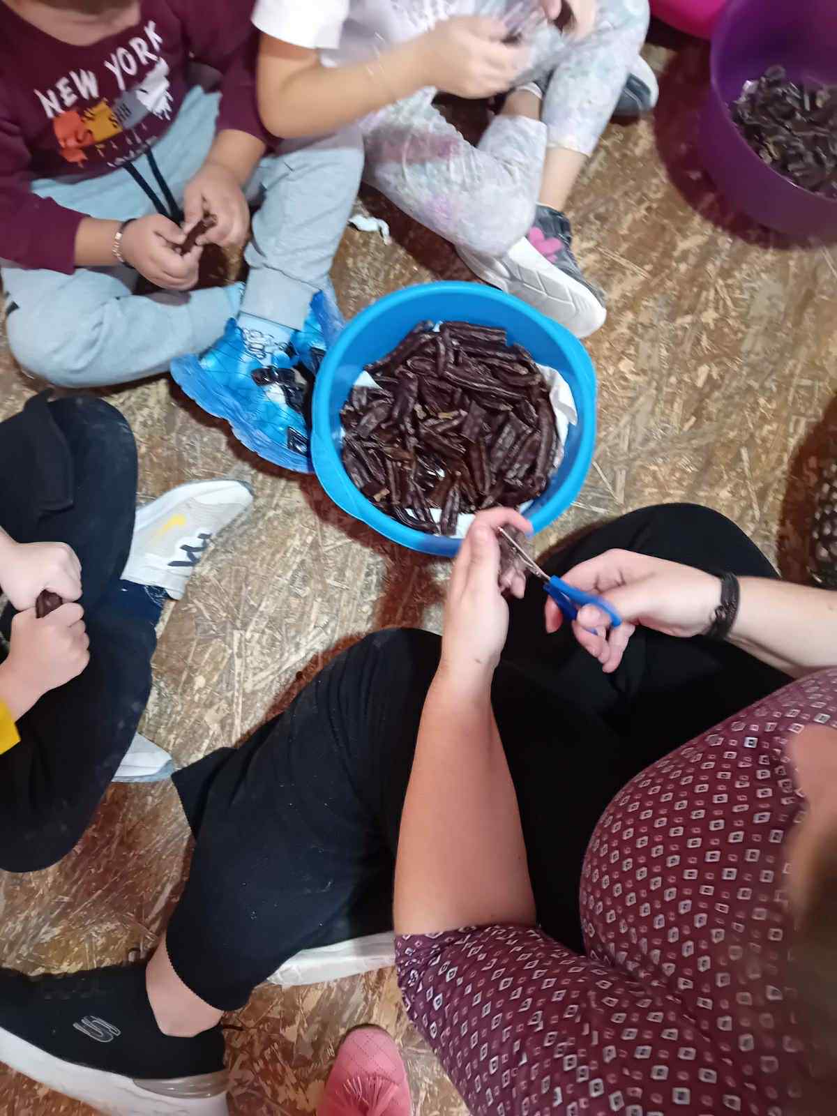 Στη συνέχεια, τα παιδιά επεξεργάστηκαν τον πίνακα του Θεόφιλου «Λιομάζωμα». Παρατήρησαν τις φορεσιές των ανθρώπων, τι χρησιμοποιούν για το λιομάζωμα και μέτρησαν τις φιγούρες στον πίνακα. Αναπαρέστησαν τον πίνακα με το σώμα τους, με το κάθε παιδί να αναλαμβάνει έναν διαφορετικό ρόλο. Ακολούθως, μέσα από μια ομαδική δουλειά, τα παιδιά δημιούργησαν σε μεγάλο χαρτόνι τον πίνακα του Θεόφιλου, με πρωταγωνιστές τα ίδια.
