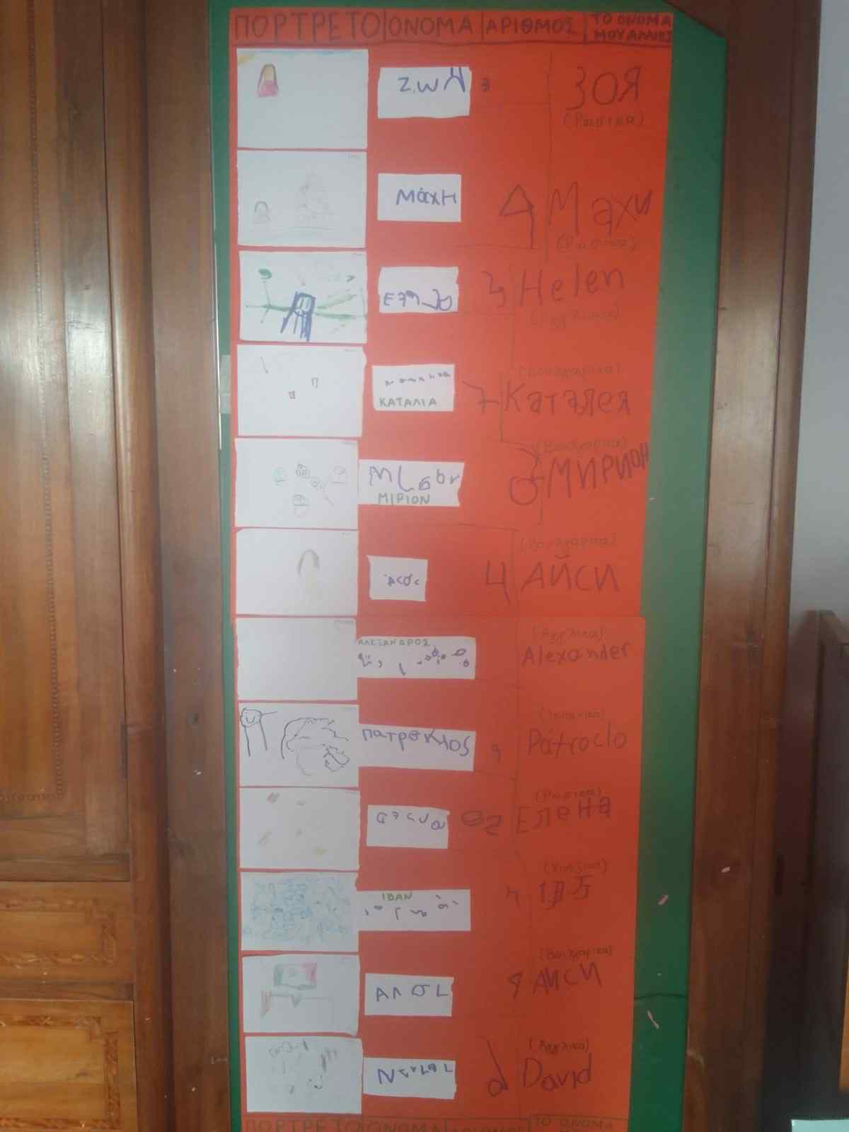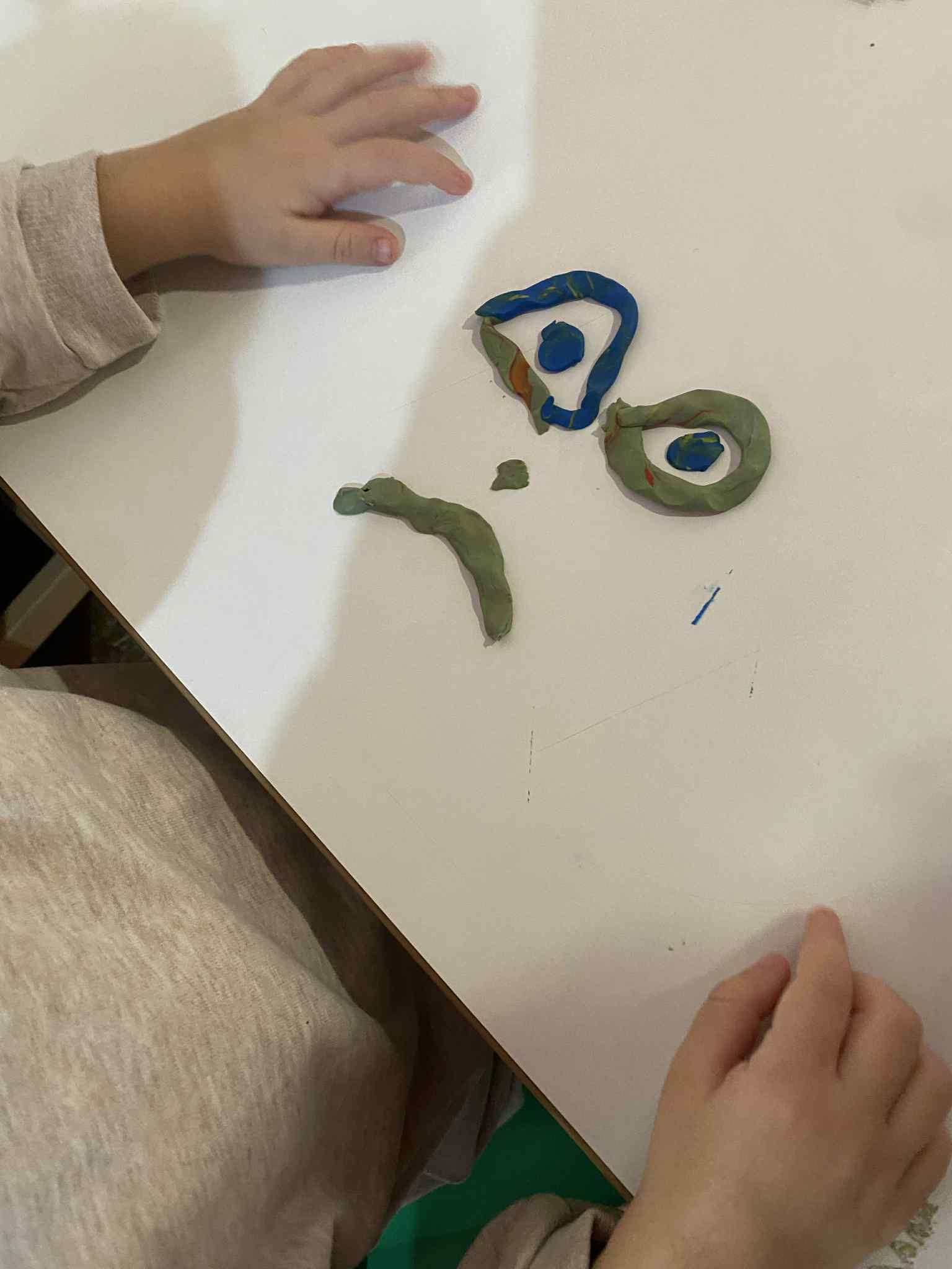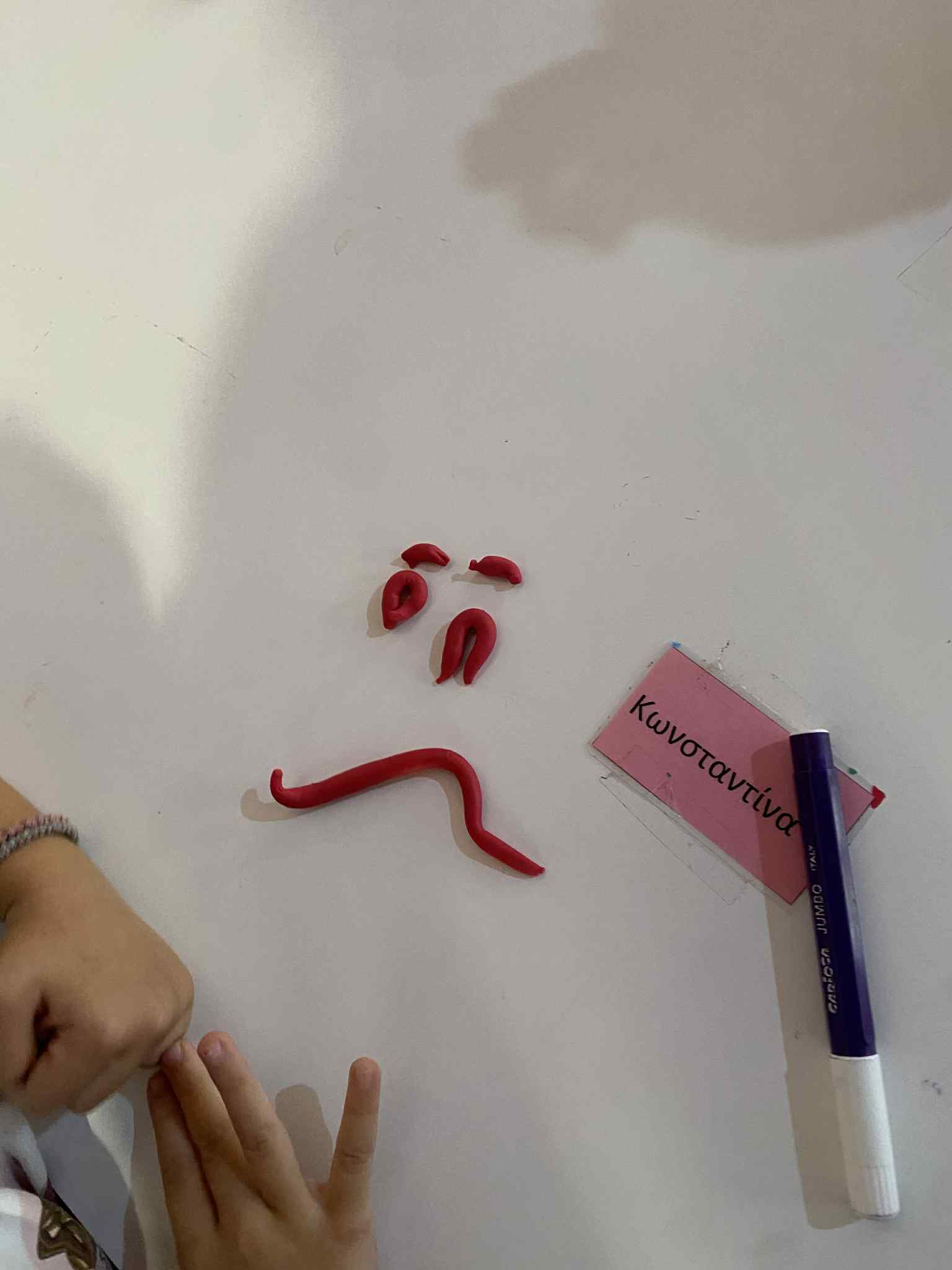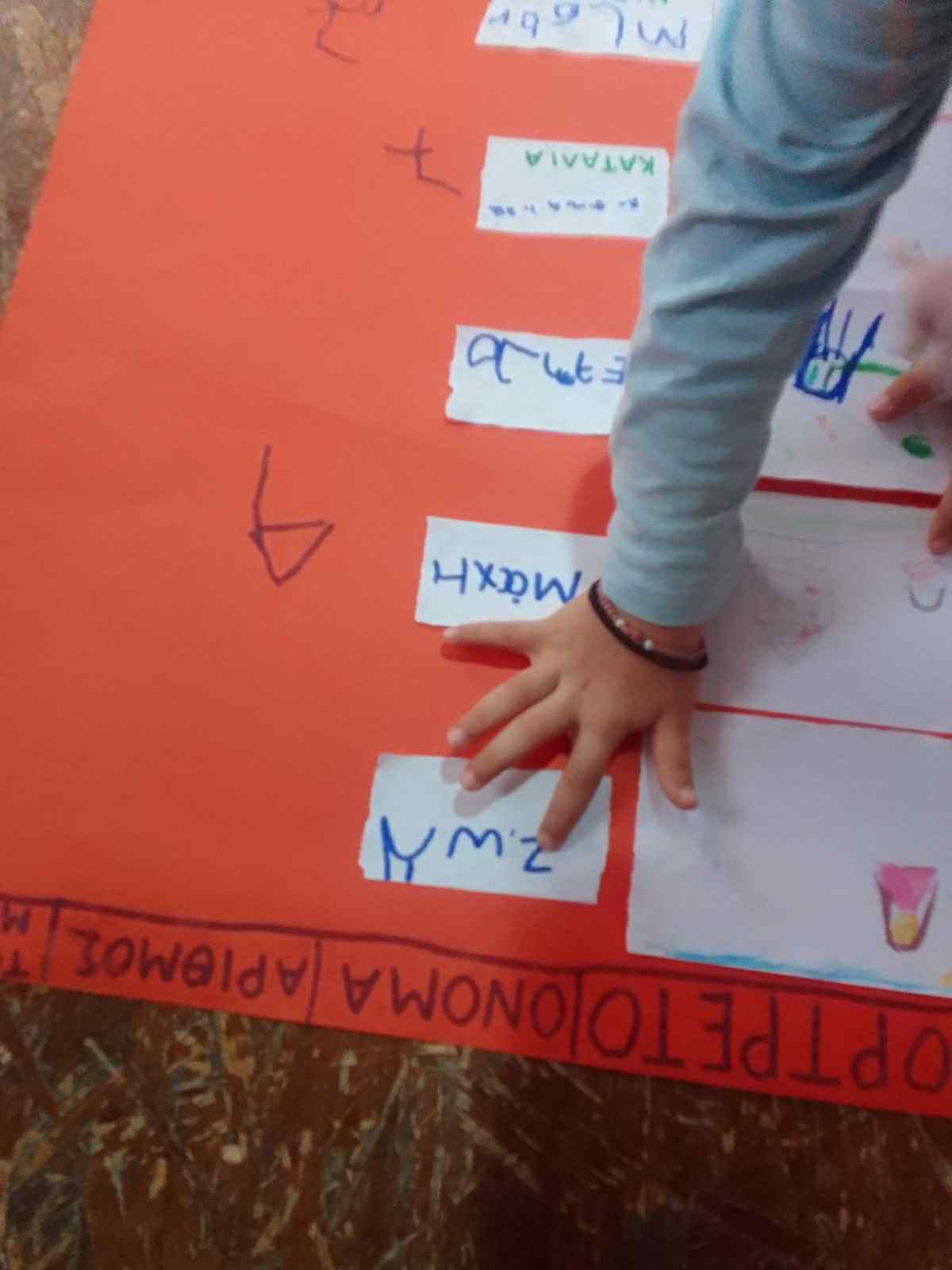 Με αφορμή τη θεματική της ελιάς, μάθαμε και τη φωνούλα Ε, ε και όσες λέξεις αρχίζουν από αυτήν τη φωνούλα. Για την καλύτερη κατανόηση της φωνής Ε, ε, τα παιδιά περπάτησαν το γράμμα, το σχεδίασαν με τον μαρκαδόρο τους και πλέον το αναγνωρίζουν και το γράφουν.
