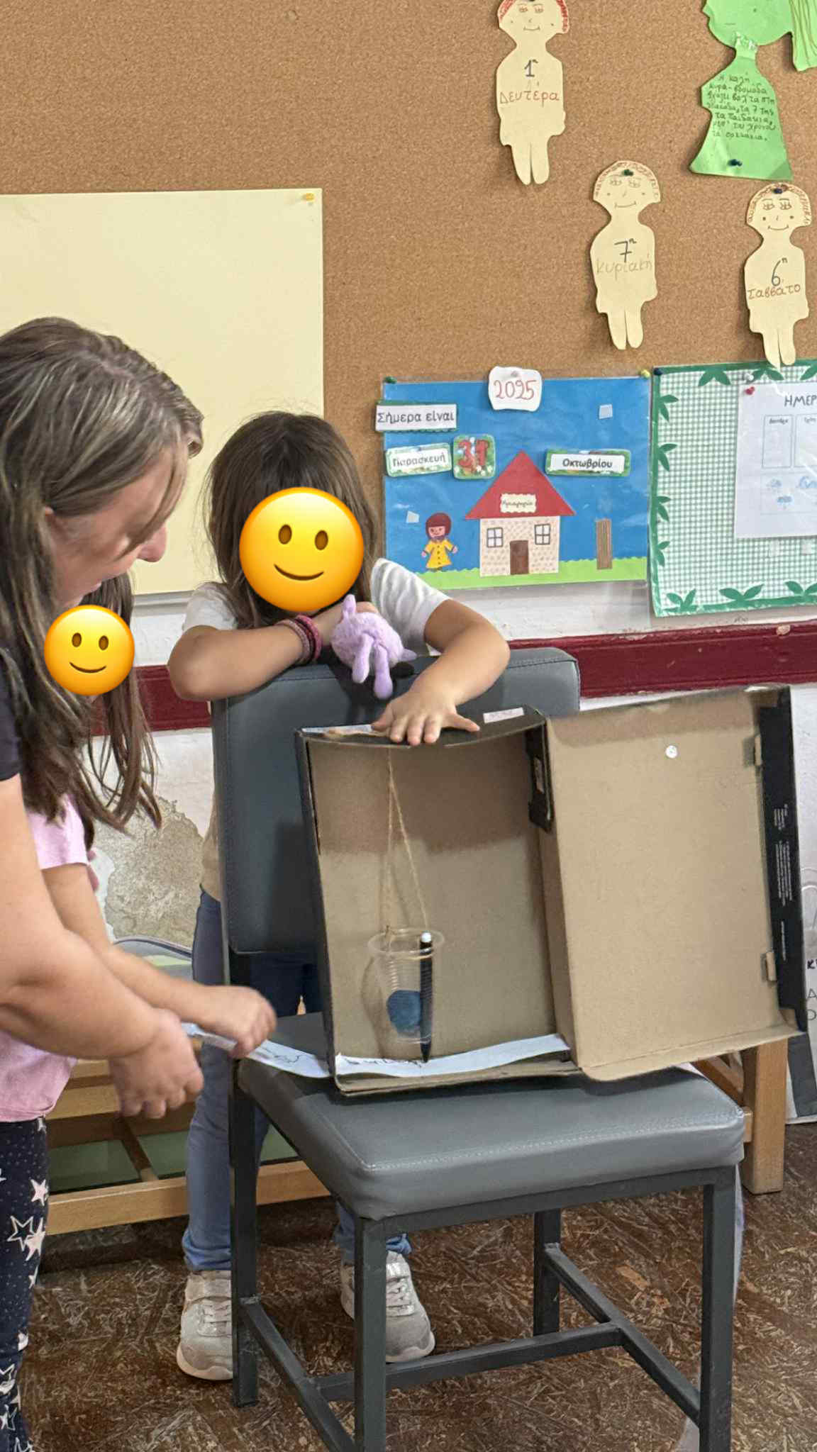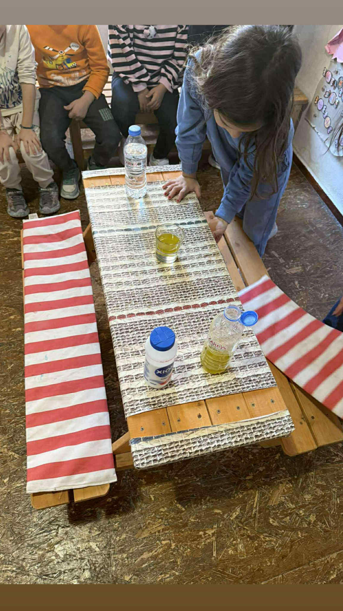 Οι δραστηριότητες προχώρησαν με ένα πείραμα μέσα από το οποίο τα παιδιά αναρωτήθηκαν, υπέθεσαν και τελικά κατανόησαν. Το πείραμα είχε να κάνει με την έννοια της πυκνότητας. Τα παιδιά, αφού αναγνώρισαν τα υλικά που θα χρησιμοποιούσαμε στο πείραμα (λάδι – νερό), παρατήρησαν ότι το νερό δεν αναμιγνύεται με το λάδι αλλά διαχωρίζεται από αυτό.