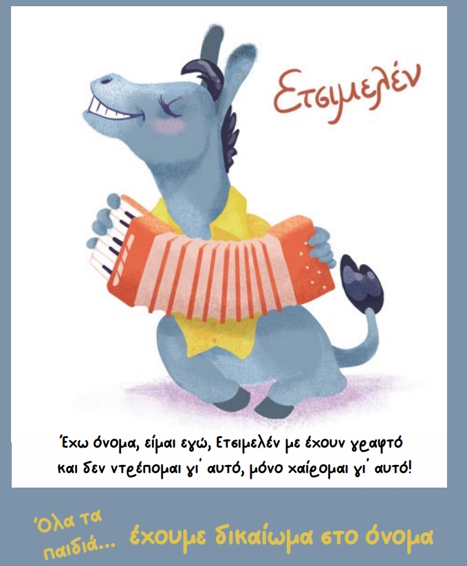 Η “Ειρήνη” παρουσιάζει στα παιδιά τον φίλο της που τον λένε: “Ετσιμελέν”, ένα μικρό γαϊδουράκι που παρουσιάζει στα παιδιά ποιες είναι οι επιθυμίες του και ποιες οι ανάγκες του… Τα παιδιά συνθέτουν ομαδική εργασία με τα αγαπημένα τους ζωάκια… –Μαθαίνουν τι είναι το «δικαίωμα στο όνομα και στην ταυτότητα». Τα στοιχεία κάθε παιδιού, όπως το όνομά του, των γονιών του, της χώρας του, γράφονται σε ένα βιβλίο που υπάρχει στον δήμο του, σε ένα γραφείο που λέγεται «ληξιαρχείο».