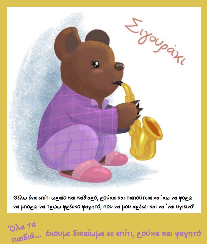 α παιδιά, ακούγοντας και το ηχογραφημένο υλικό. Υπάρχει επίσης χώρος για να αναγράφεται η απόφαση που λαμβάνεται στη συνέλευση της τάξης σε σχέση με το δικαίωμα αυτό. Στην πίσω σελίδα της καρτέλας υπάρχει μια μικρή ιστορία για το κάθε ζώο, που νοηματοδοτεί το δικαίωμα – διατίθεται και ηχογραφημένη μαζί με το αντίστοιχο τραγούδι.