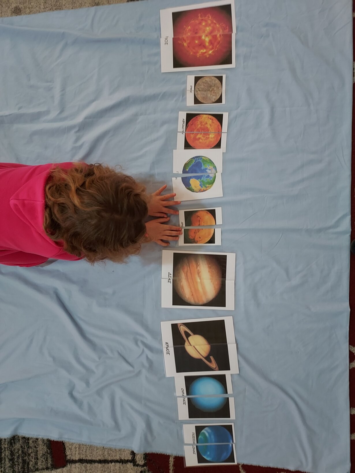 Παιχνίδι περπατάμε στο χώρο όσο ακούγεται η μουσική μόλις σταματήσει σηκώνουμε μια κάρτα από το χαλί αναγνωρίζουμε τον πλανήτη που κρύβει και κάνουμε ζευγάρια βρίσκοντας ποιο παιδάκι κρατάει την κάρτα με τον ίδιο πλανήτη