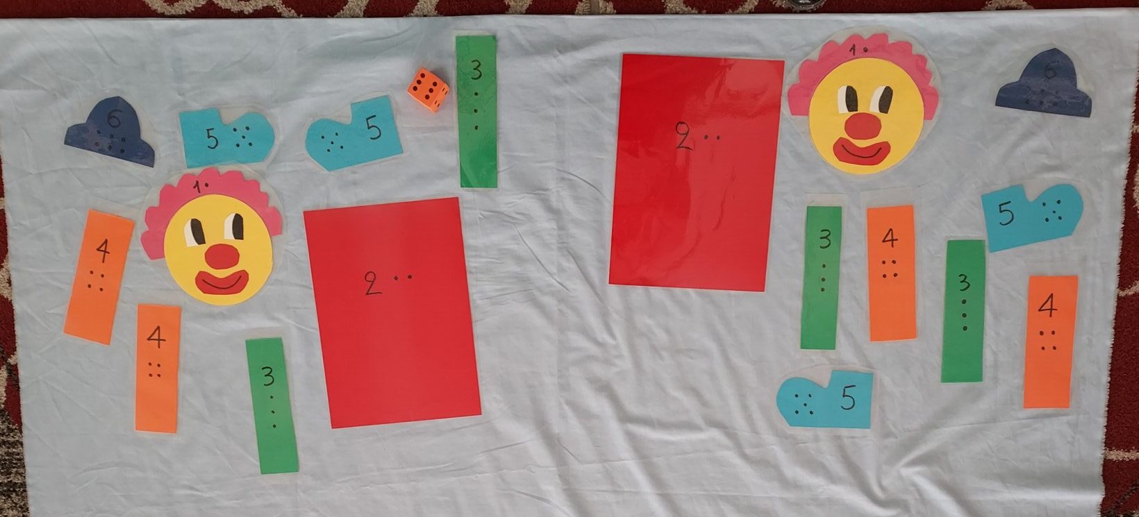 Σε 2 ομάδες Ποια ομάδα θα φτιάξει πρώτη τον κλόουν βάζοντας το κομμάτι ανάλογα με τον αριθμό που δείχνει το ζάρι