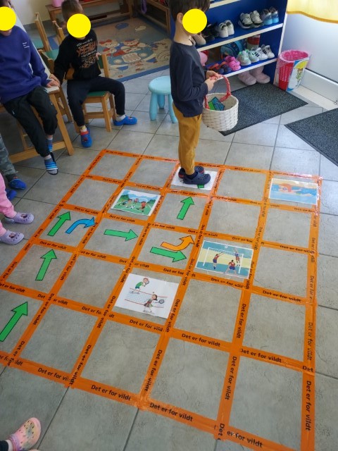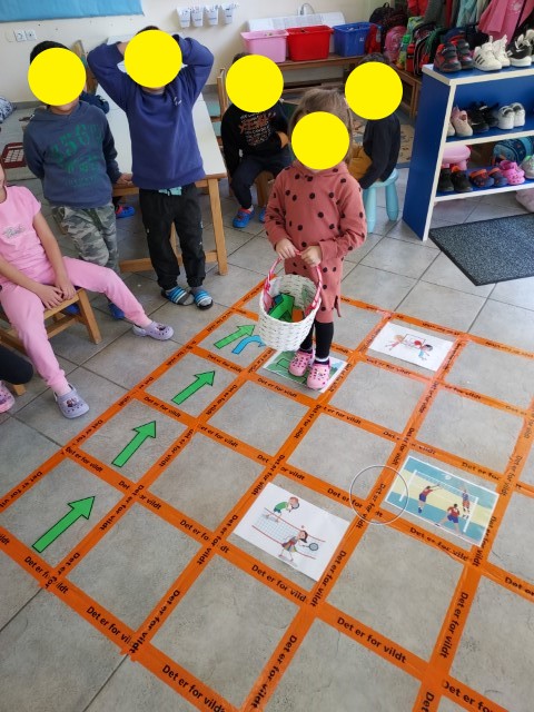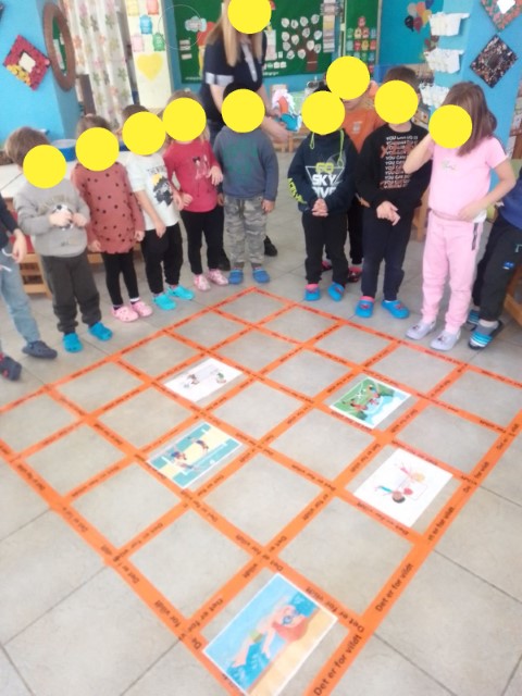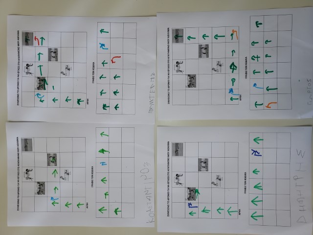 Με αφορμή την πρόσφατη ενασχόληση μας με τα αγαπημένα μας αθλήματα λόγω της Ημέρας σχολικού αθλητισμού, παίξαμε παιχνίδι όπου σε πλέγμα 5χ5 τοποθετήσαμε εικόνες με κάποια αθλήματα, ένα παιδί παρίστανε το ρομπότ κι ένα άλλο τον προγραμματιστή ο οποίος το κατεύθυνε με εντολές (πχ 2 βήματα μπροστά, στροφή δεξιά ή αριστερά κλπ)ώστε το ρομπότ να φτάσει στο τετράγωνο με το αγαπημένο άθλημα του προγραμματιστή. Συγχρόνως στο κάθε βήμα το ρομπότ αφηνε και το ανάλογο βέλος σημειώνωντας έτσι τη διαδρομή του. Στο τέλος όλοι μαζί μετρούσαμε τα συνολικά βήματα της διαδρομής.