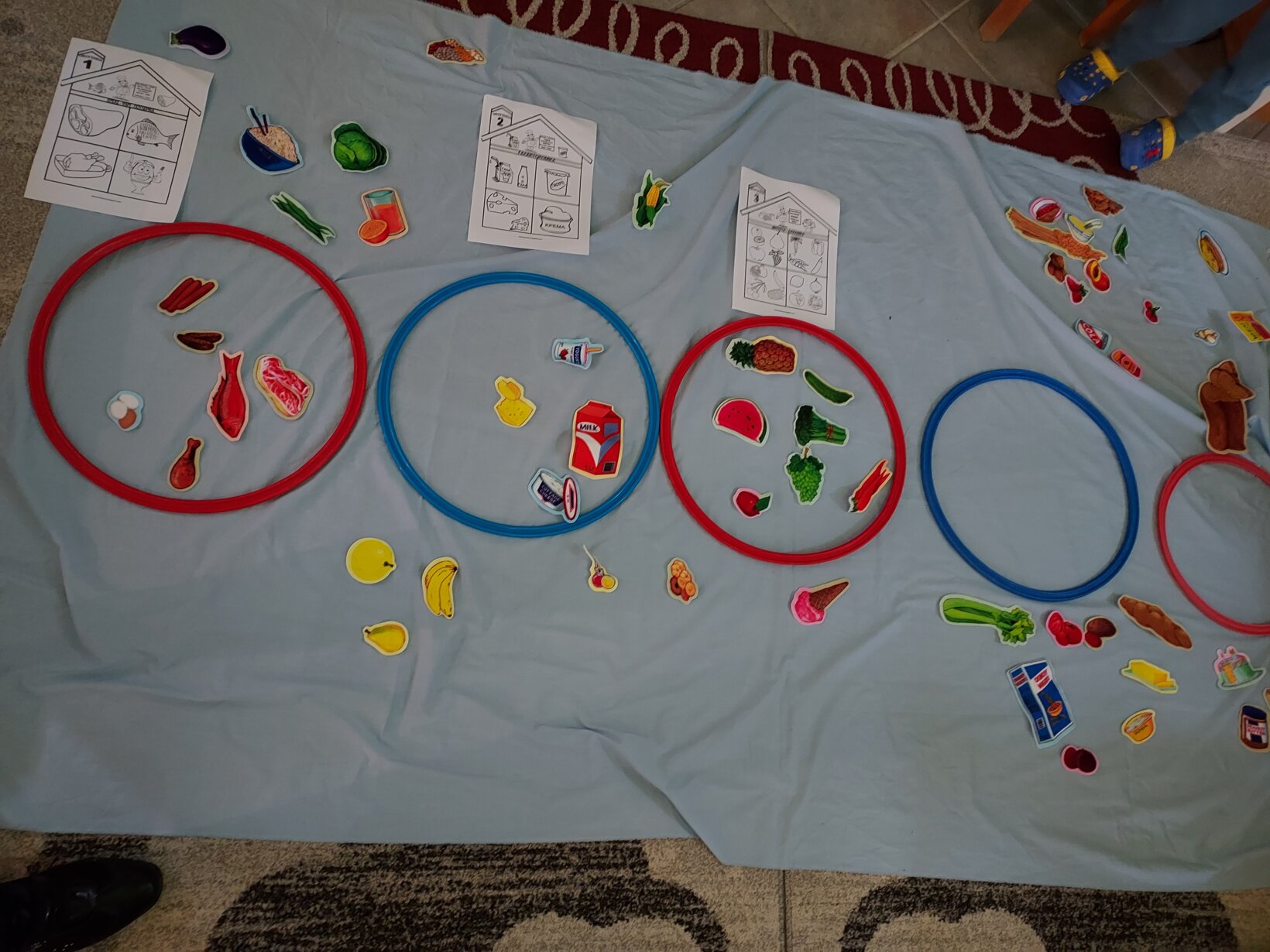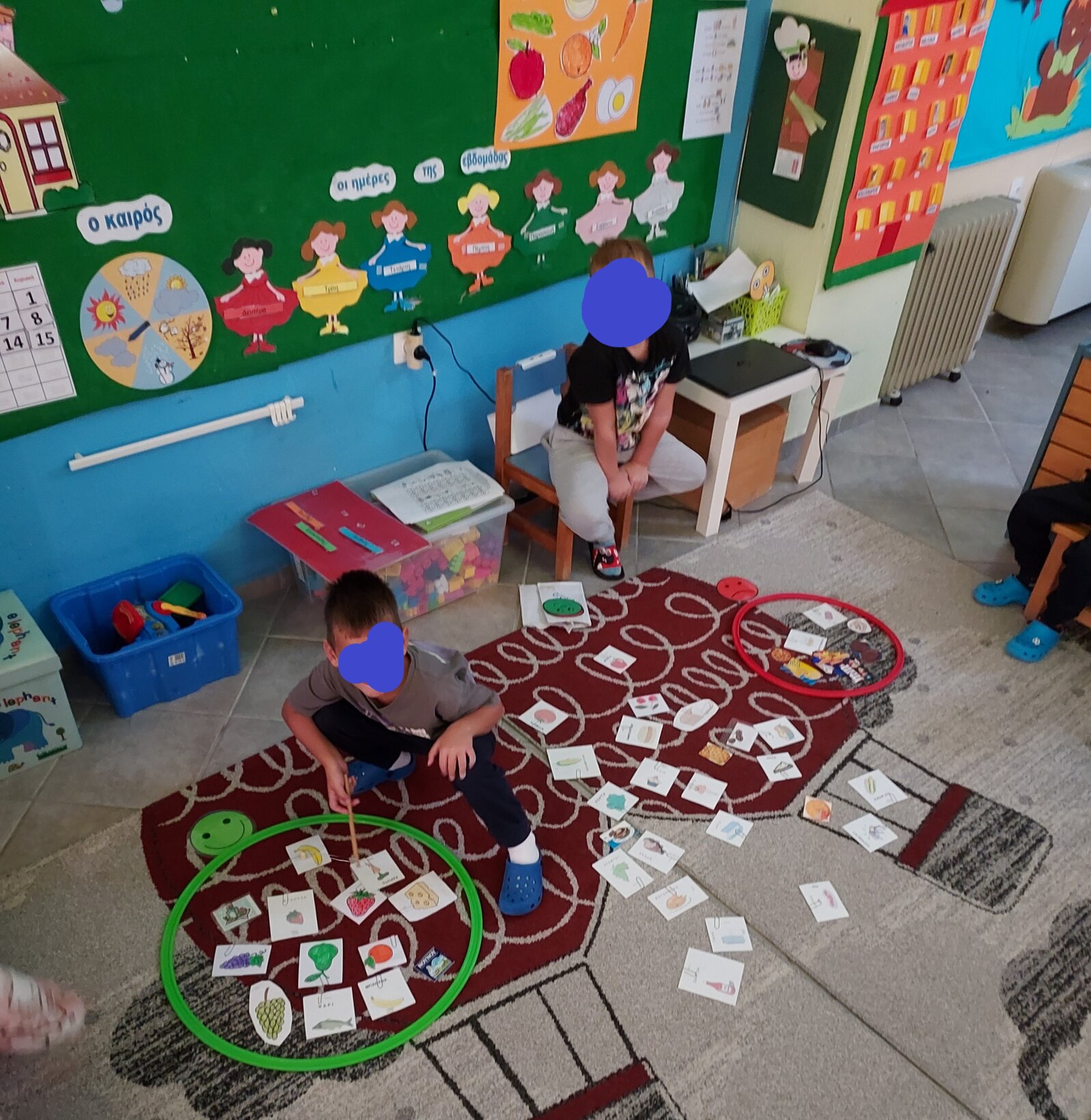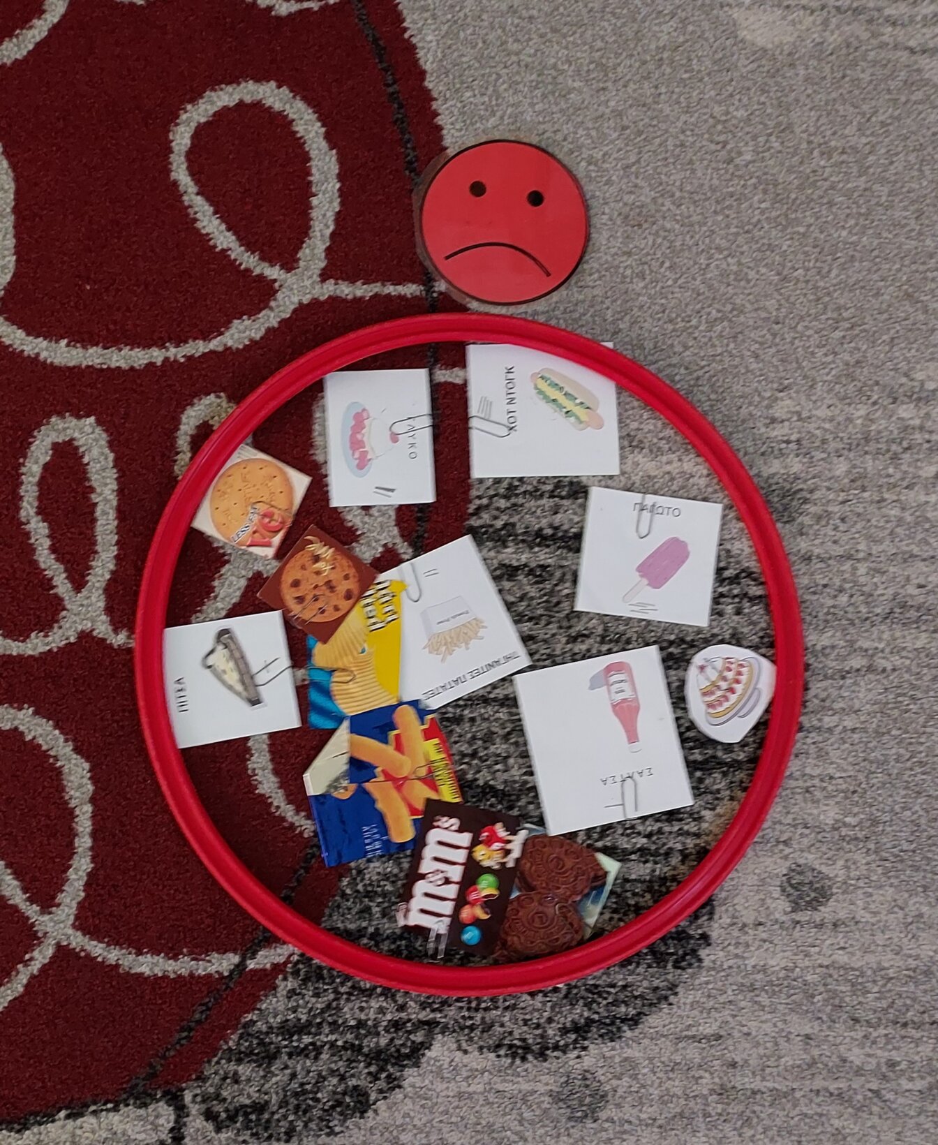Παίξαμε το ακόλουθο παιχνίδι κάθε παιδί ψάρευε με μαγνητικό καλάμι εικόνες τροφών και τις τοποθετούσε ανάλογα σε κόκκινο στεφάνι αν ήταν ανθυγιεινές και στο πράσινο αν ήταν υγιεινές