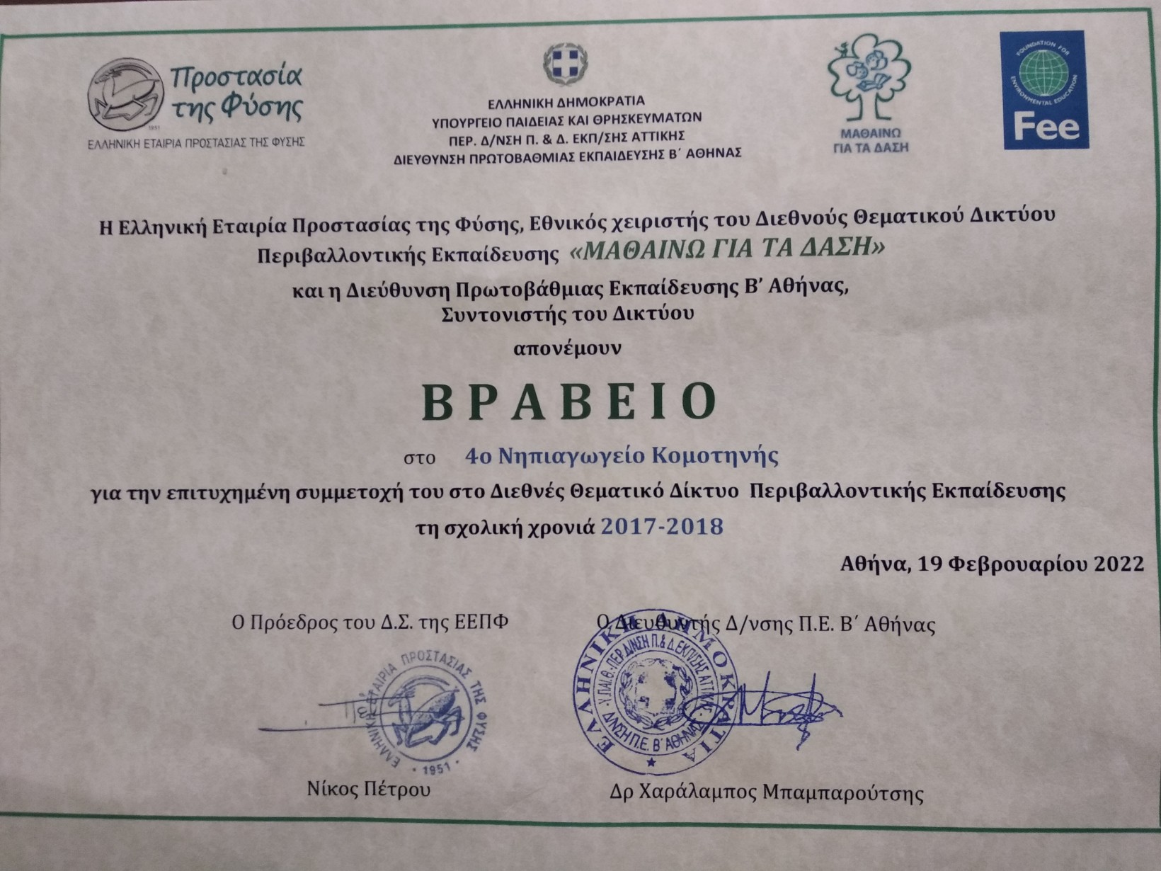 Η Ελληνική Εταιρία Προστασίας της Φύσης βράβευσε τους μαθητές του 4ου Νηπιαγωγείου Κομοτηνής και την νηπιαγωγό Άννα Επισκέπτου για την υλοποίηση του προγράμματος «Μαθαίνω για τα δάση» κατά τη σχολική χρονιά 2017-18. Η τελετή βράβευσης που θα γινόταν δια ζώσης στην Αθήνα αναβλήθηκε δύο φορές λόγω της πανδημίας όποτε και έγινε διαδικτυακά πριν λίγες ημέρες και στάλθηκε το βραβείο στο σχολείο μας.