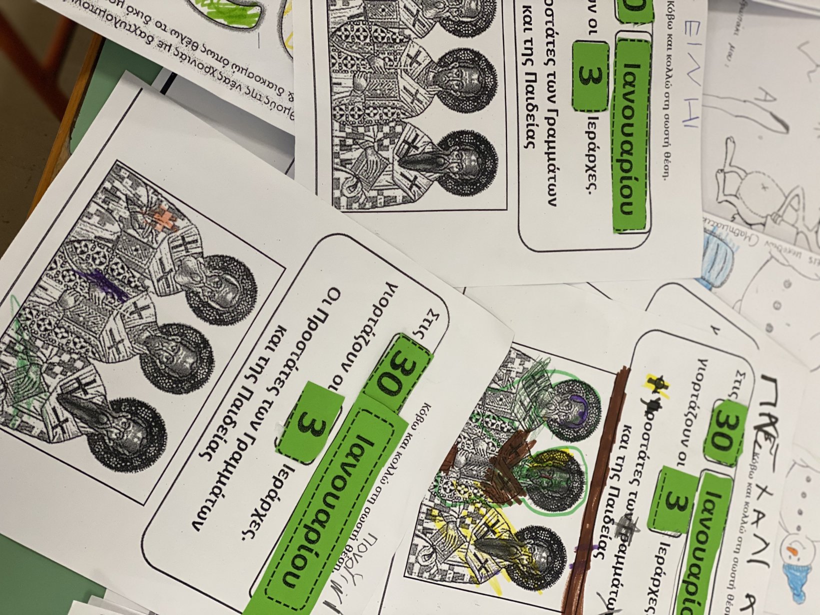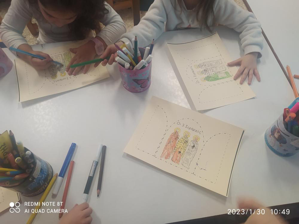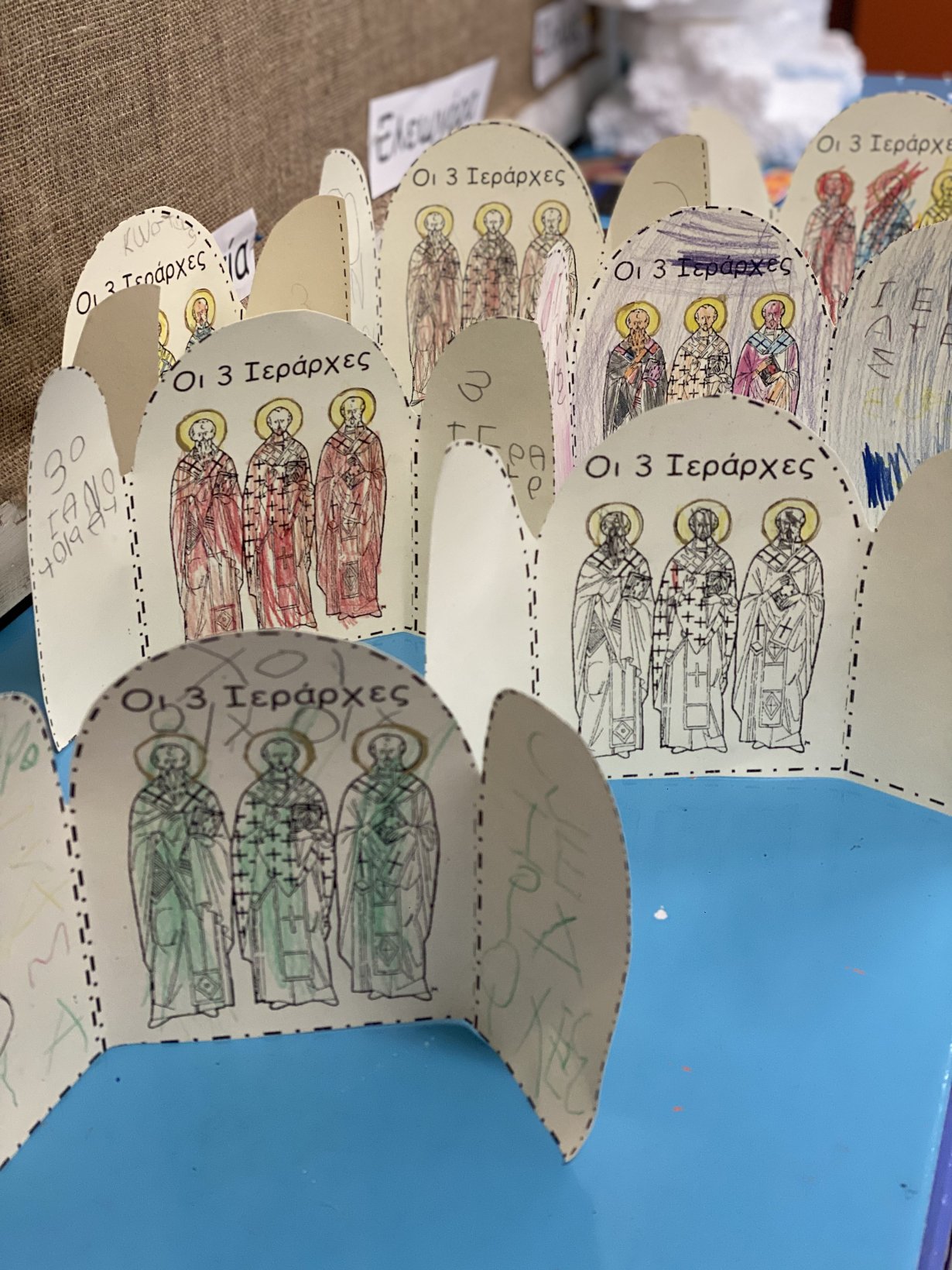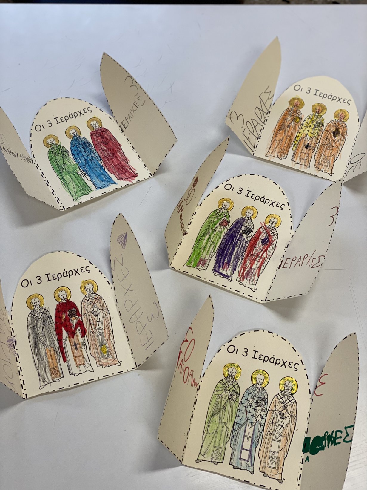Τιμήσαμε τη σημερινή Γιορτή των 3 Ιεραρχών με κατασκευές, εργασίες, παιχνίδια στον διαδραστικό πίνακα, συζήτηση και παρακολούθηση οπτικού υλικού.