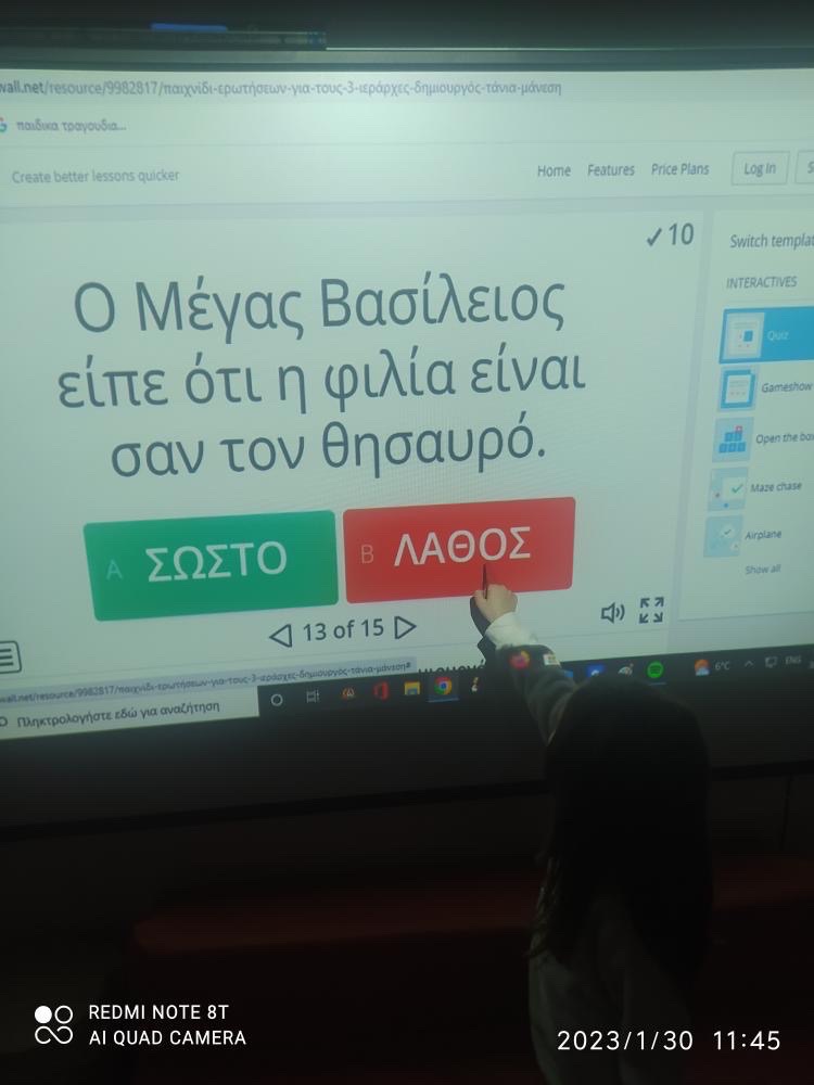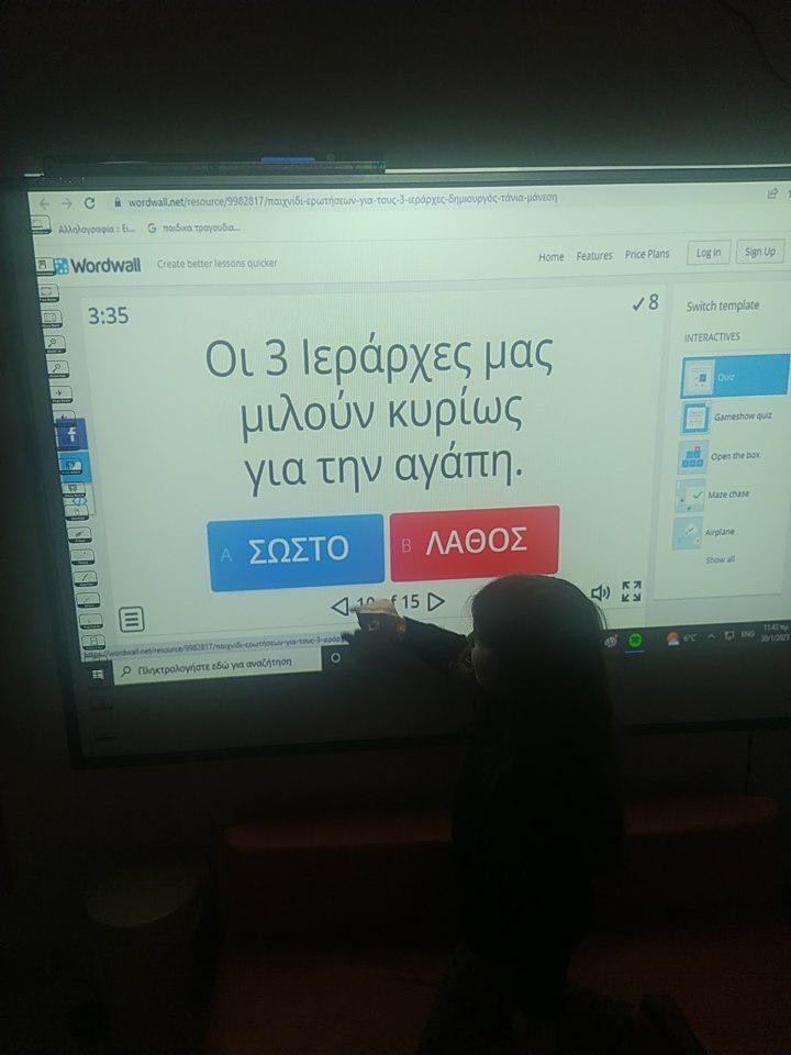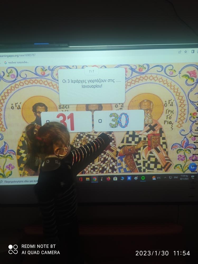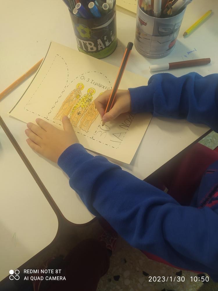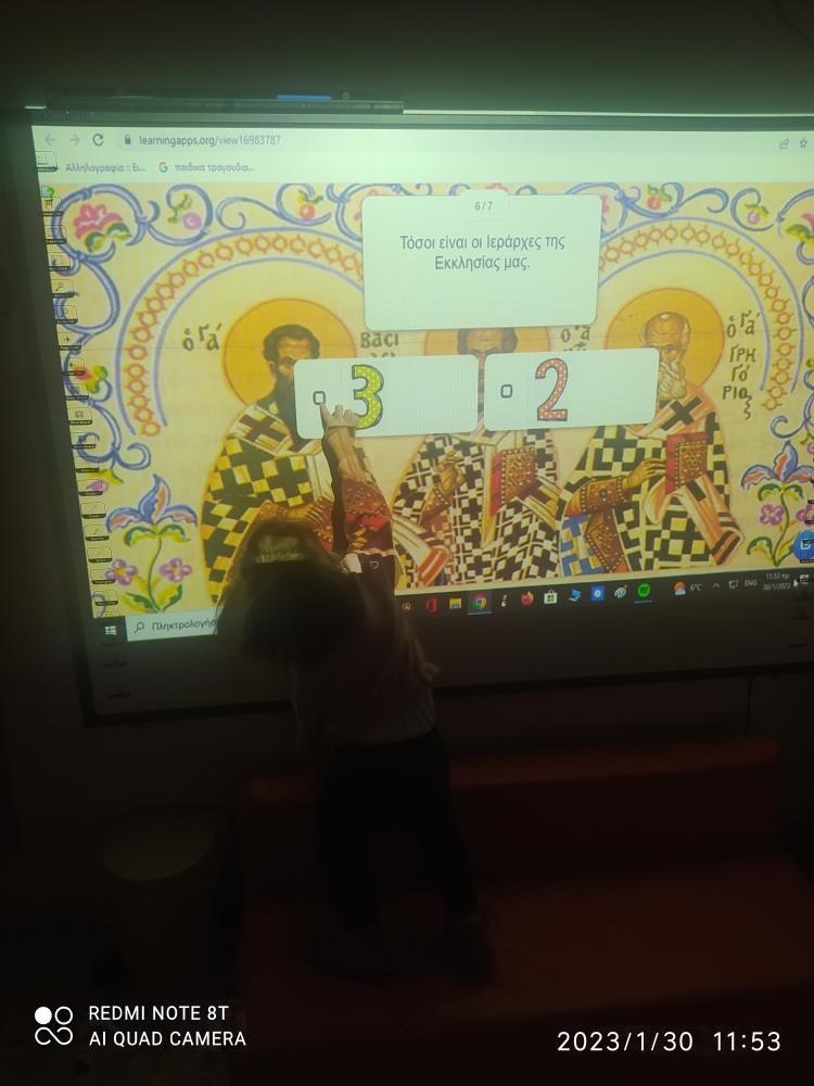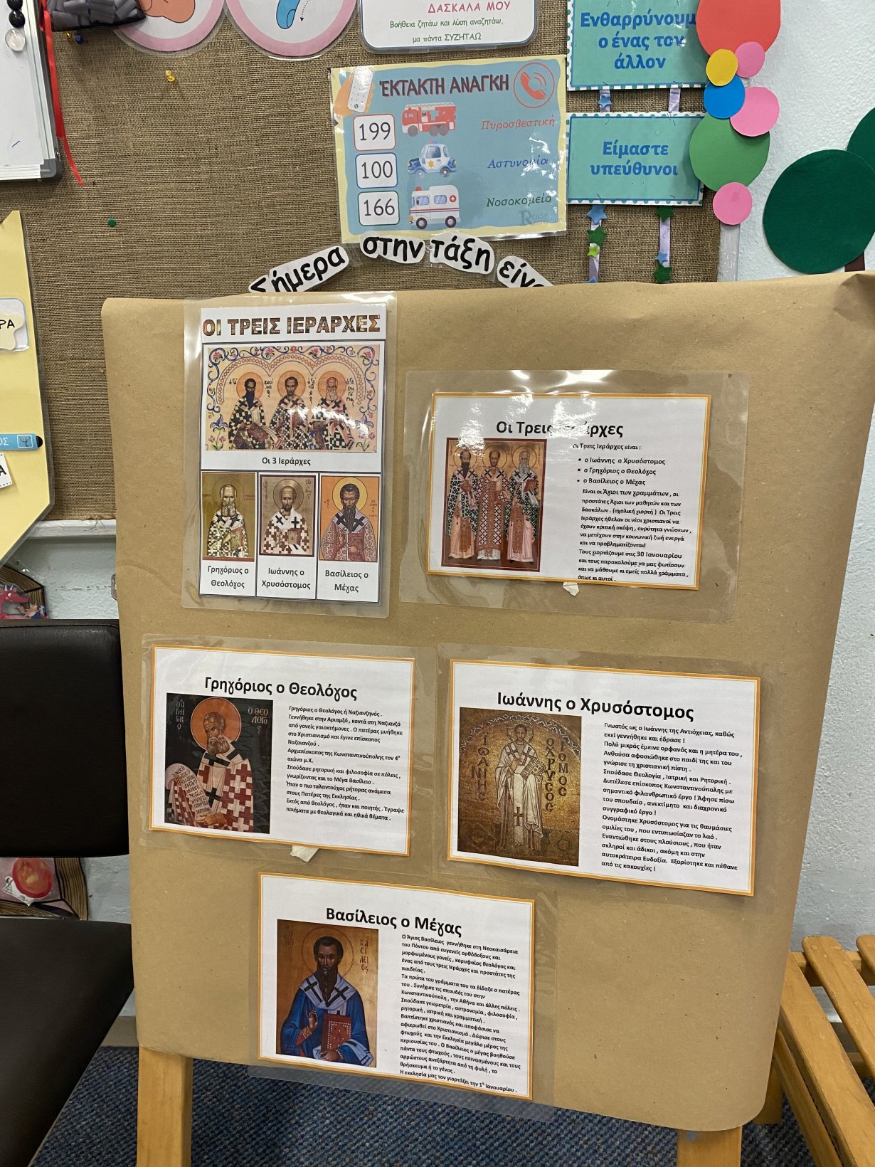 Τιμήσαμε τη σημερινή Γιορτή των 3 Ιεραρχών με κατασκευές, εργασίες, παιχνίδια στον διαδραστικό πίνακα, συζήτηση και παρακολούθηση οπτικού υλικού.