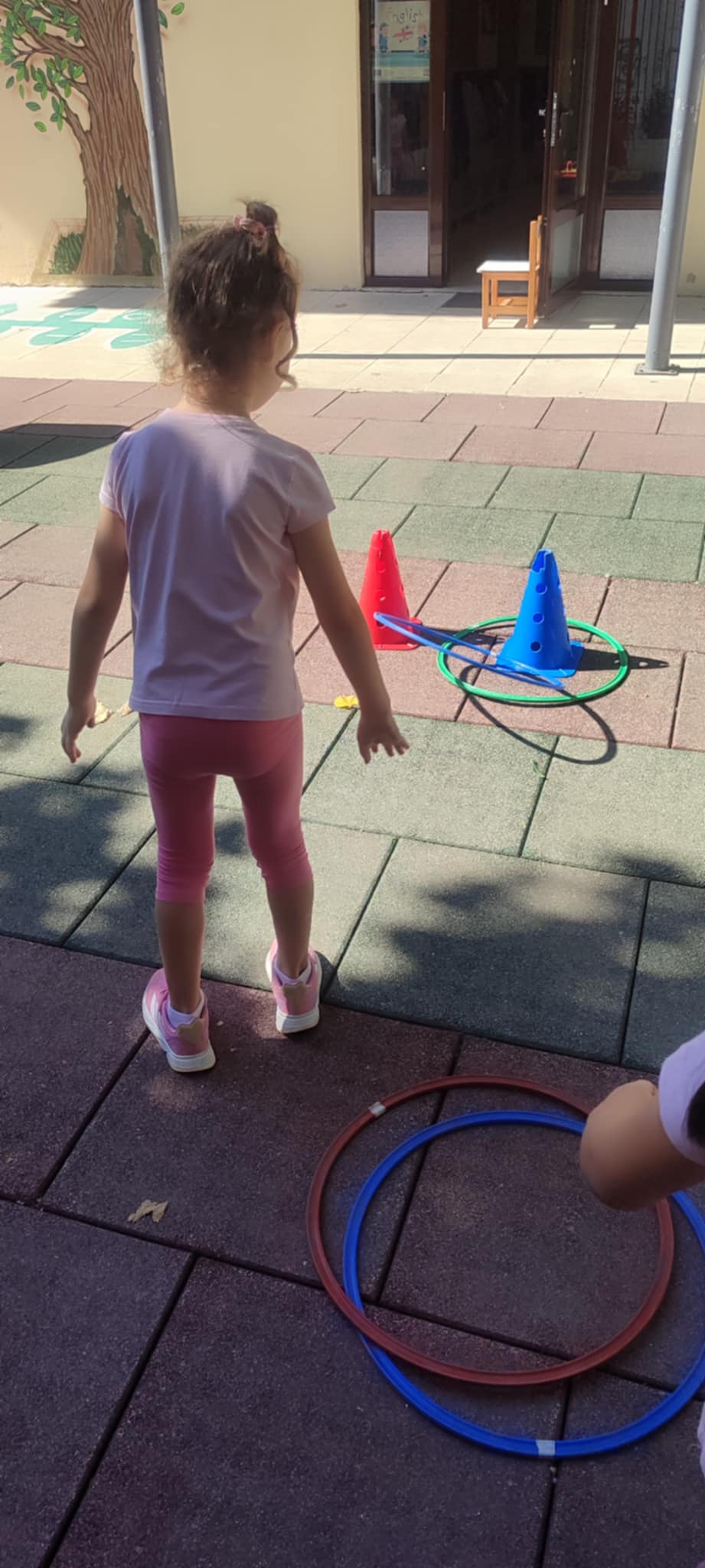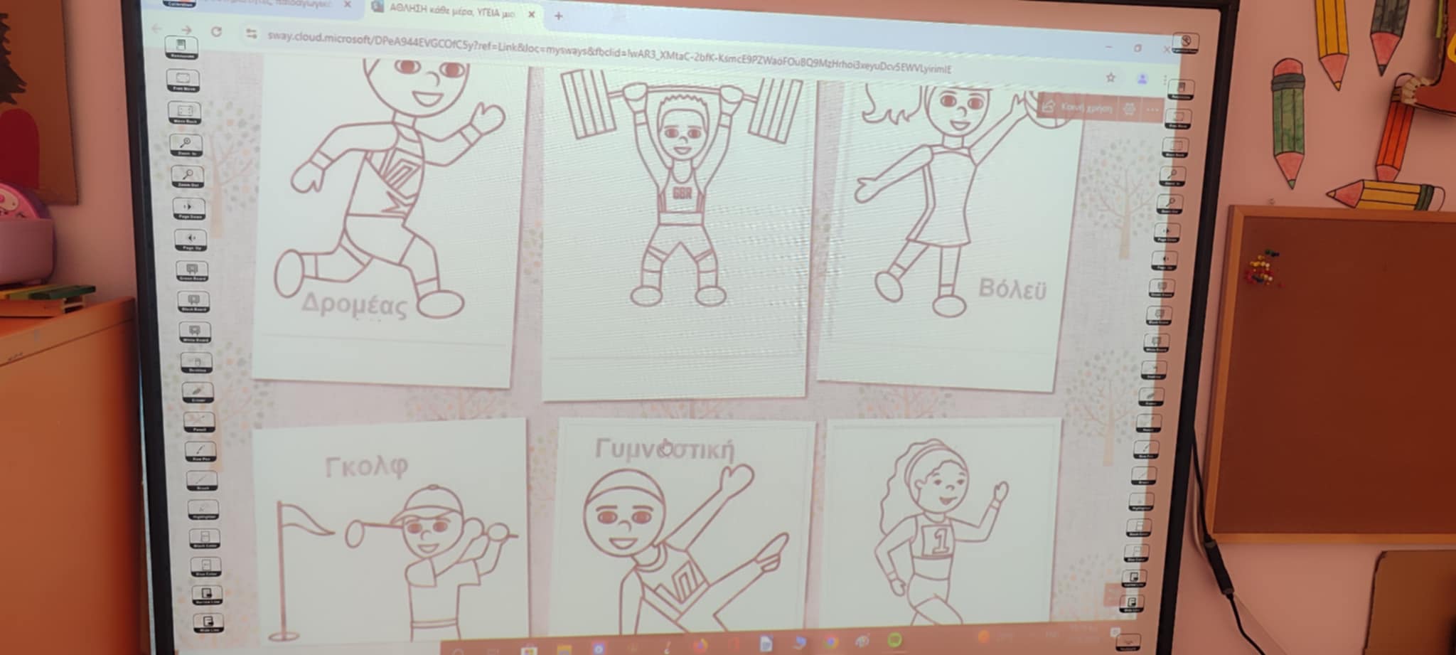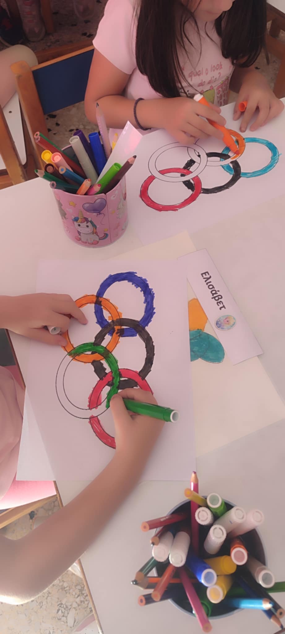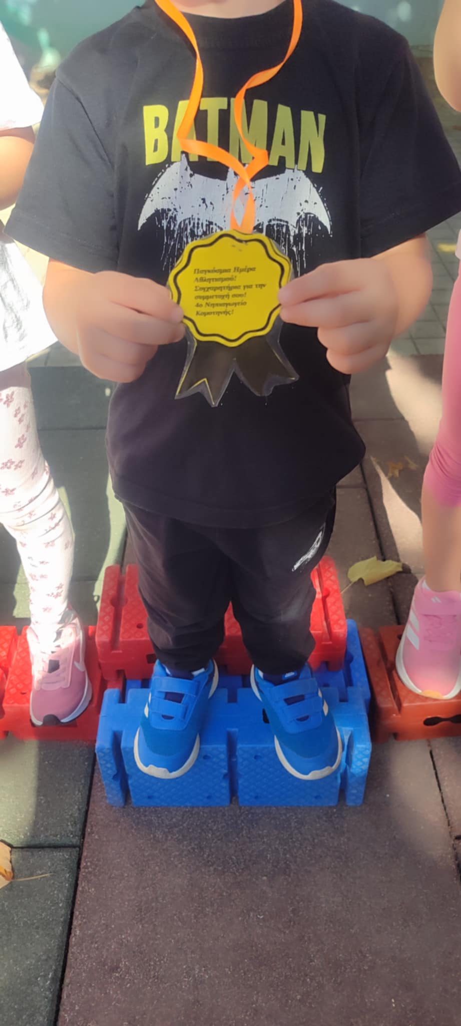 Στα πλαίσια της Παγκόσμιας Ημέρας Αθλητισμού μιλήσαμε αρχικά με τα παιδιά για τα οφέλη της άσκησης στον οργανισμό μας. Αναφέραμε τα αθλήματα που γνωρίζουμε και είδαμε εικόνες και από αθλήματα που αγωνιζόταν οι αθλητές παλιά στους Ολυμπιακούς Αγώνες και δεν υπάρχουν πλέον. Μάθαμε το σύμβολο των Ολυμπιακών Αγώνων και το ζωγραφίσαμε. Στην συνέχεια βγήκαμε στην αυλή για να παίξουμε τα αυτοσχέδια παιχνίδια που είχαμε ετοιμάσει. Φυσικά δεν έλειψαν τα μετάλλια σε όλους τους αθλητές για την προσπάθεια που κατέβαλλαν.
