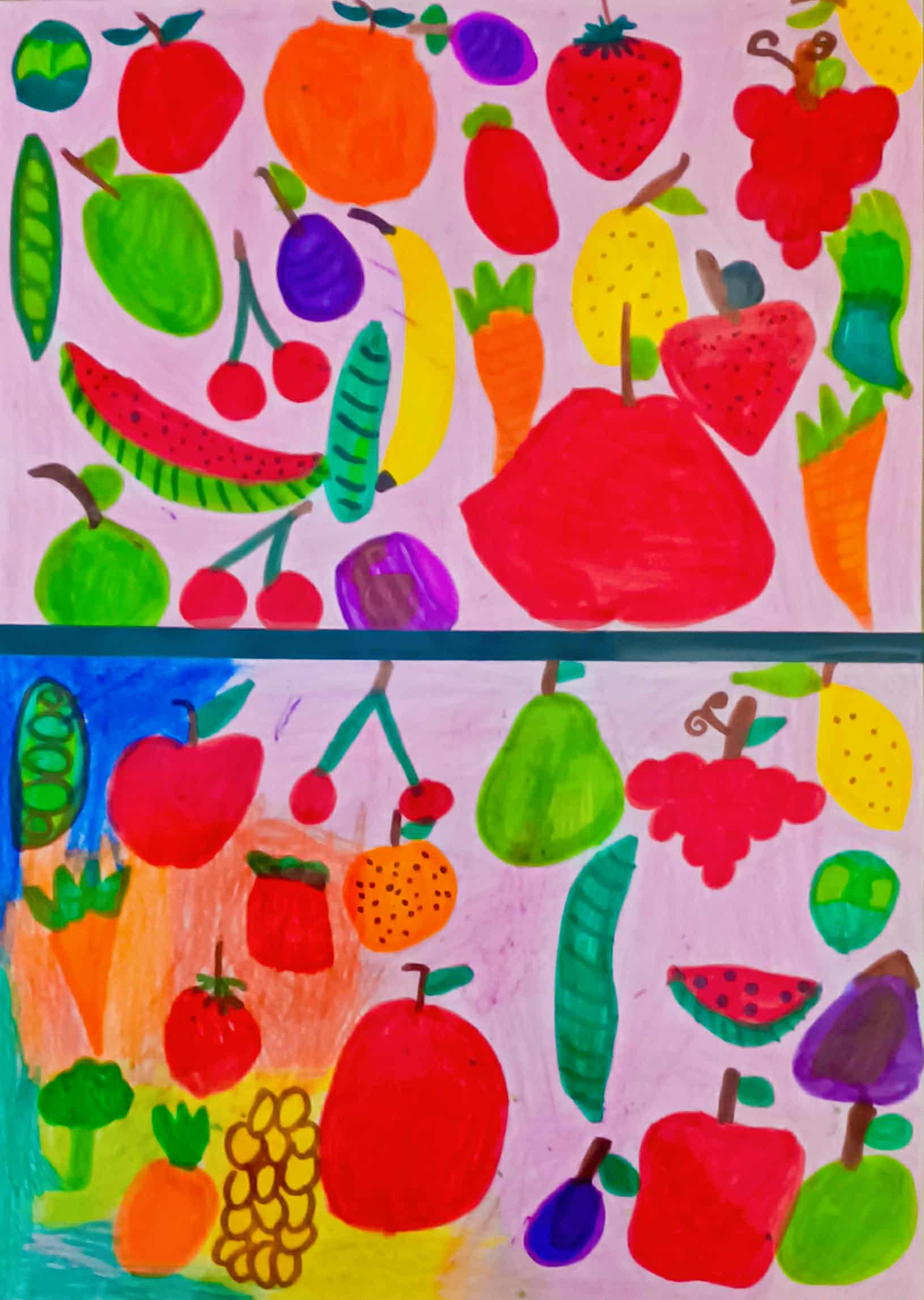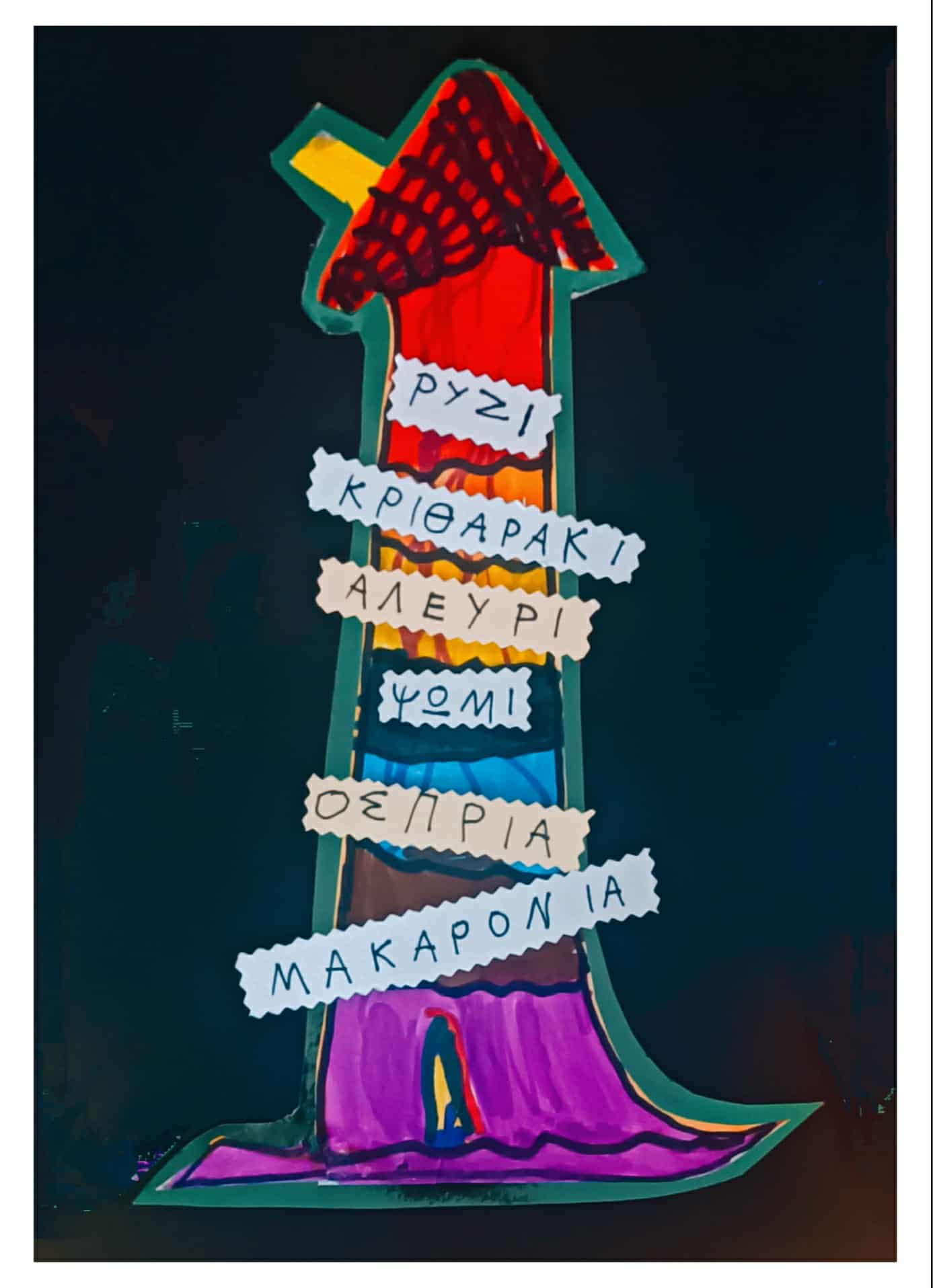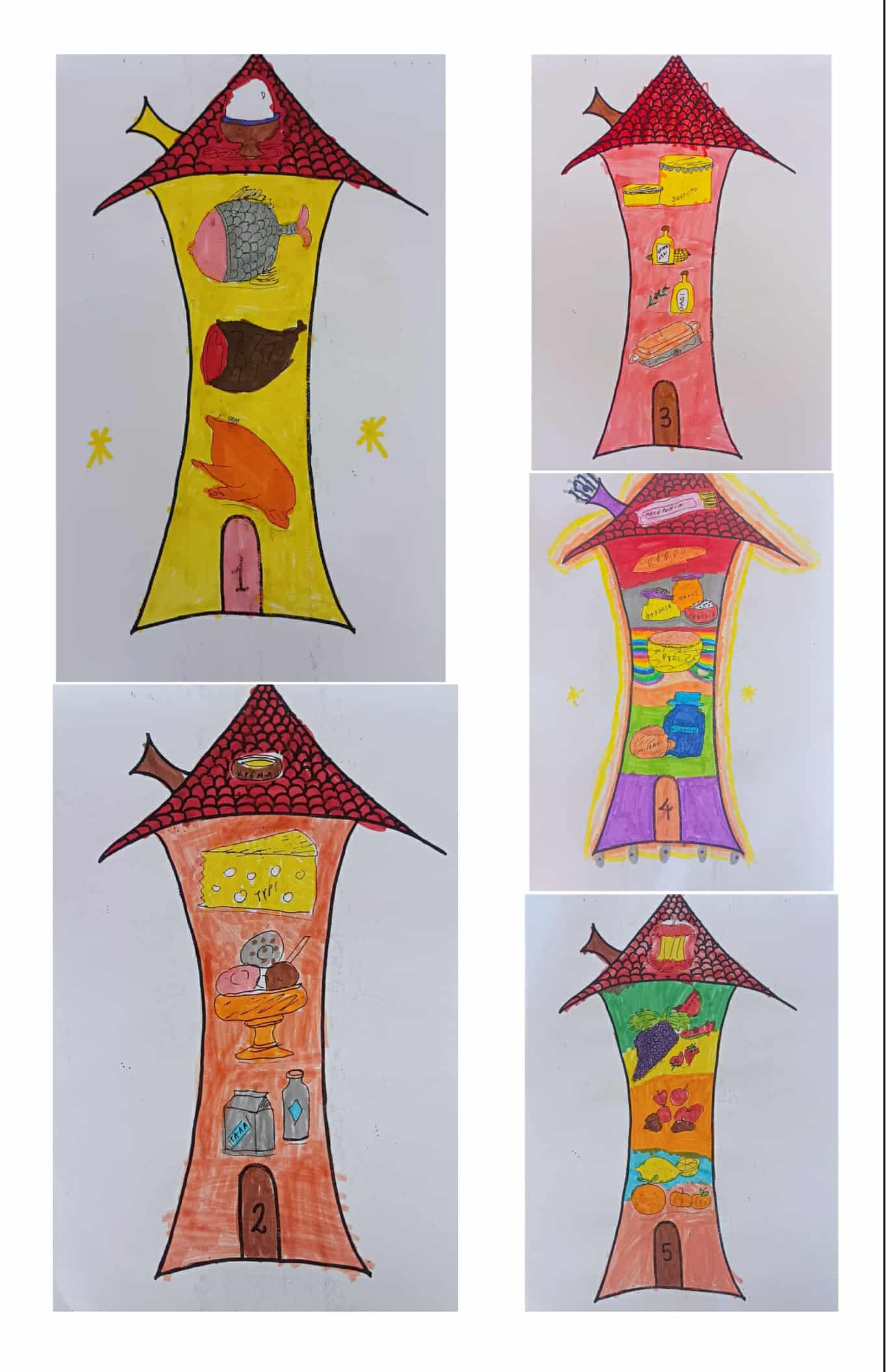 4. Εικαστική απόδοση των ομάδων τροφίμων από τους μαθητές/μαθήτριες. Εμπλουτισμός λεξιλογίου (λειτουργικό λεξιλόγιο, ορολογία γνωστικών αντικειμένων), αντιγραφή λέξεων και κατάταξη αυτών στη σωστή ομάδα.