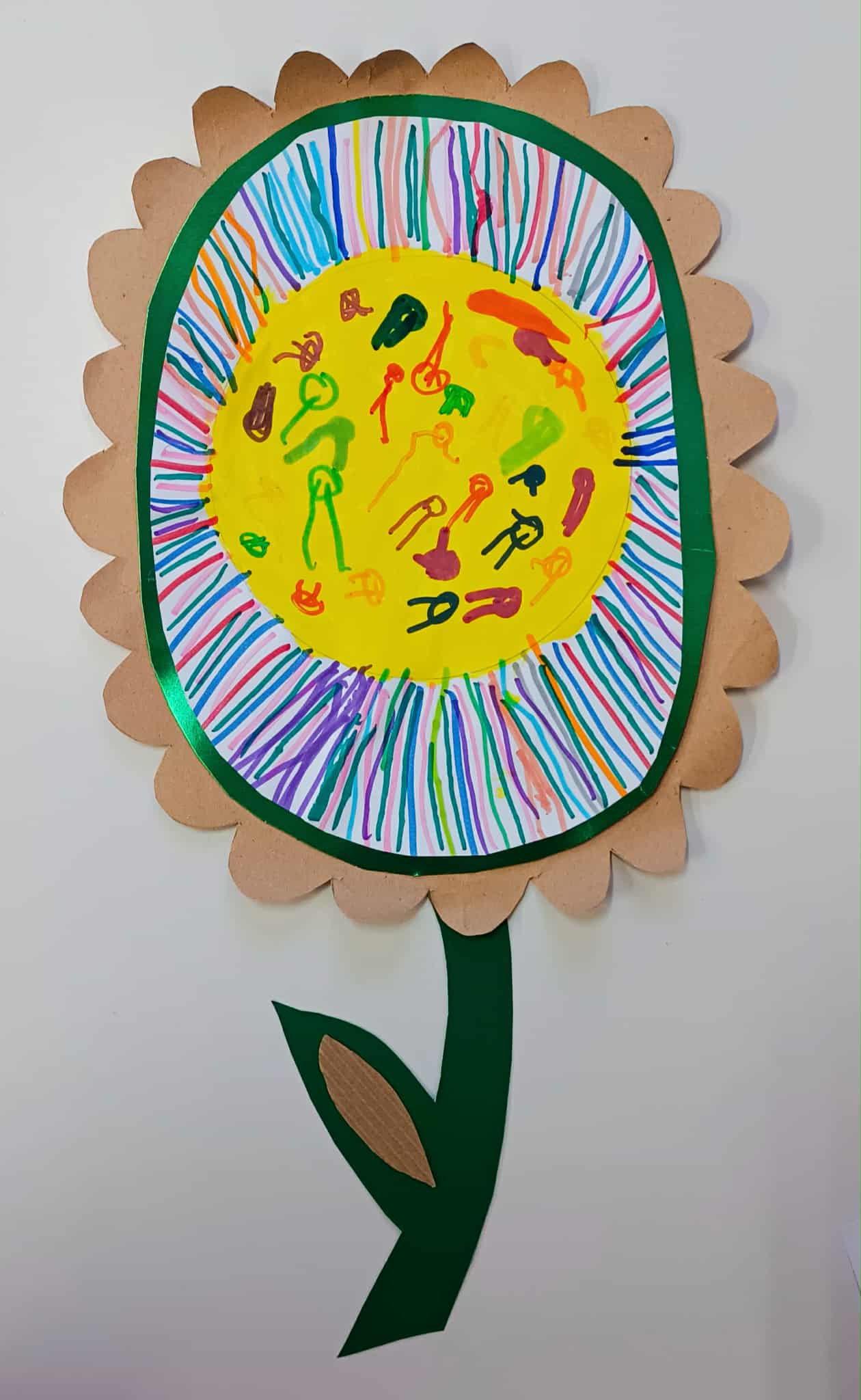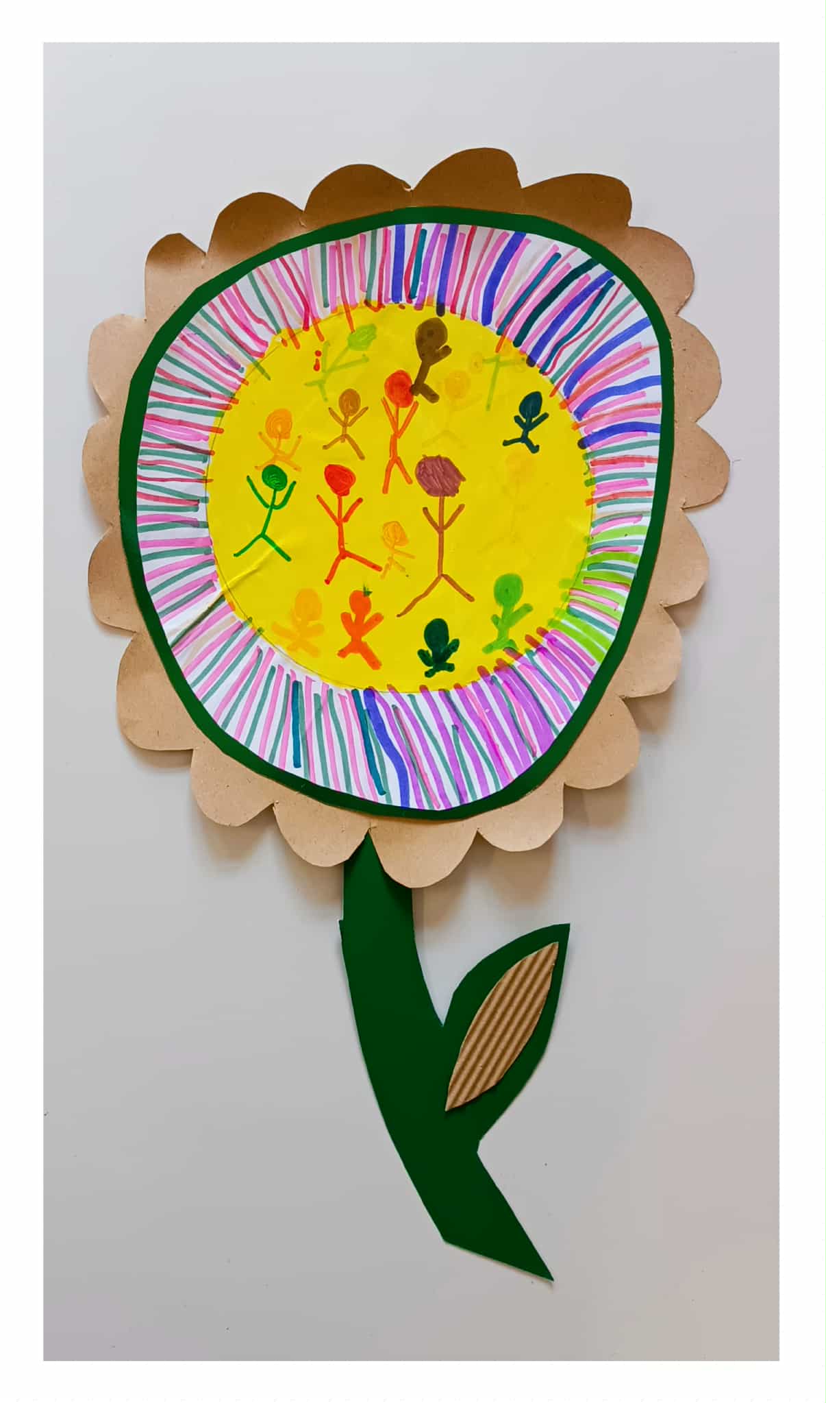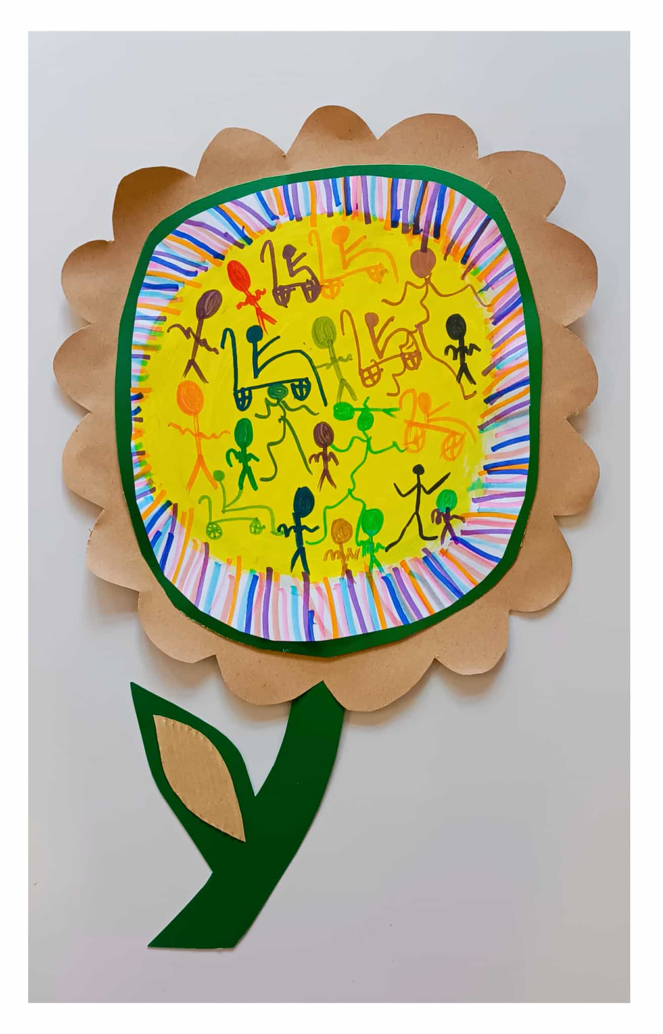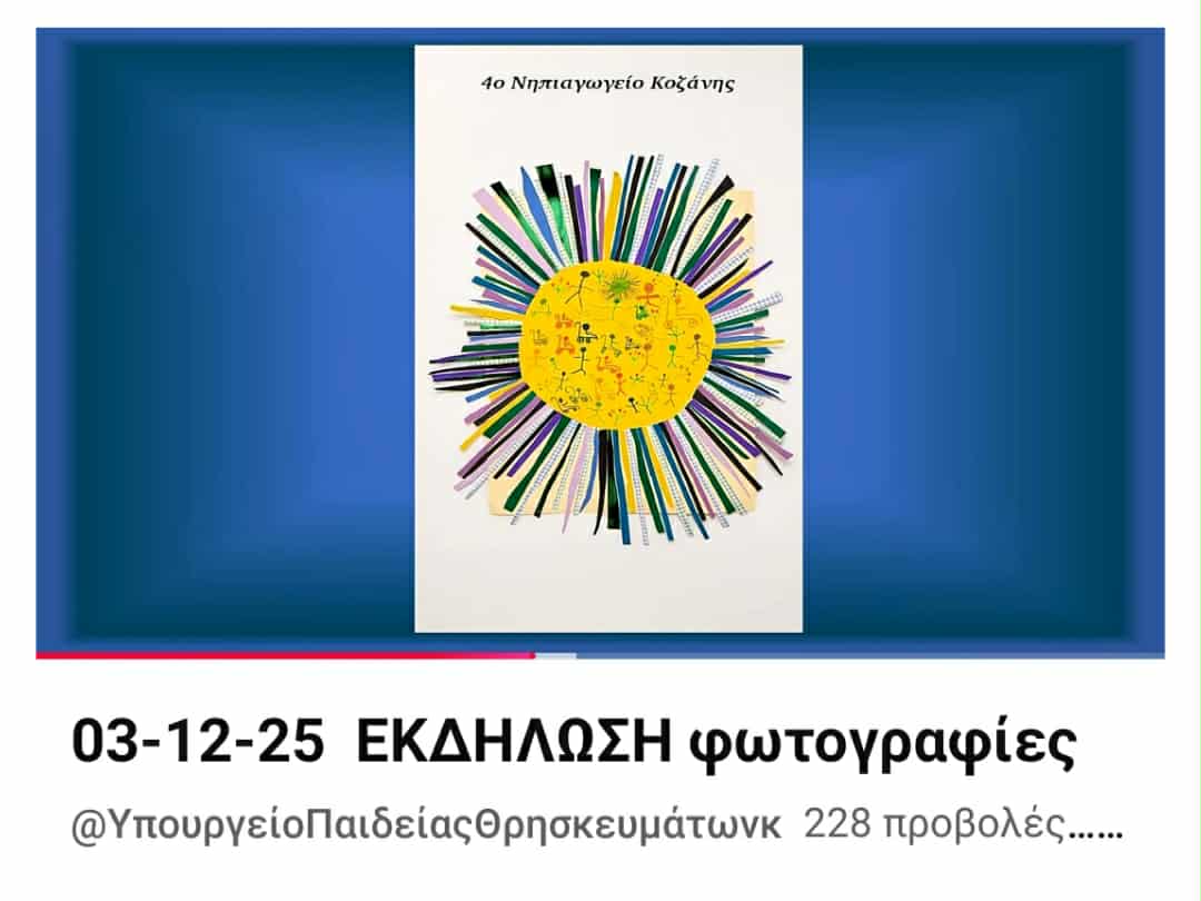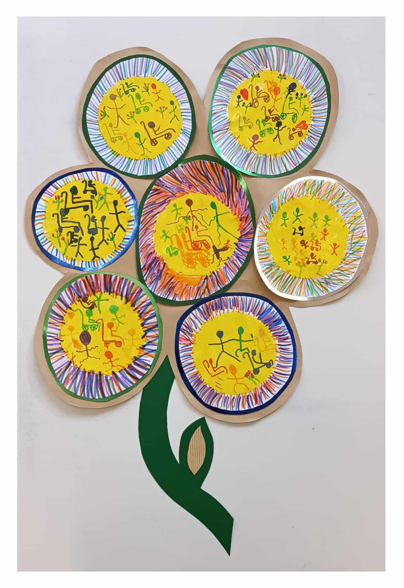 Ορμώμενοι από την εγκύκλιο της 3ης Δεκεμβρίου του ΥΠΑΙΘΑ (αρ. πρωτ.: 126561/ΓΔ4/09-10-2025) με θέμα «Διοργάνωση Εκδηλώσεων & Δράσεων με αφορμή την Παγκόσμια Ημέρα Ατόμων με Αναπηρία», ως 4ο Νηπιαγωγείο Κοζάνης αποστείλαμε μια ομαδο-συνεργατική σύνθεση μεικτής τεχνικής (ζωγραφική με πινέλα & μαρκαδόρους, χαρτοκοπτική, χαρτοκολλητική) εμπνευσμένη -εν μέρει- από τον Πάμπλο Πικάσο. Στο έργο με τίτλο «Χορός στο Φως της Συμπερίληψης» οι μαθητές/-τριες αναπαριστούν έναν ήλιο με ακτίνες ψυχρών χρωμάτων, προκειμένου να αποδώσουν συμβολικά τις στερεοτυπικές αντιλήψεις που ακόμη δεν έχουν εξαλειφθεί. Προσπερνώντας τις ακτίνες, παιδιά που χορεύουν μαζί με παιδιά σε αναπηρικά αμαξίδια οδηγούνται ενωμένα στο φωτοβόλο ηλιακό κέντρο, που αποδίδεται συμβολικά με θερμό κίτρινο χρώμα, κατοπτρίζοντας έτσι το άπλετο φως της αποδοχής και της συμπερίληψης.