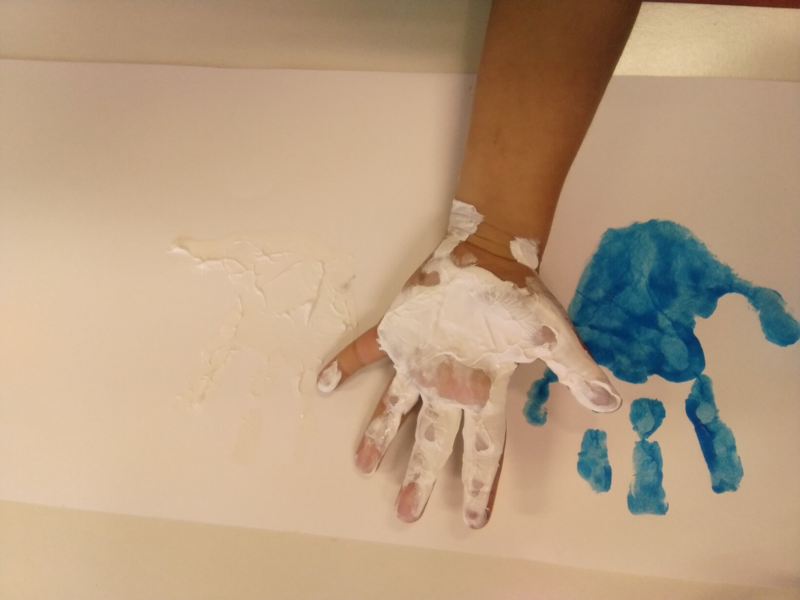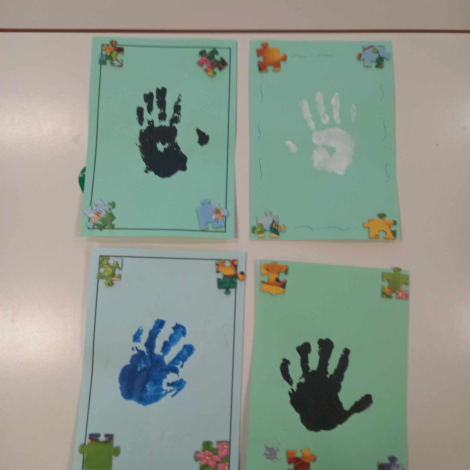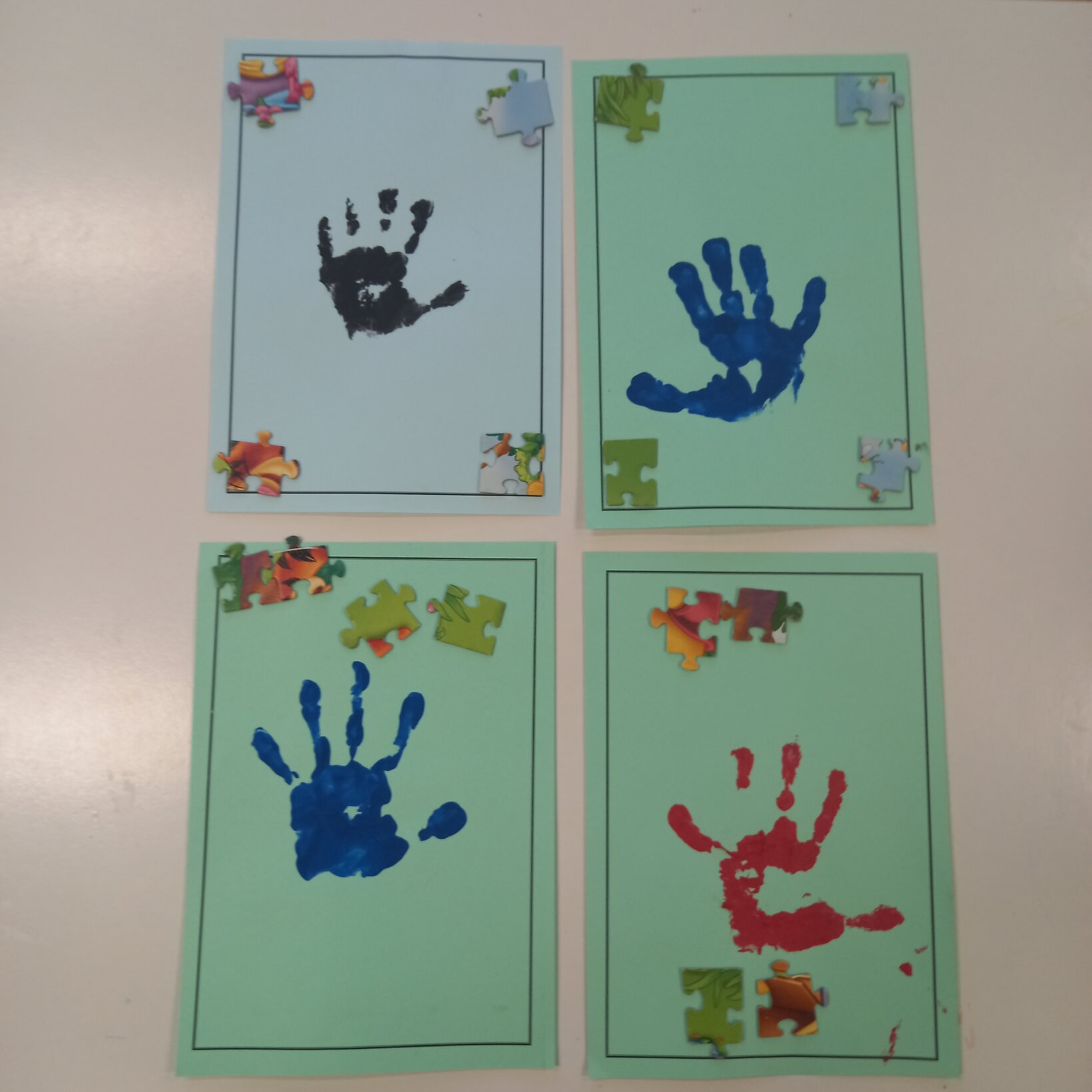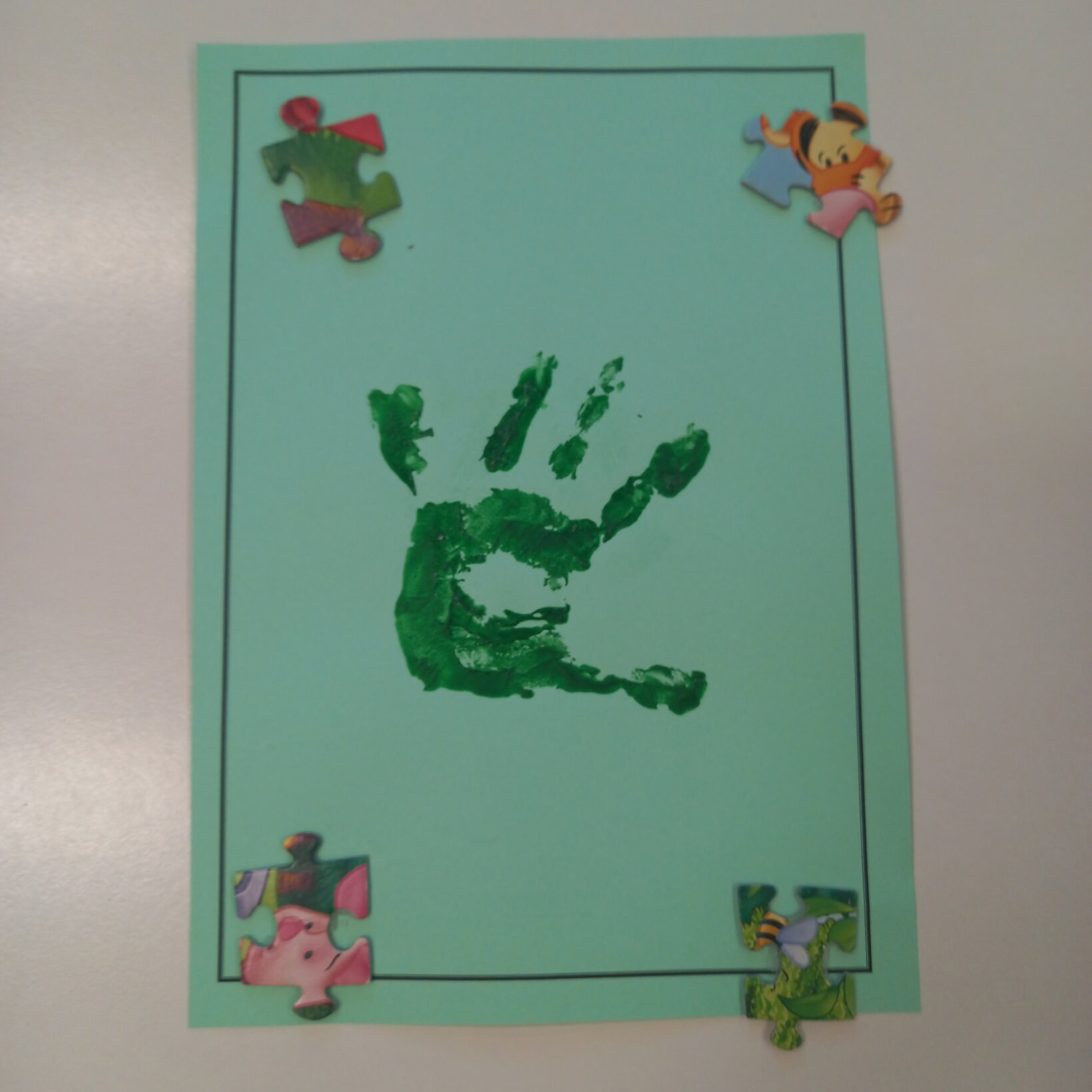 Ασχοληθήκαμε και με την τέχνη. Αποτυπώσαμε τη δική μας παλάμη με τέμπερες και στολίσαμε το έργο μας με χαμένα κομμάτια παζλ (τίποτα δεν πετάμε εμείς!)