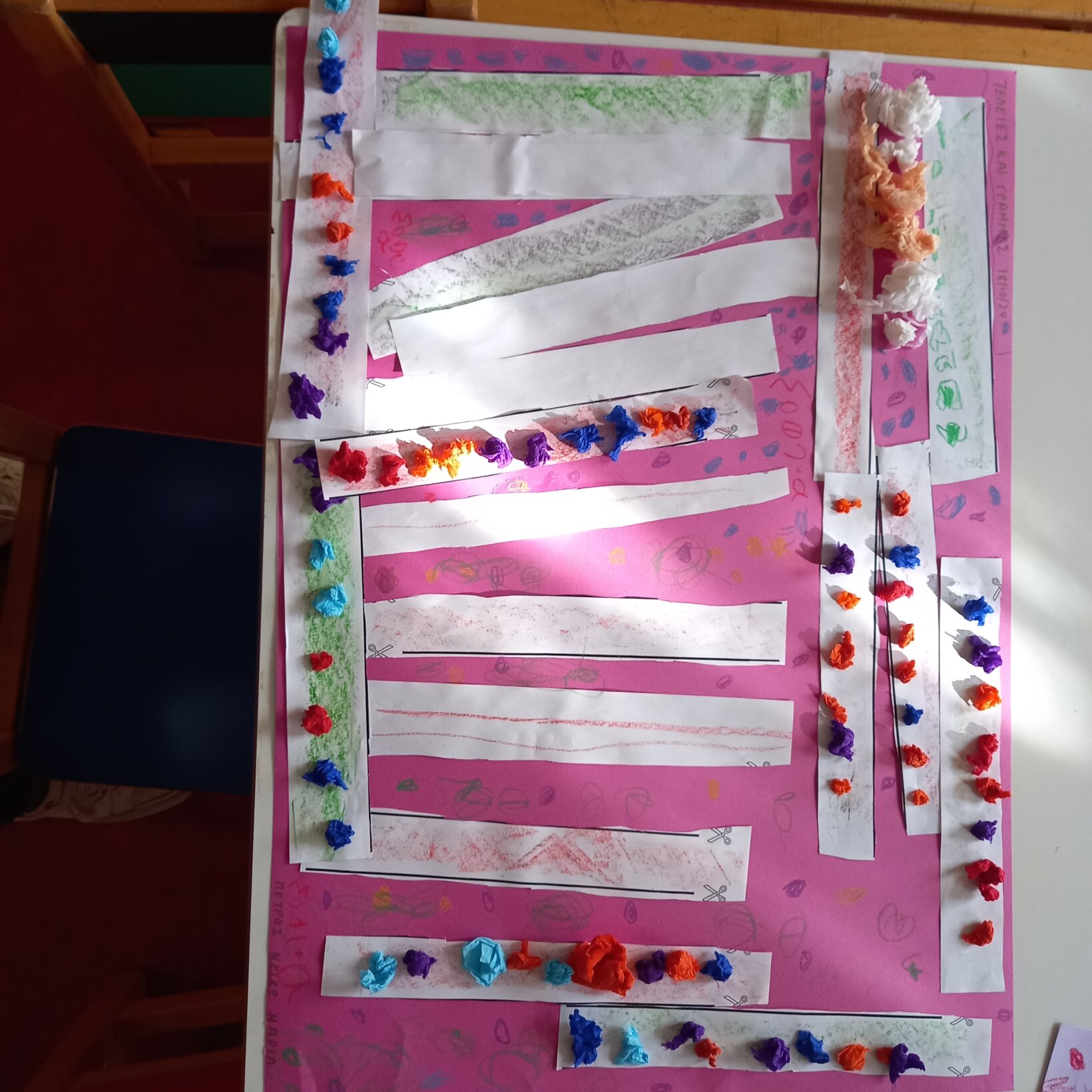 Μαθαμε να κόβουμε χρησιμοποιώντας σωστά το ψαλίδι μας γραμμές και φτιάξαμε με τα δάχτυλά μας μπάλες από γκοφρέ (ανάπτυξη λεπτής κινητικότητας). Φτιάξαμε ομαδικά έργα με τις γραμμές που κόψαμε και τις μπάλες από γκοφρέ ( ομαδικότητα, συνεργασία).