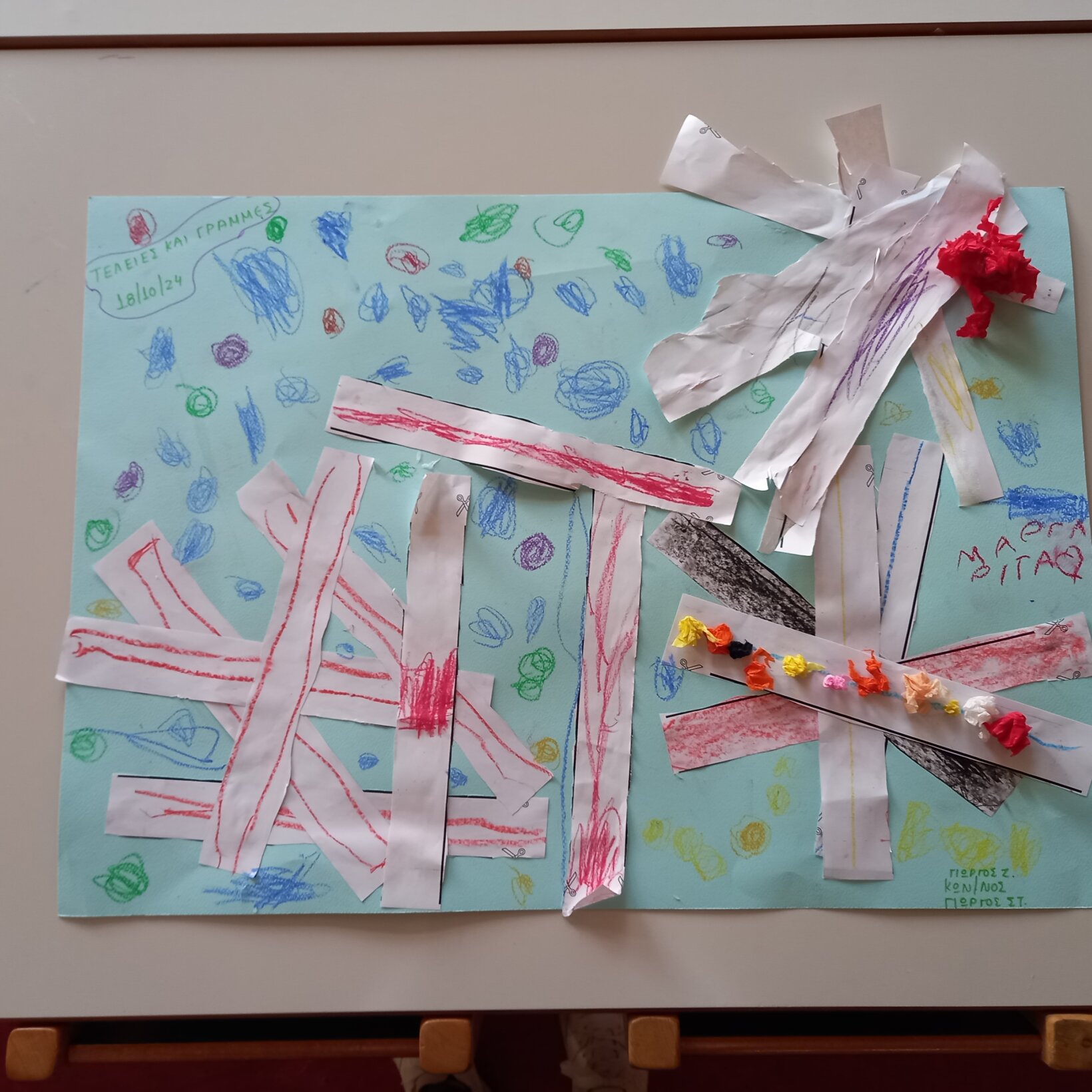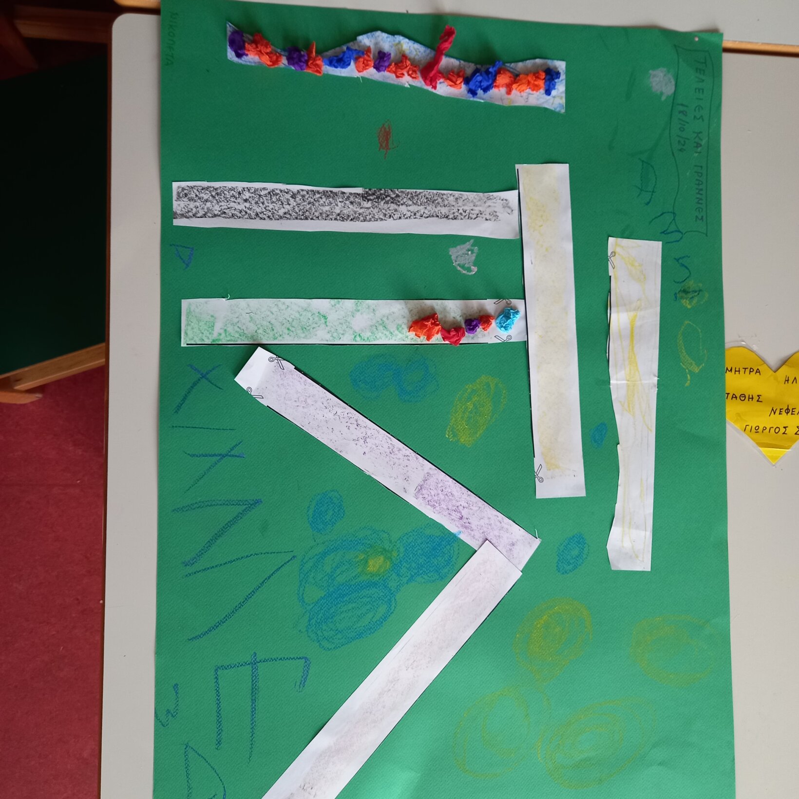 Με αφορμή μία γραμμή που είδαμε να δημιουργείται στον ουρανό από ένα αεροπλάνο, γνωρίσαμε διάφορα είδη γραμμών (ευθεία, καμπύλη, ζιγκ ζαγκ, κλπ), τις γράψαμε στο προαύλιο με κιμωλία, τις ακολουθήσαμε με βήματα, τις «γράψαμε» στον αέρα με τα δαχτυλάκια μας, τις σχηματίσαμε με κλωστές στο πάτωμα και τις σχεδιάσαμε μόνοι μας σε χαρτί.