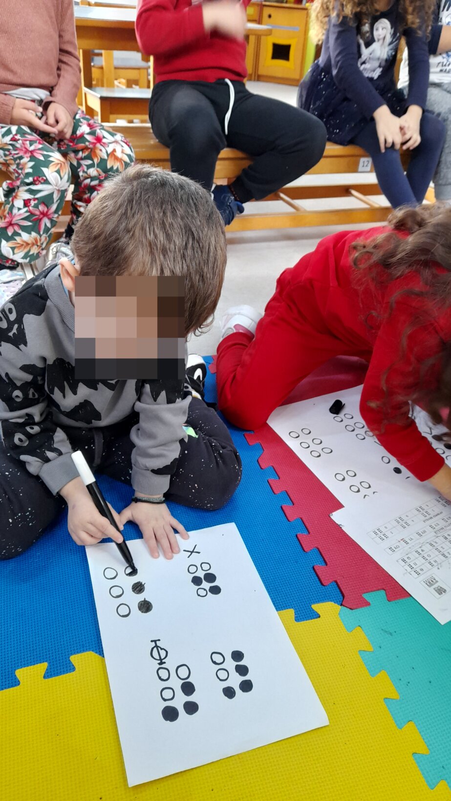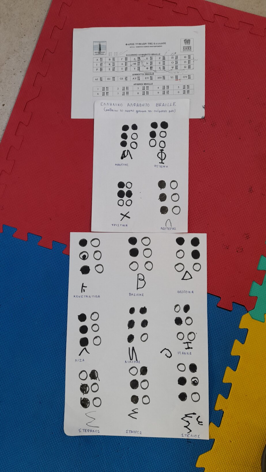 Υπάρχει το ελληνικό αλφάβητο Braille. Ο τυφλός μπορεί μ’ αυτό το σύστημα να διαβάζει ψηλαφώντας τις στιγμές με το δάχτυλο, δηλαδή έχουμε ανάγνωση με την αφή. Προσπαθήσαμε κι εμείς να γράψουμε το αρχικό του ονόματός μας.