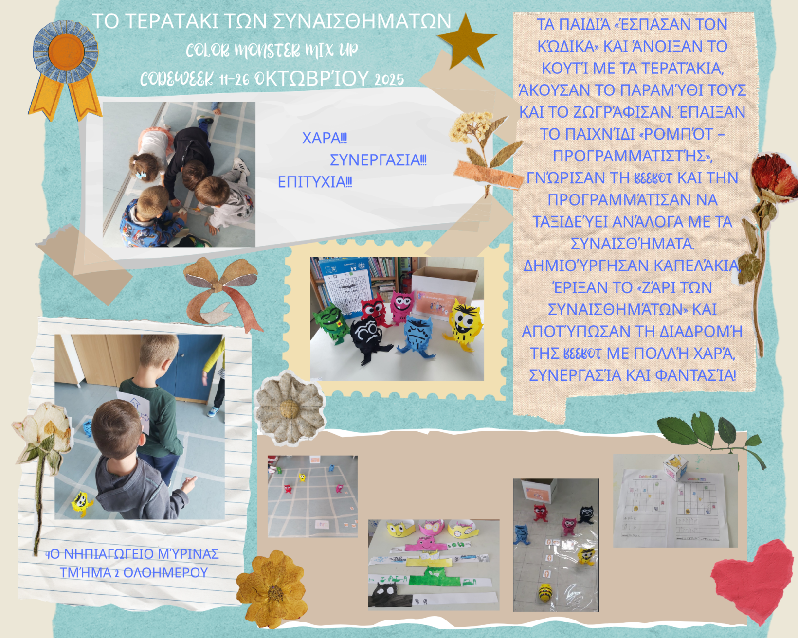 Στη δραστηριότητα «Το τερατάκι των συναισθημάτων / Color Monster Mix Up», τα παιδιά βοήθησαν το μπερδεμένο τερατάκι να αναγνωρίσει και να ταξινομήσει τα συναισθήματά του, καθοδηγώντας το ρομποτάκι Bee Bot σε κάθε χρώμα-συναίσθημα στο ταμπλό. Μέσα από βιωματικά παιχνίδια ρομποτικής, κινητικές δραστηριότητες και δημιουργία καπέλων-συναισθημάτων, τα παιδιά ανέπτυξαν συναισθηματική νοημοσύνη, ενσυναίσθηση και δεξιότητες ακολουθίας και προγραμματισμού.