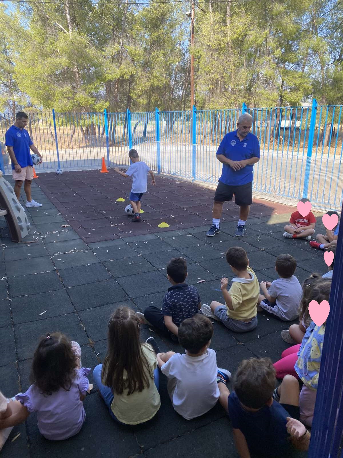 Στο νηπιαγωγείο μας προσκαλέσαμε εκπροσώπους της Ένωσης Ποδοσφαιρικών Σωματείων Αργολίδας και με το σύνθημα: «Κινούμαι, Ενεργώ, Δημιουργώ» υλοποιήθηκαν αθλητικές δράσεις προκειμένου να αναδειχθούν τα οφέλη και η σημασία της φυσικής δραστηριότητας, της σωματικής άσκησης και του αθλητισμού για την υγεία και τη βελτίωση της ποιότητας ζωής. Τα παιδιά έμαθαν να εκτελούν συντονισμένες κινήσεις συντονίζοντας το μάτι με το πόδι, να συνεργάζονται μεταξύ τους , να πειθαρχούν και να σέβονται ο ένας τον άλλον. Το διασκέδασαν και πέρασαν πολύ όμορφα.