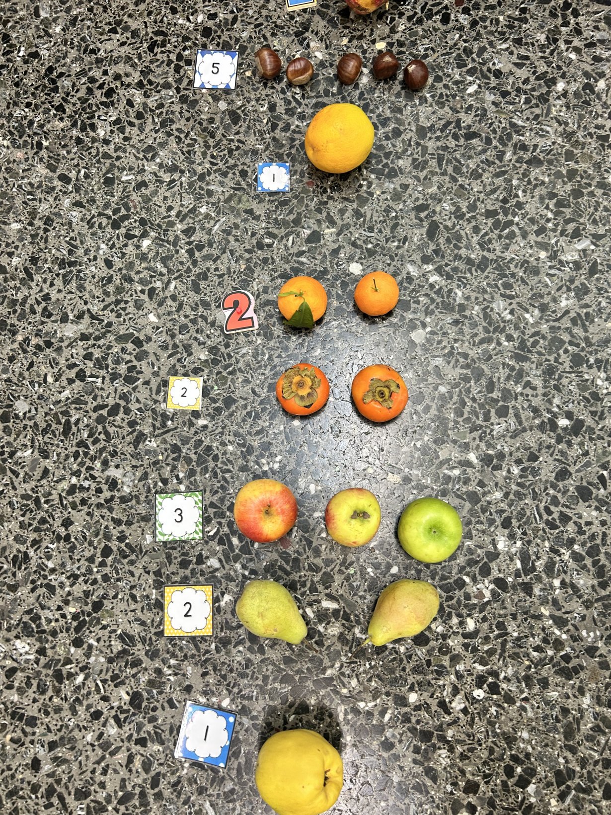 Παίξαμε παιχνίδια ταξινόμησης και αρίθμησης, δουλεύοντας μαθηματικές έννοιες ενώ ταυτόχρονα είχαν την ευκαιρία να γνωρίσουν τα φρούτα του φθινοπώρου, να τα εξερευνήσουν, να τα συγκρίνουν και να τα ομαδοποιήσουν.