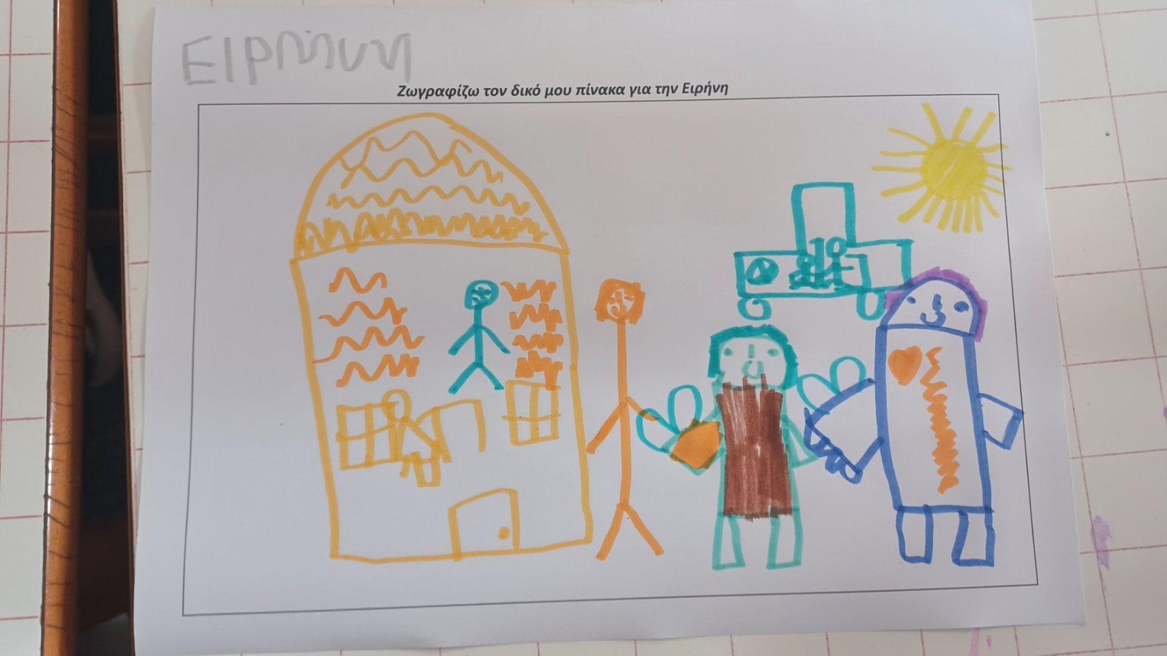 Παρατηρήσαμε πίνακες ζωγραφικής, με θέμα την ειρήνη. Τα παιδιά έγιναν καλλιτέχνες και φιλοτέχνησαν τον δικό τους πίνακα.