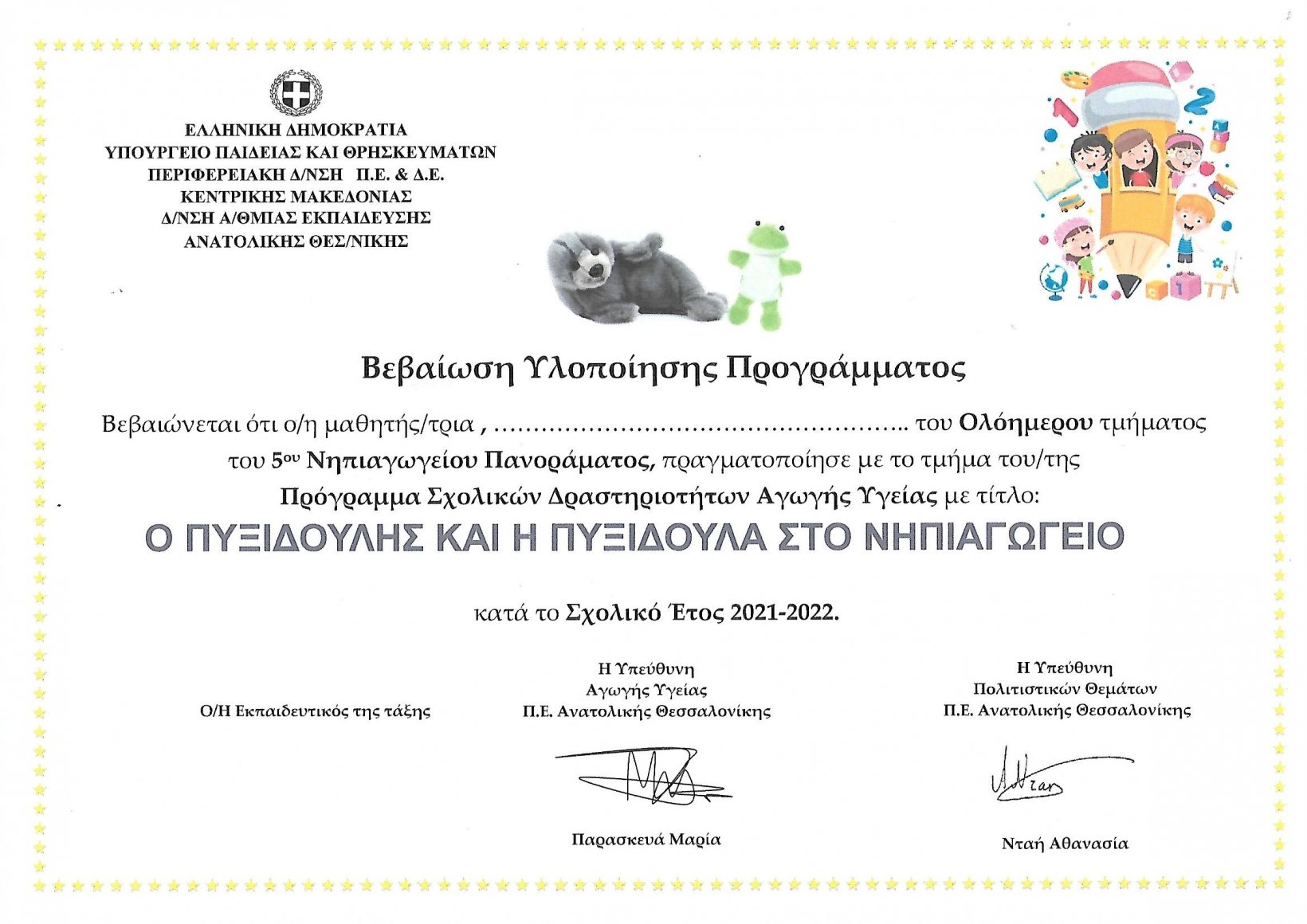 Τη φετινή σχολική χρονιά 2021-2022 υλοποιήθηκε στο ολοήμερο τμήμα ένα καινοτόμο πρόγραμμα αγωγής υγείας «Ο Πυξιδούλης και η Πυξιδούλα στο Νηπιαγωγείο» του Κέντρου Πρόληψης «Πυξίδα». Με τη βοήθεια του Πυξιδούλη (βάτραχος γαντόκουλα) και της Πυξιδούλας (φώκια γαντόκουκλα) που επισκέπτονταν το ολοήμερο μια φορά την εβδομάδα, καλλιεργήθηκαν συναισθηματικές και κοινωνικές δεξιότητες των παιδιών (επικοινωνία, αναγνώριση και έκφραση συναισθημάτων, ενίσχυση της αυτοεκτίμησης, συνεργασία). Πραγματοποιήθηκαν δραστηριότητες με θέμα την ομαδικότητα, την αυτοεκτίμηση, τη φροντίδα του εαυτού και τα συναισθήματα. Ολοκληρώνοντας το πρόγραμμα, δημιουργήσαμε το δικό μας βιβλίο και κλείσαμε μέσα του τα συναισθήματά μας, τα πράγματα που μας κάνουν περήφανους, τα ενδιαφέροντά μας. Όλα αυτά τα μοιραστήκαμε με τους συμμαθητές μας και διαπιστώσαμε ότι έχουμε πολλά κοινά αλλά ότι είμαστε ταυτόχρονα και πολύ διαφορετικοί. Επίσης, τα παιδιά εντόπισαν και εξέφρασαν φιλοφρονήσεις για τα μέλη της ομάδας αλλά και για τους ίδιους, και αντίστοιχα, δέχτηκαν τις φιλοφρονήσεις των υπόλοιπων παιδιών.