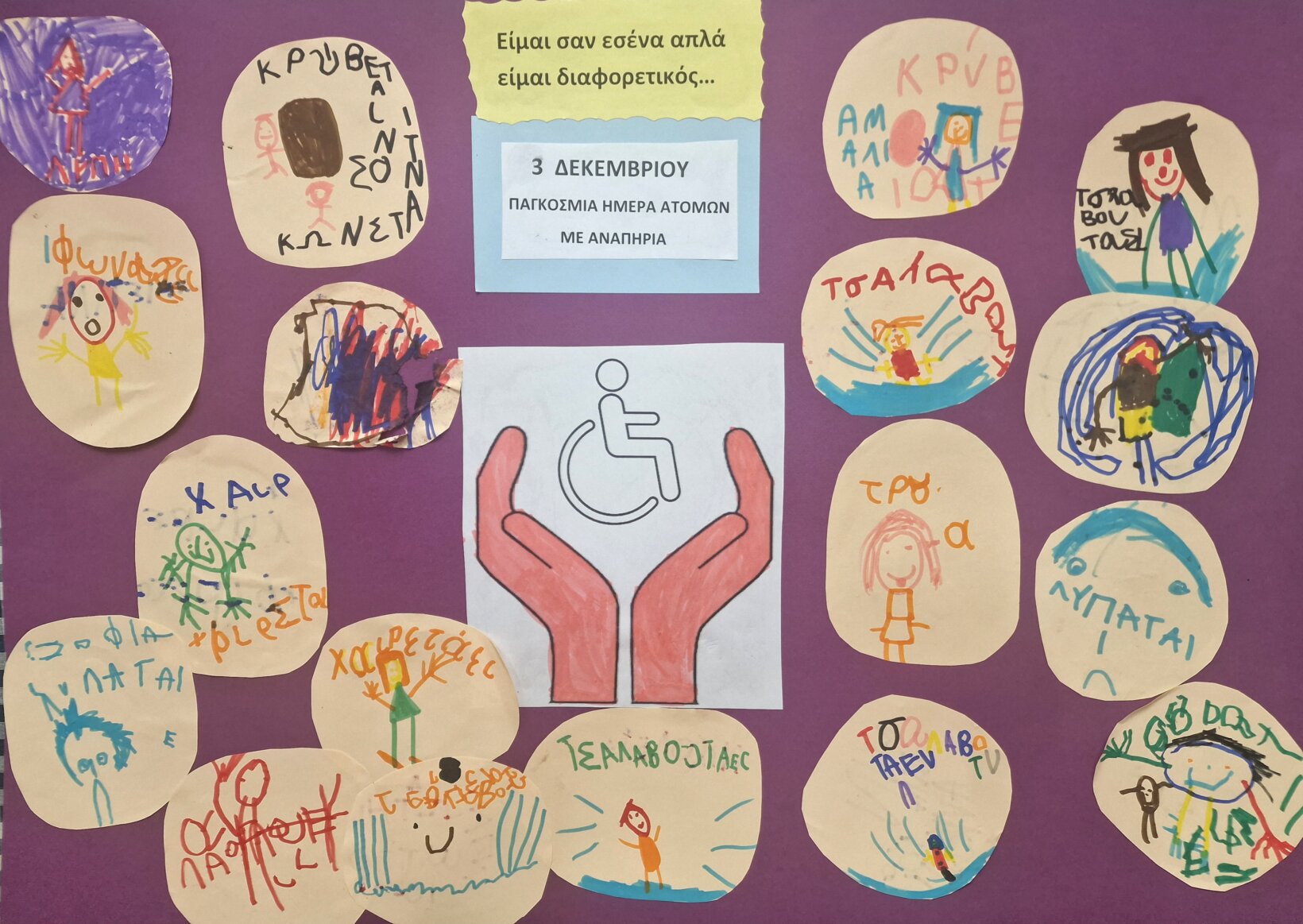 Με αφορμή την Παγκόσμια Ημέρα Ατόμων με Αναπηρία και μέσα από δραστηριότητες, μας δόθηκε η ευκαιρία κατανόησης σε θέματα αναπηρίας και ευαισθητοποίησης, για τα δικαιώματα και τις δυνατότητες των ατόμων με αναπηρία. Τα παιδιά έμαθαν πως πρέπει να διασφαλιστεί η ισότιμη πρόσβαση όλων των μαθητών στην εκπαίδευση.
