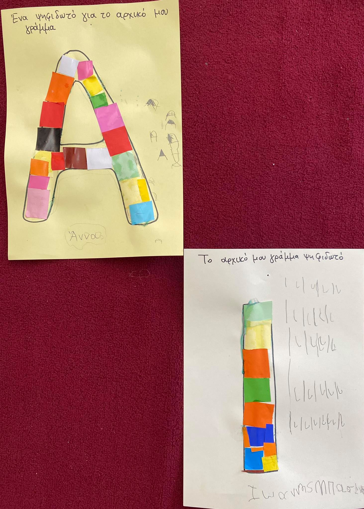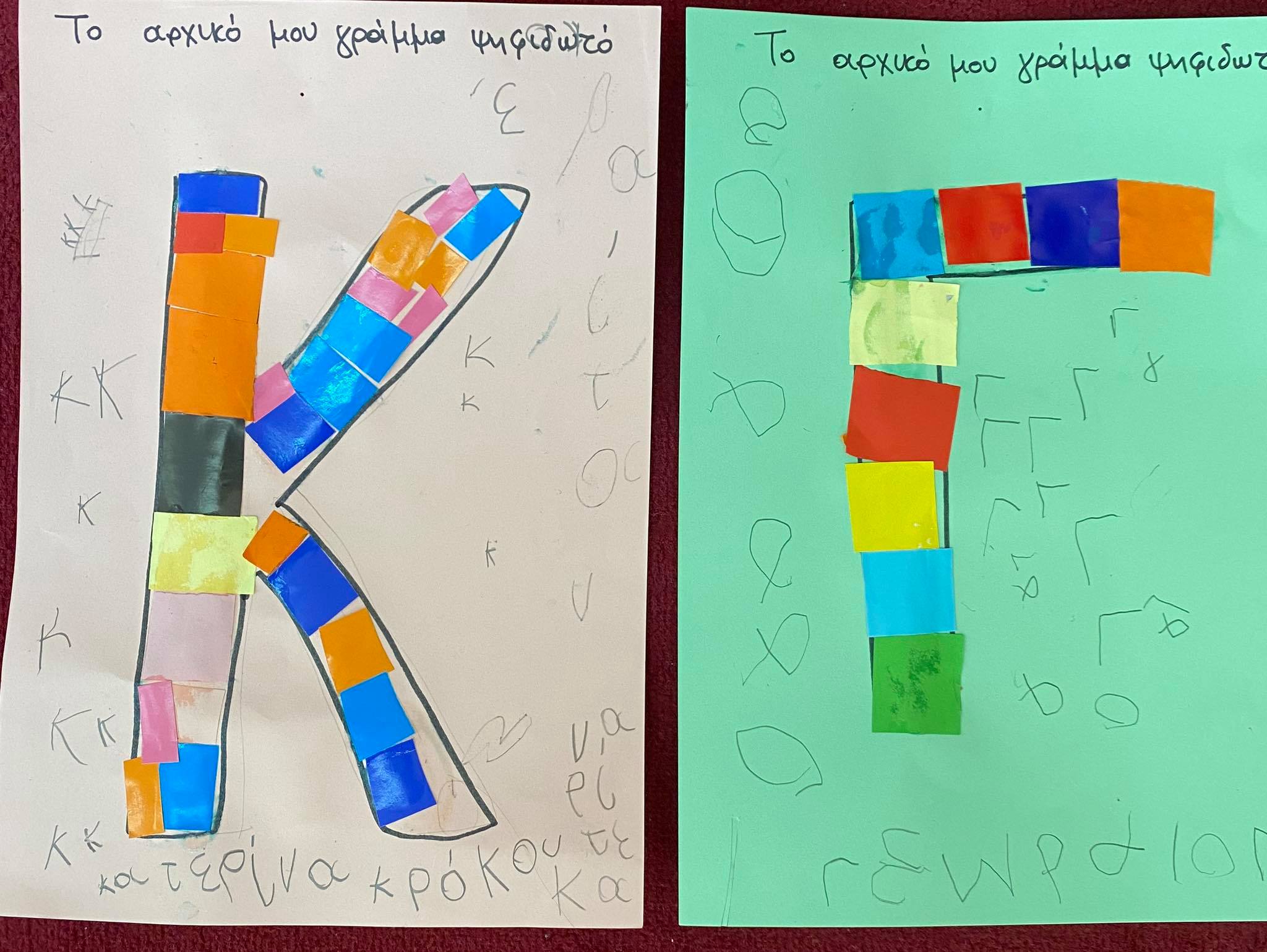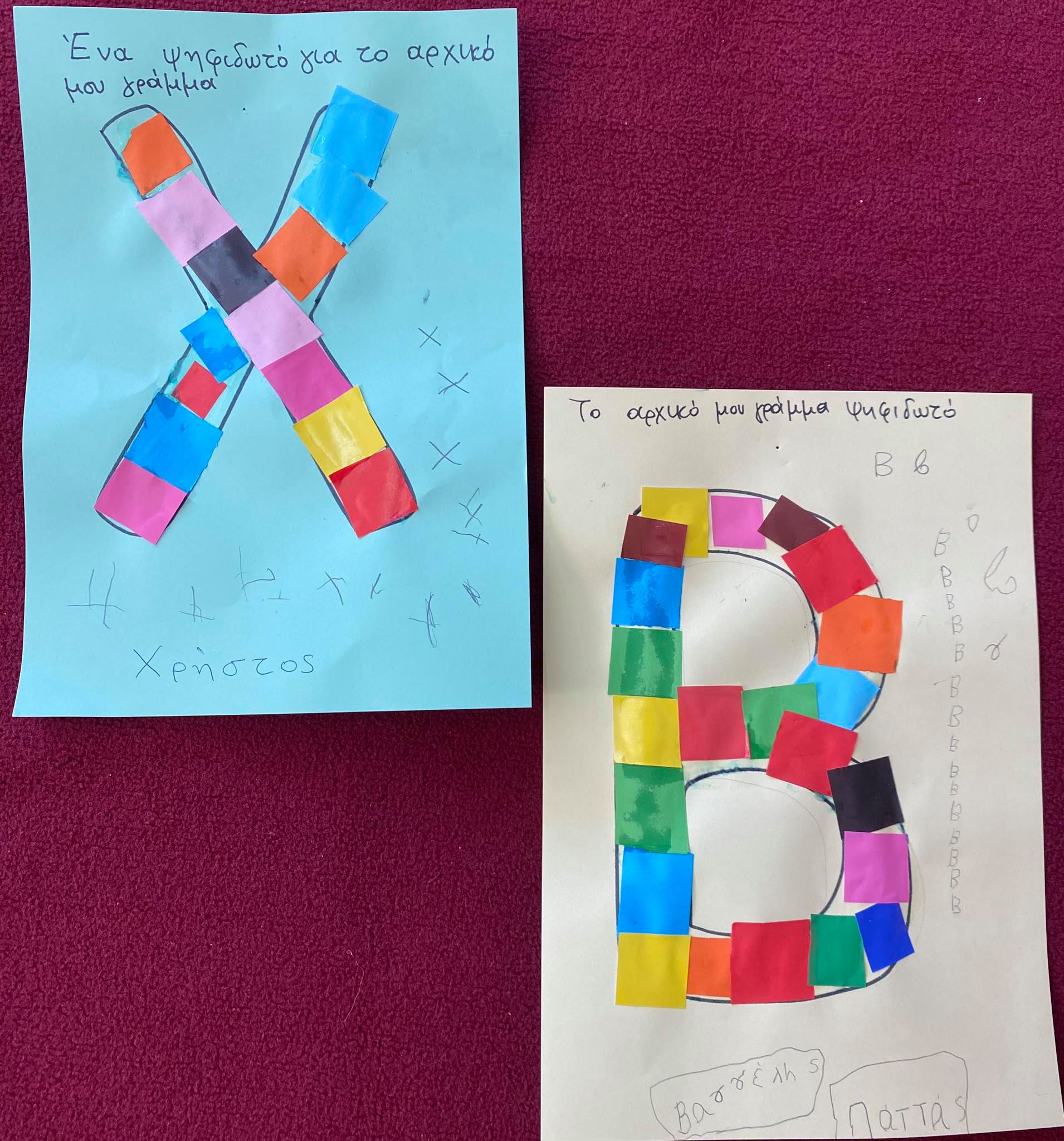 Κυριότερο και ευκολότερο χαρακτηριστικό γνώρισμα του ονόματος – το αρχικό γράμμα. Έτσι λοιπόν τα παιδιά έφτιαξαν ψηφιδωτό κολλώντας μικρά κομμάτια γλασέ χαρτί στο αρχικό γράμμα του ονόματός τους !!!