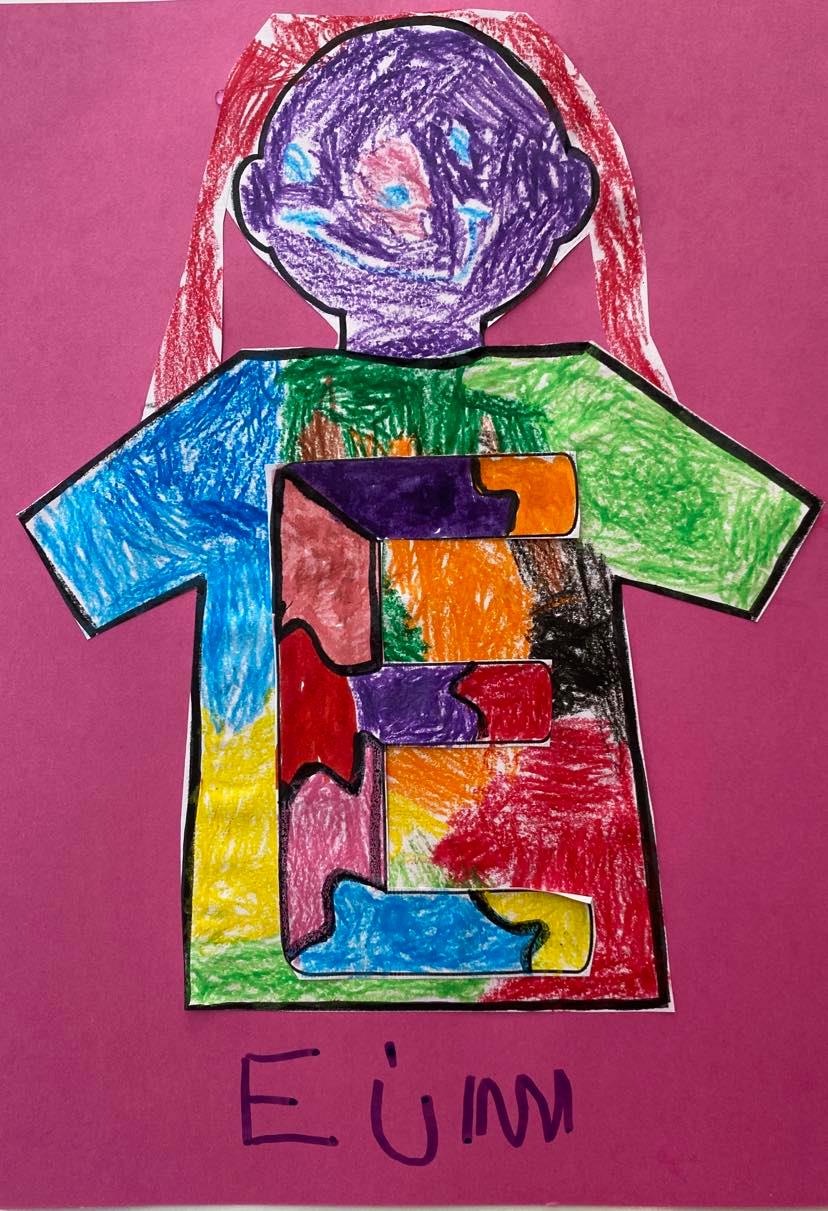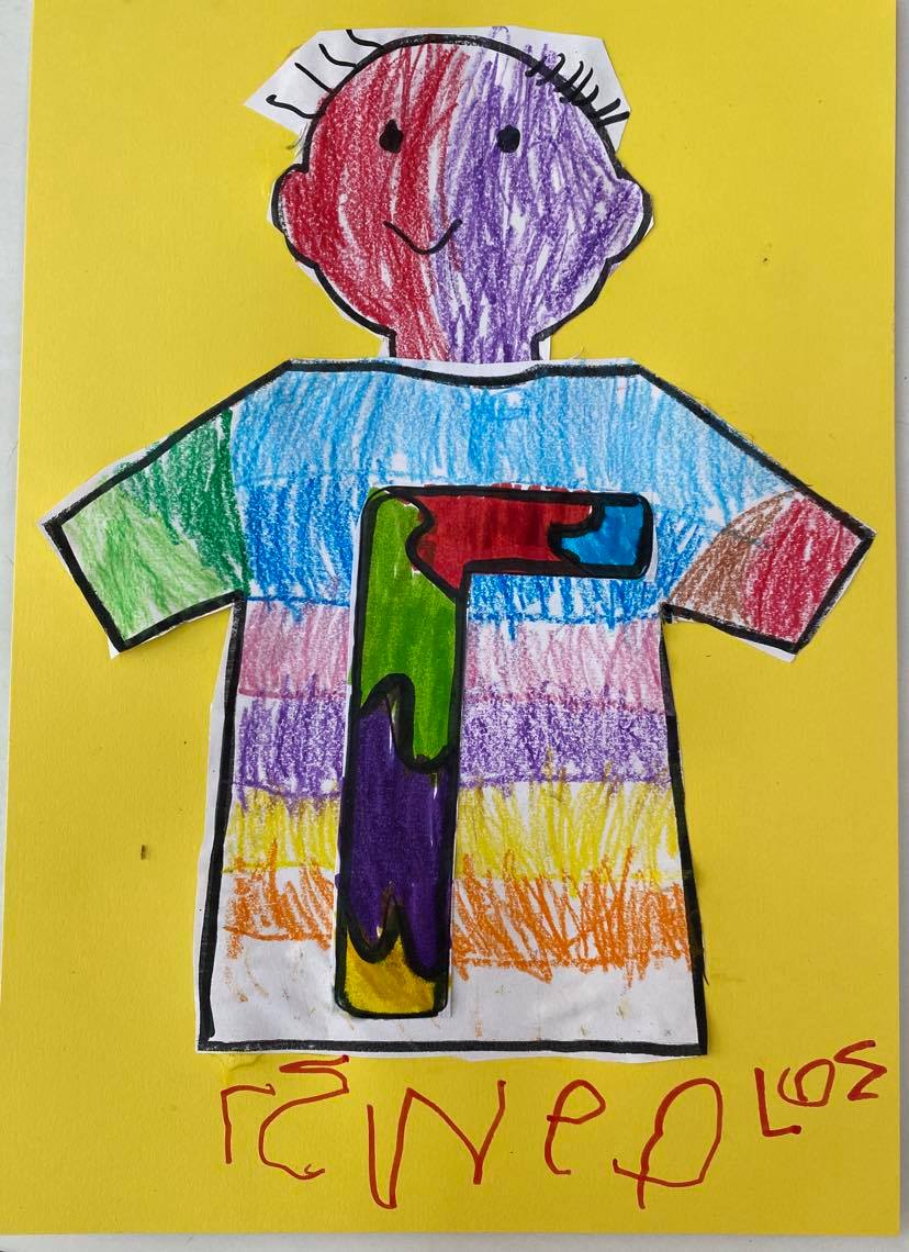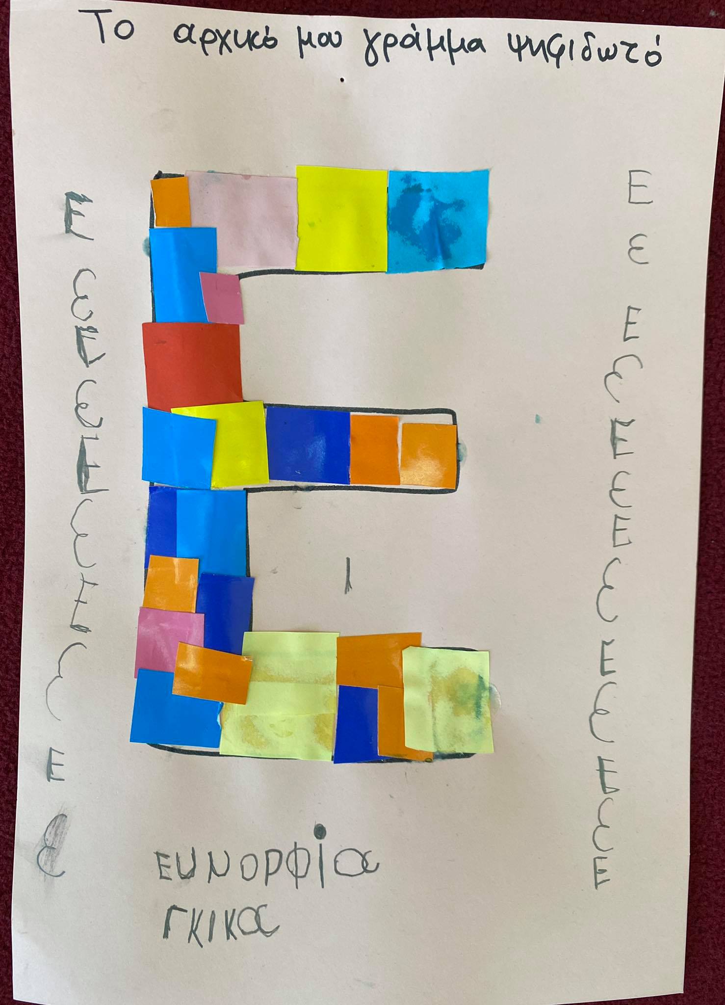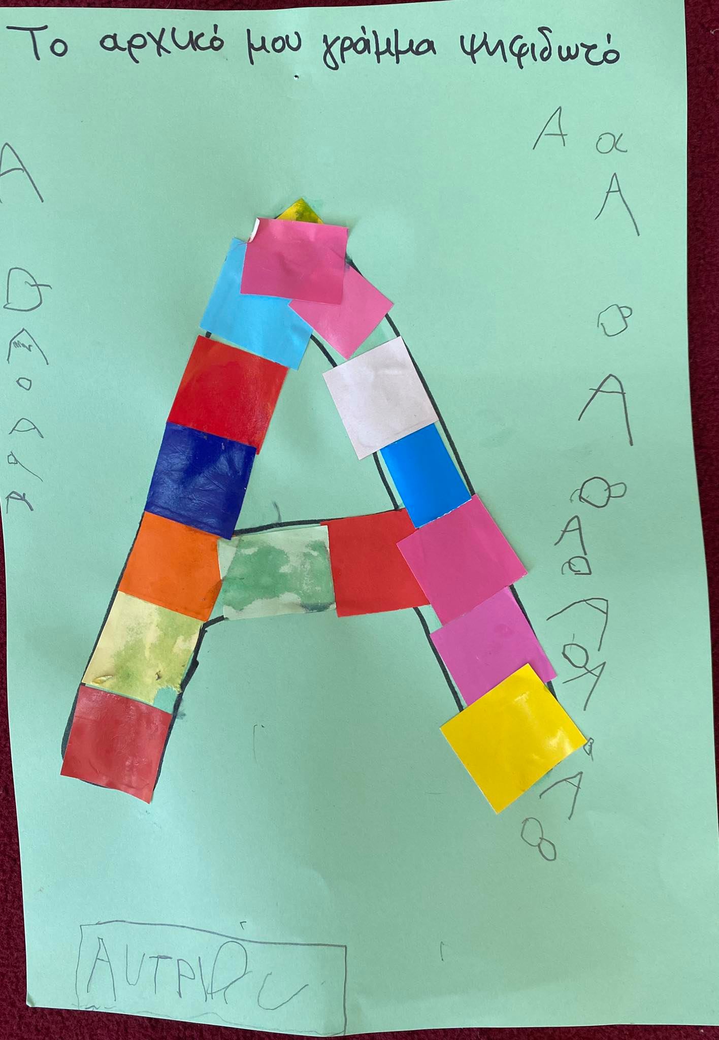Κυριότερο και ευκολότερο χαρακτηριστικό γνώρισμα του ονόματος – το αρχικό γράμμα. Έτσι λοιπόν τα παιδιά έφτιαξαν ψηφιδωτό κολλώντας μικρά κομμάτια γλασέ χαρτί στο αρχικό γράμμα του ονόματός τους !!!