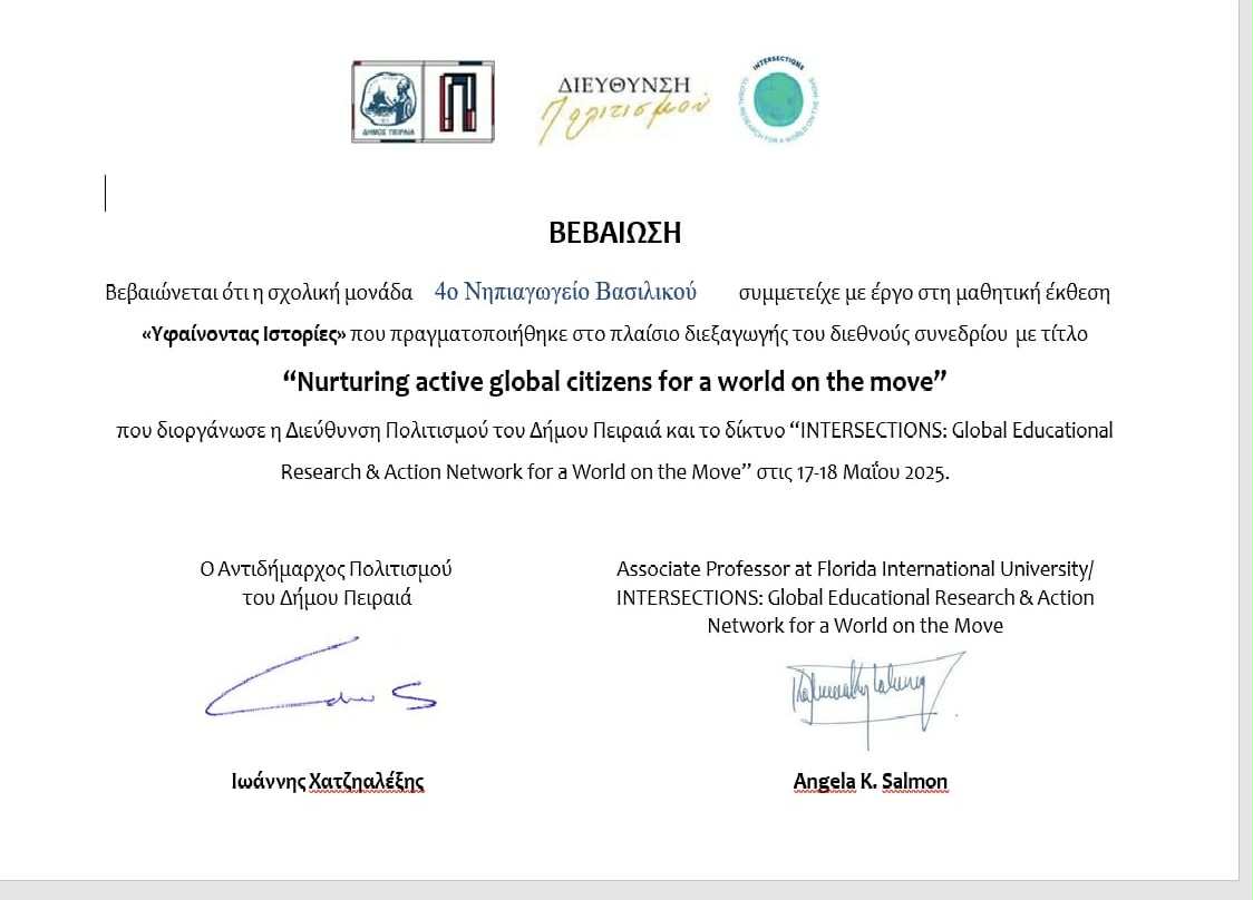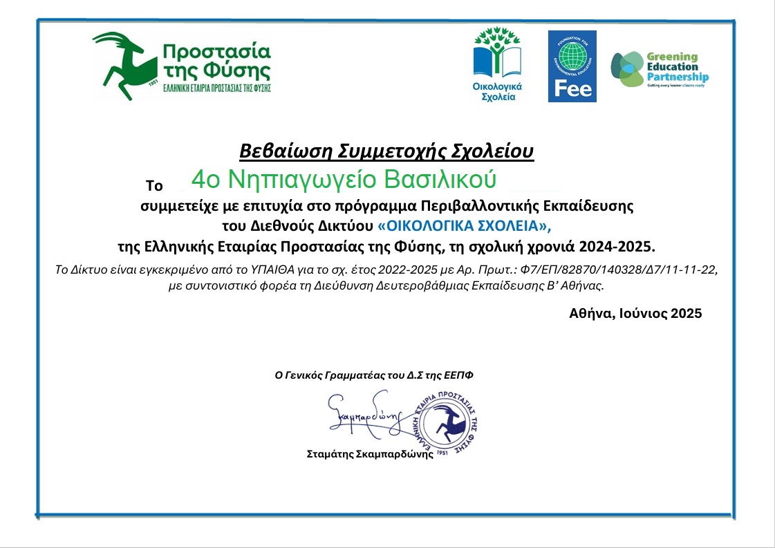 Το νηπιαγωγείο μας είχε την τιμή να συμμετάσχει σε ποικίλες περιβαλλοντικές δράσεις, μέσα από τις οποίες τα παιδιά ευαισθητοποιήθηκαν σε θέματα προστασίας του περιβάλλοντος. Η προσπάθειά μας αναγνωρίστηκε με διακρίσεις και επαίνους συμμετοχής, γεγονός που μας γεμίζει χαρά και ενισχύει τη δέσμευσή μας για συνέχιση ανάλογων εκπαιδευτικών πρωτοβουλιών.