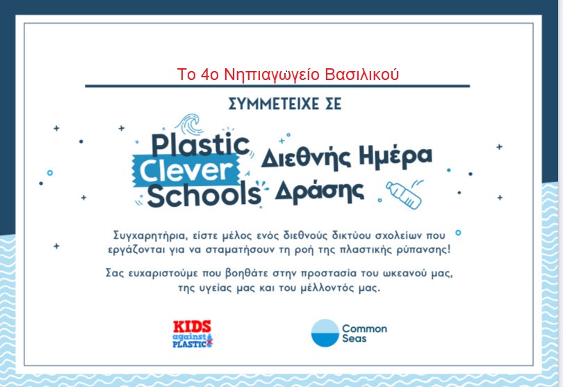 Το 4ο Νηπιαγωγείο Βασιλικού έγινε μέλος στο δίκτυο σχολείων των Plastic clever scools, που εργάζονται για να σταματήσουν τη ρύπανση από τα πλαστικά