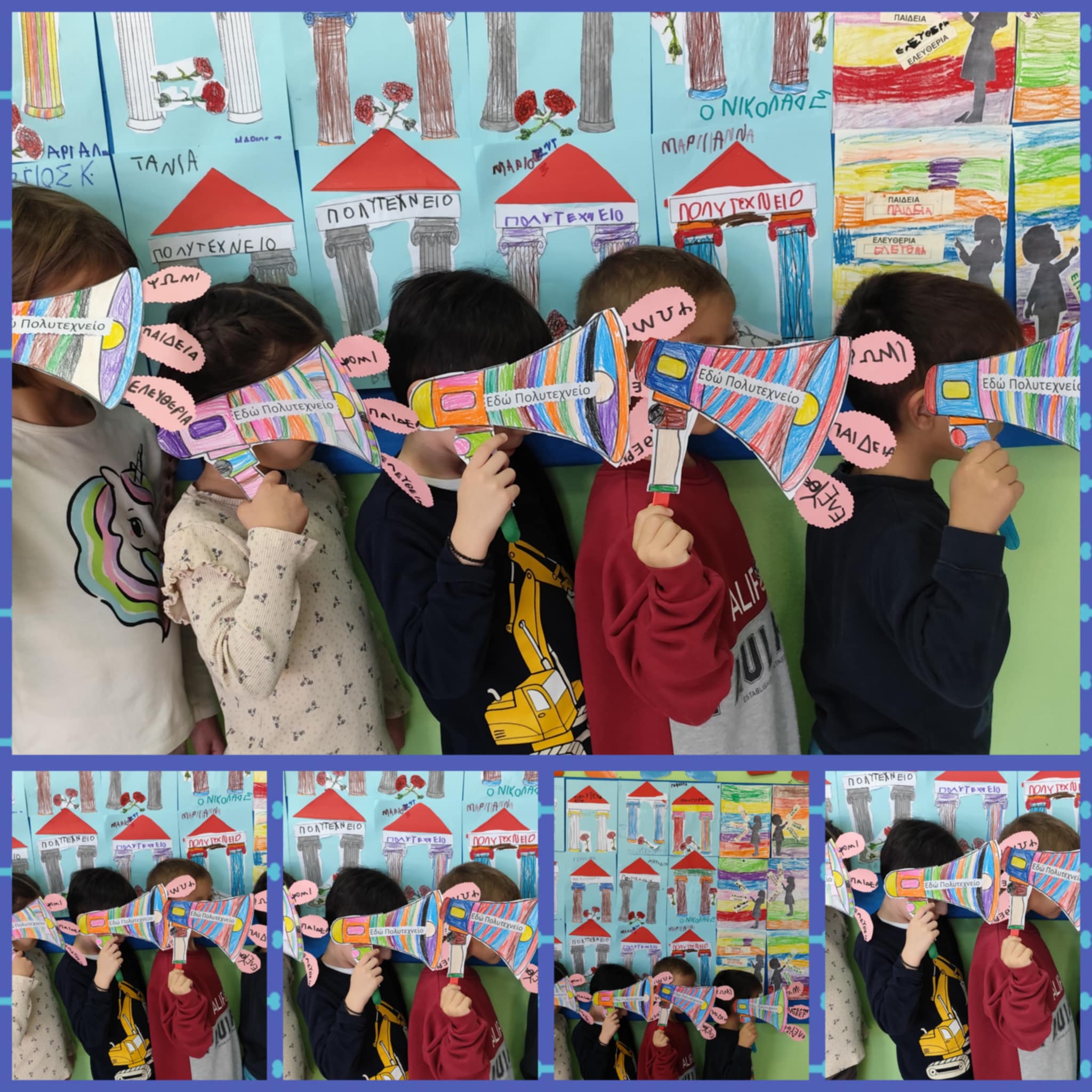 Στο σχολείο προσεγγίσαμε τη γιορτή της 17ης Νοέμβρη μέσα από συζήτηση, εικόνες και δραστηριότητες προσαρμοσμένες στην ηλικία των παιδιών. Μιλήσαμε για το Πολυτεχνείο, την έννοια της ελευθερίας και της δημοκρατίας , παίξαμε παιχνίδια μάθαμε τα πραγματικά γεγονότα.