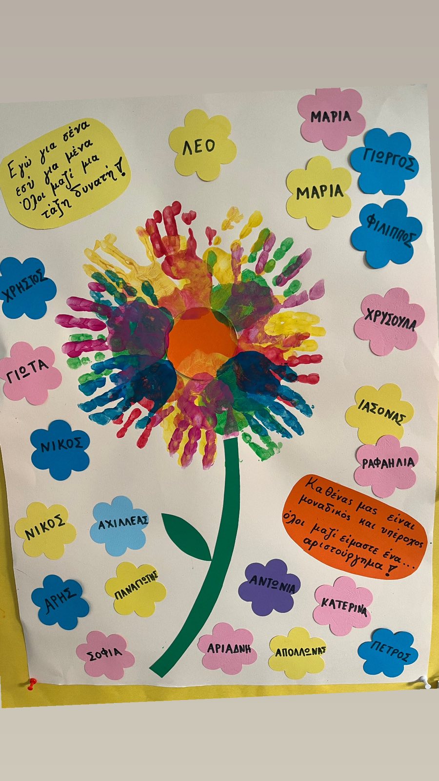 Φτιάξαμε λοιπόν, το λουλούδι της συνεργασίας, όπου κάθε πέταλο αποτελεί και μια παλάμη ενός παιδιού. Το σύνθημα μας; “Εγώ για σένα, εσύ για μένα, όλοι μαζί μια τάξη δυνατή!”