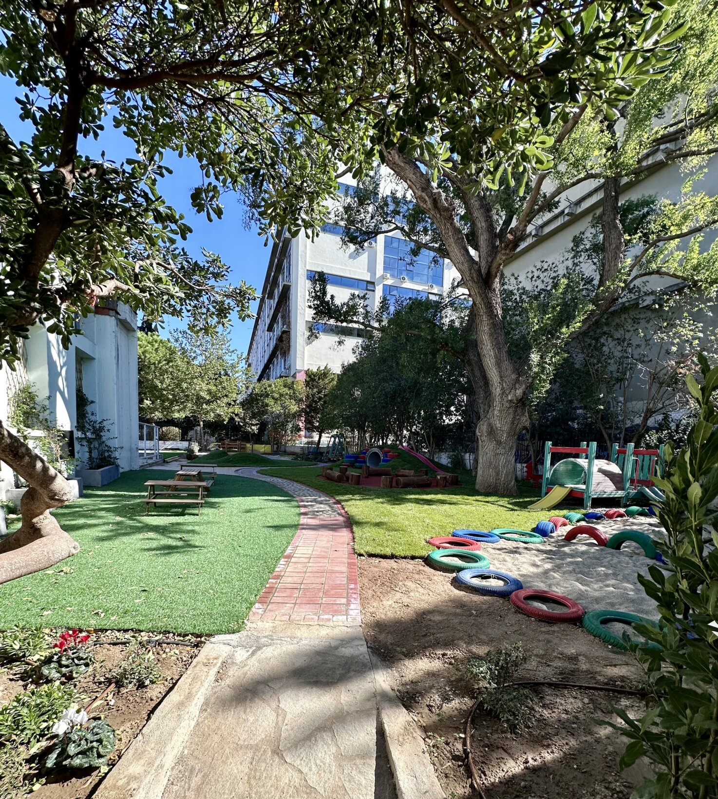 Η κατασκευή του αύλειου χώρου έγινε υπό την καθοδήγηση της κ. Ταμουτσελη, καθηγήτρια ΑΠΘ, με γνώμωνα το παιδί. Κάθε γωνία της άυλης μας παρέχει την ευκαιρία για παιχνίδι, ανακάλυψη και ανάπτυξη δεξιοτήτων και γνώσεων.