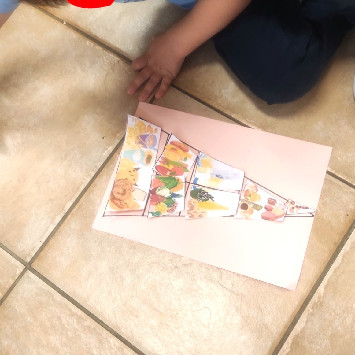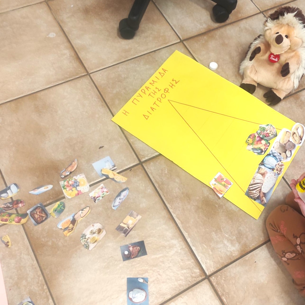 Το παραμύθι ¨η κυρά Διατροφή πρώτη στη μαγειρική!” της Λητώς Τσακίρη Παπαθανασίου μας έδωσε το ερέθισμα να δημιουργήσουμε τη δική μας τροφική πυραμίδα, αρχικά σε μορφή παζλ και ύστερα από συζήτηση και με την τεχνική του κολλάζ αντιστοιχίσαμε τρόφιμα στην αντίστοιχη κατηγορία.