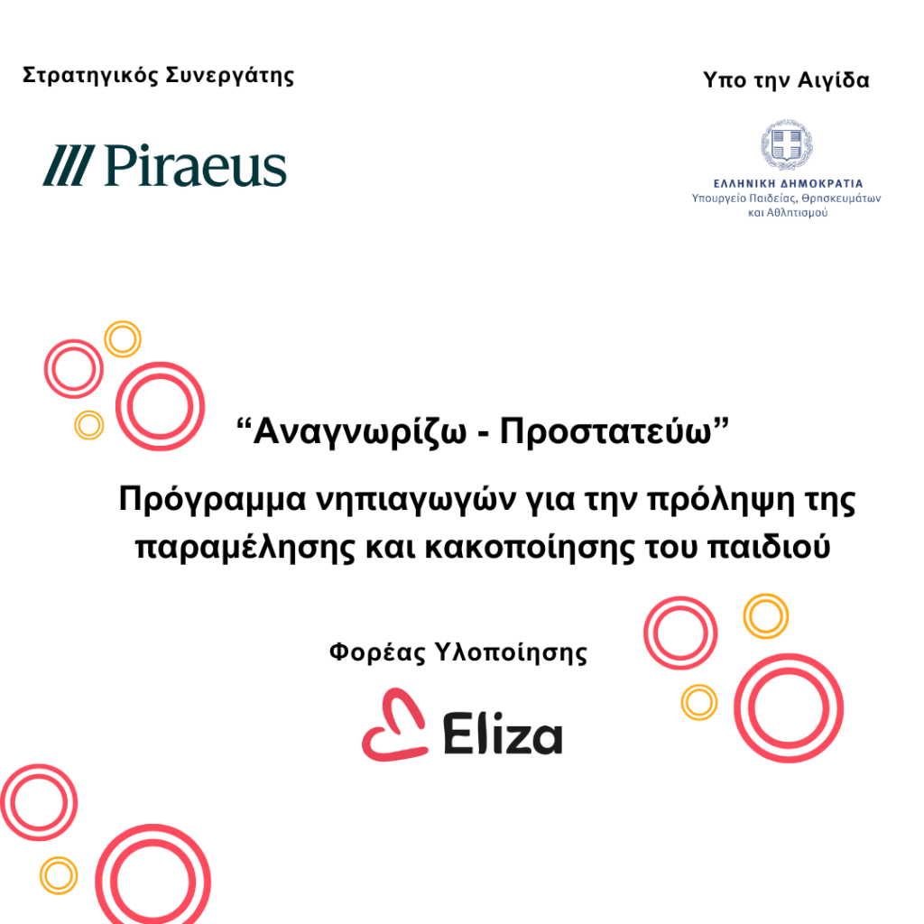 Όλοι οι εκπαιδευτικοί του νηπιαγωγείου μας ,συμμετείχαμε στο πρόγραμμα «ΑΝΑΓΝΩΡΙΖΩ – ΠΡΟΣΤΑΤΕΥΩ», από τον φορέα υλοποίησης ΕΛΙΖΑ. Ένα πρόγραμμα Νηπιαγωγών για την πρόληψη της παραμέλησης και κακοποίησης του παιδιού .