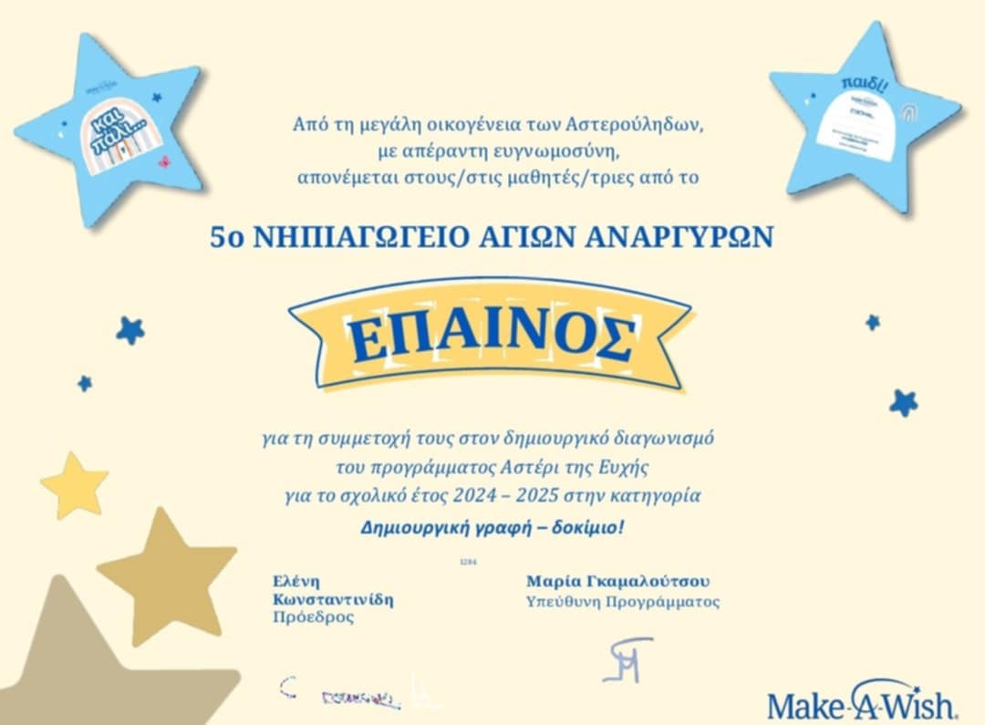 Η ευχή που μόλις υιοθέτησε το 5Ο Νηπιαγωγείο Αγίων Αναργύρων από το Αστέρι της Ευχής