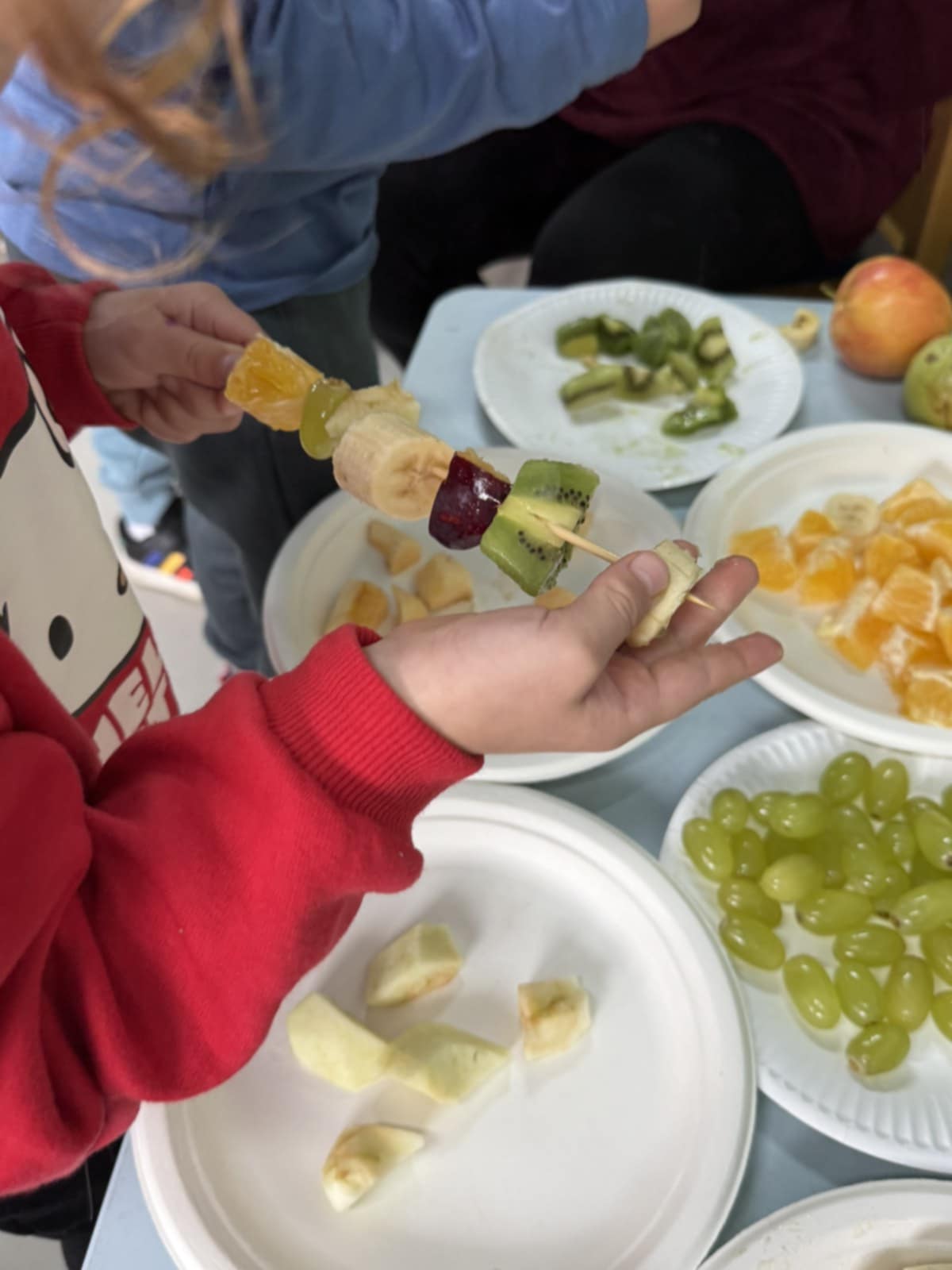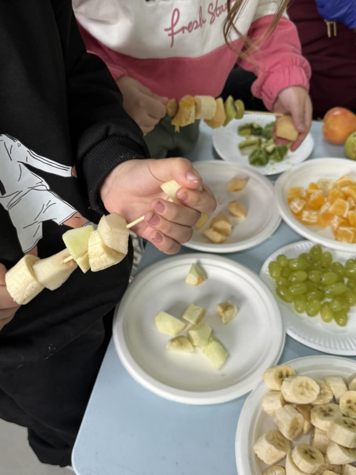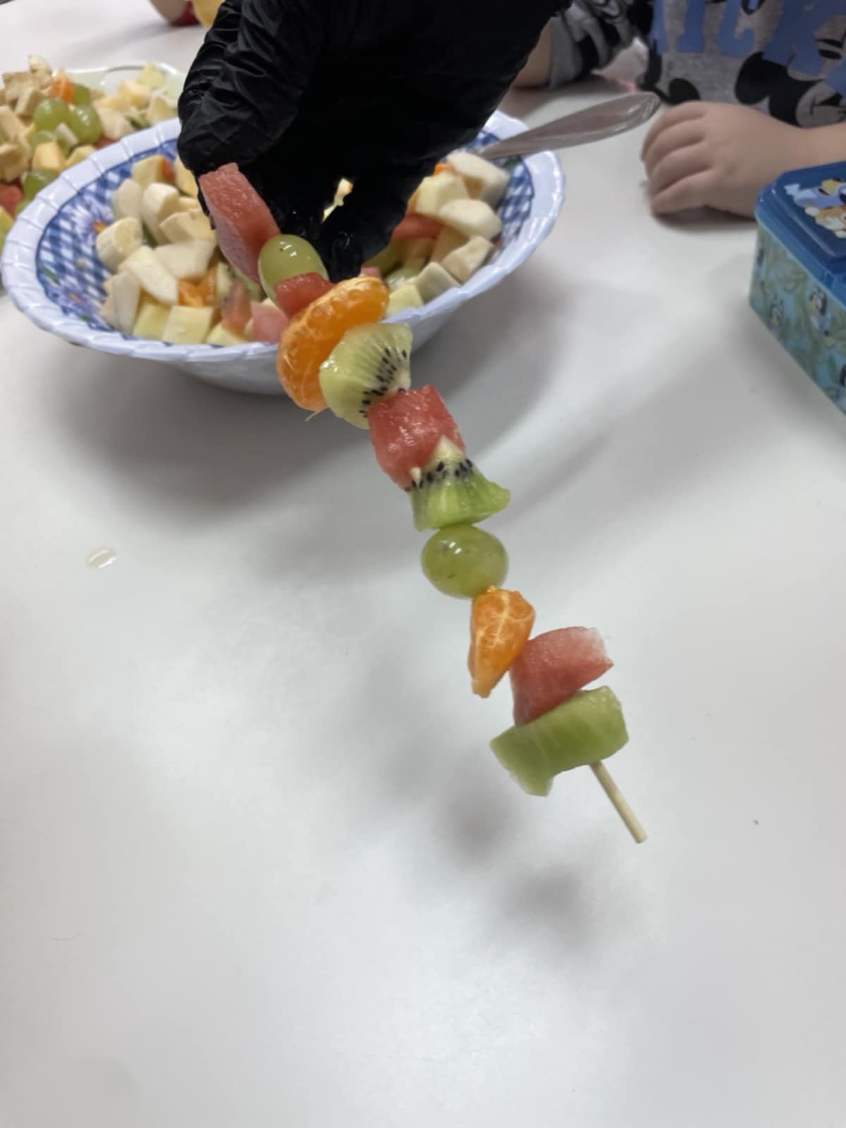 Ήρθε τέλος η ώρα του παιχνιδιού…… σε ζευγάρια φτιάξαμε όσο πιο γρήγορα μπορούσαμε και πάντα με ασφάλεια το σουβλάκι μας από φρούτα, το δείξαμε στους φίλους μας, μετρήσαμε απο πόσα κυβάκια αποτελείται και το φάγαμε με μεγάλη ευχαρίστηση…