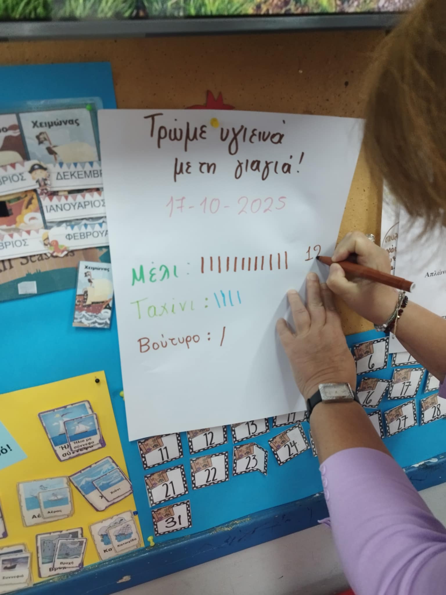 Με αφορμή την Παγκόσμια Ημέρα Υγιεινής Διατροφής και μέσα στα πλαίσια υλοποίησης του Σχεδίου δράσης ενεργού πολιτειότητας της σχολικής μονάδας, την Παρασκευή 17 Οκτωβρίου το σχολείο μας επισκέφθηκαν οι γιαγιάδες μας για να φτιάξουμε, να δοκιμάσουμε και να φάμε παρέα“Ένα Υγιεινό Πρωινό”.