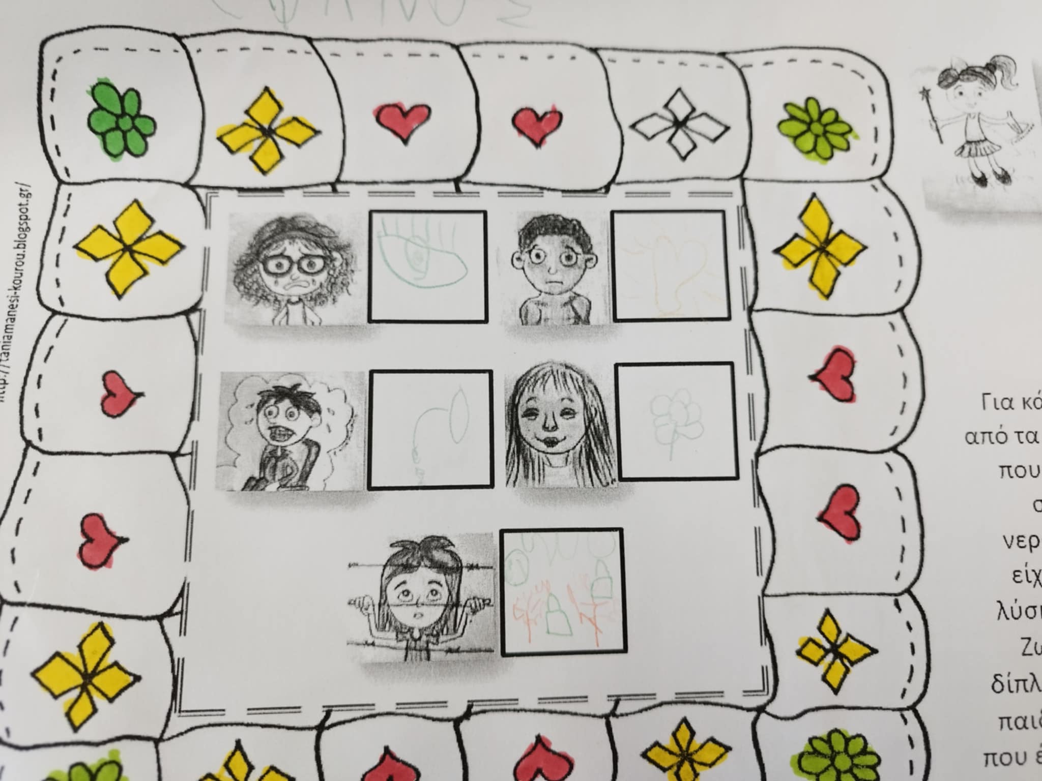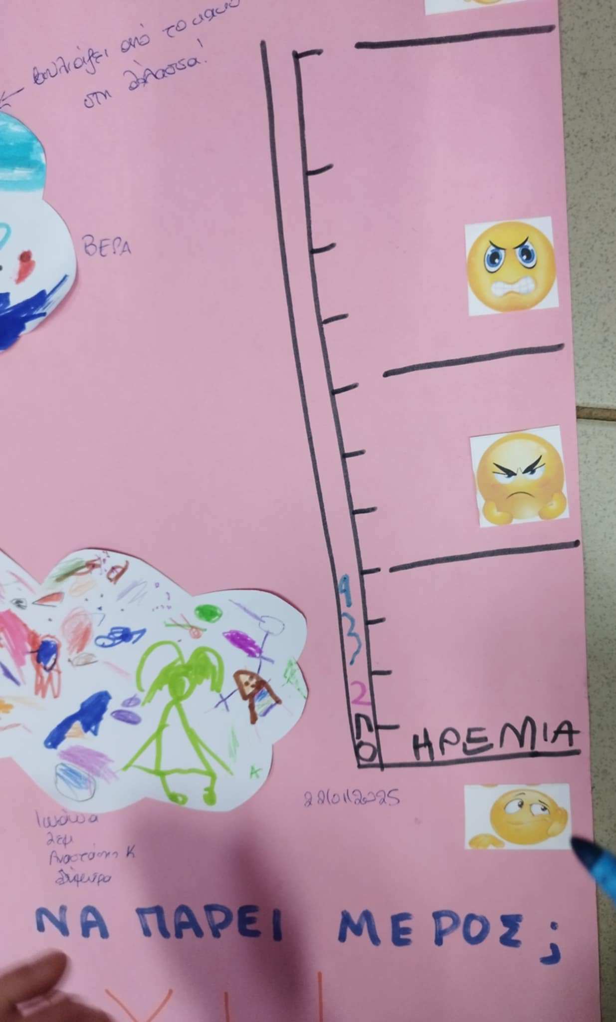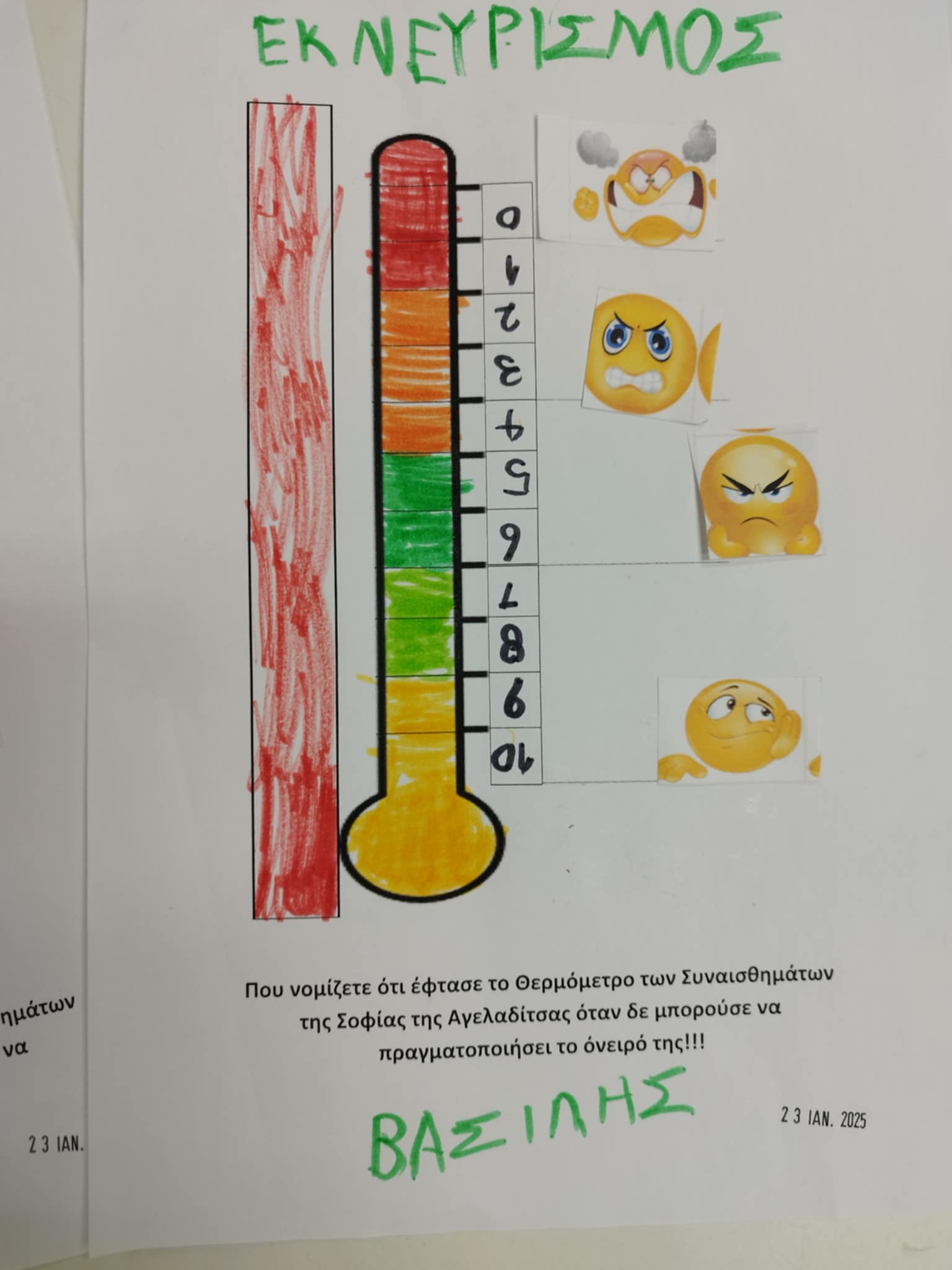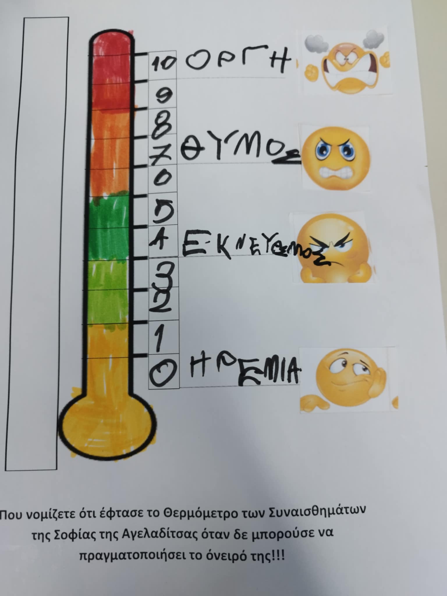 Στο τέλος φτιάξαμε το «Θερμόμετρο συναισθημάτων». Τα παιδιά καταγράφουν ή αναπαριστούν με φατσούλες τα πιθανά συναισθήματα που βιώνει η Σοφία μέσα από την ιστορία.