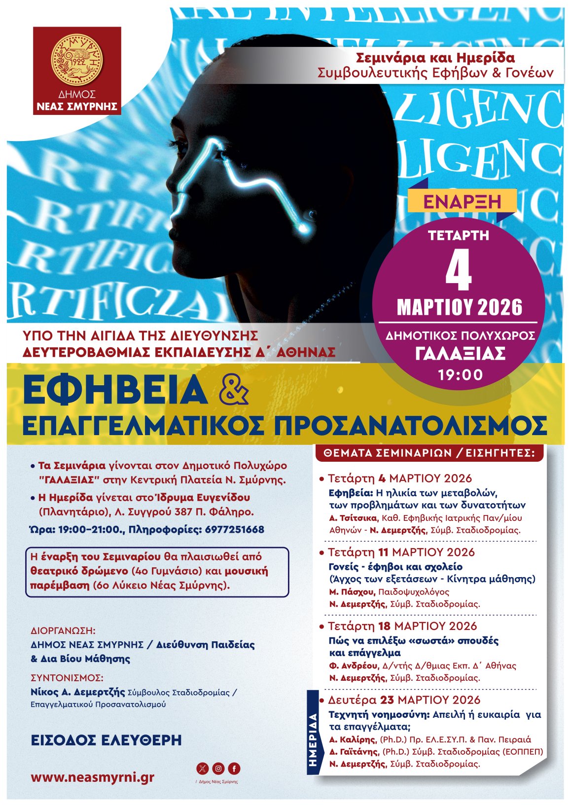 σειρά σεμιναρίων για την Εφηβεία και τον Επαγγελματικό Προσανατολισμό διοργανώνει η Διεύθυνση Παιδείας & Διά Βίου Μάθησης του Δήμου Νέας Σμύρνης υπό την αιγίδα της Διεύθυνσης Δευτεροβάθμιας Εκπαίδευσης Δ’ Αθήνας.