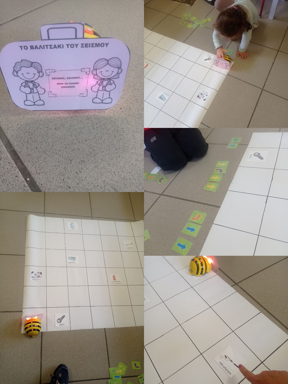 Το Bee-Bot μεταμορφώνεται σε «βαλιτσάκι έκτακτης ανάγκης» και ξεκινά να συγκεντρώνει όλα τα απαραίτητα αντικείμενα που πρέπει να έχουμε μαζί μας σε περίπτωση σεισμού (φακός, νερό, ραδιόφωνο, φαρμακείο, τροφή κ.ά.).