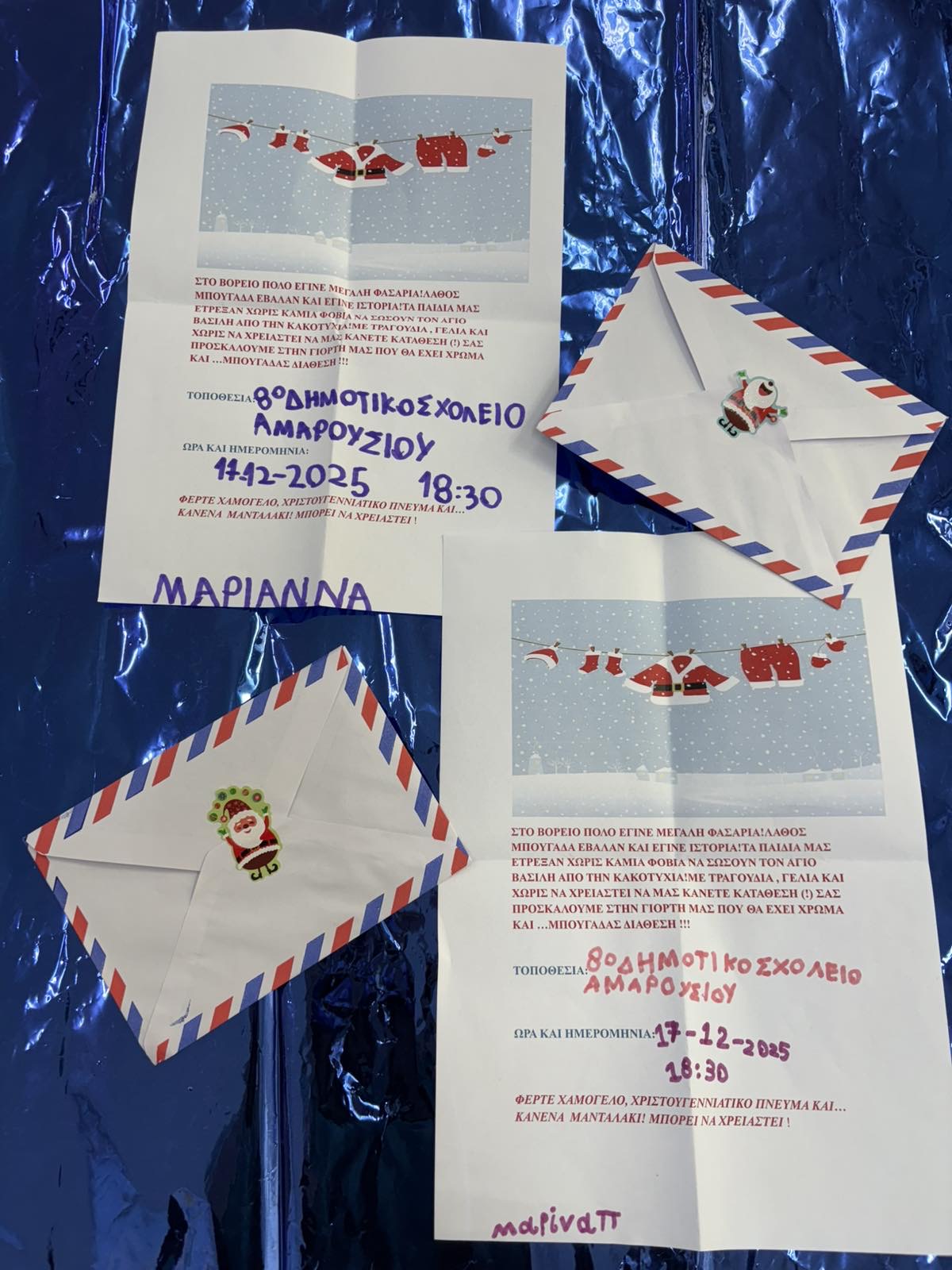 Με χαρά σας προσκαλούμε να ανακαλύψετε μαζί μας τι συνέβη στη στολή του Άι-Βασίλη και αν κατάφερε τελικά να παραδώσει τα δώρα στα παιδιά όλου του κόσμου μέσα από τη Χριστουγεννιάτικη γιορτή που ετοίμασαν τα παιδιά του Νηπιαγωγείου μας, με τίτλο “Η μπουγάδα του Άι-Βασίλη”.
