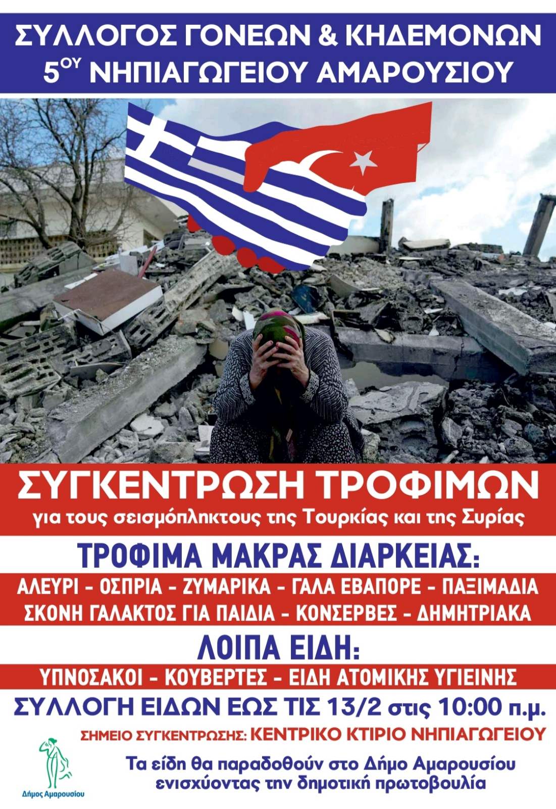 Συγκέντρωση ειδών πρώτης ανάγκης διοργανώνεται τις ημέρες Δευτέρα 13 και Τρίτη 14 Φεβρουαρίου κατά τις ώρες 08:00-20:00 στο Δημαρχείο Αμαρουσίου (Βασ. Σοφίας 9 & Δημ. Μόσχα).