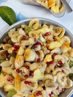 Την πρώτη μέρα φτιάξαμε φρουτοσαλάτα. Ο πάγκος μας γέμισε φρούτα με όλα τα χρώματα του ουράνιου τόξου: μήλα, μπανάνες, πορτοκάλια, ακτινίδια, σταφύλια και αχλάδια. Τα πλύναμε, τα κόψαμε προσεκτικά και τα ρίξαμε όλα μαζί σε ένα μεγάλο μπολ. Όσο ανακατεύαμε, γελούσαμε, μαντεύαμε ποιο φρούτο θα δοκιμάσουμε πρώτο και ο αέρας γέμισε φρεσκάδα και χαμόγελα!