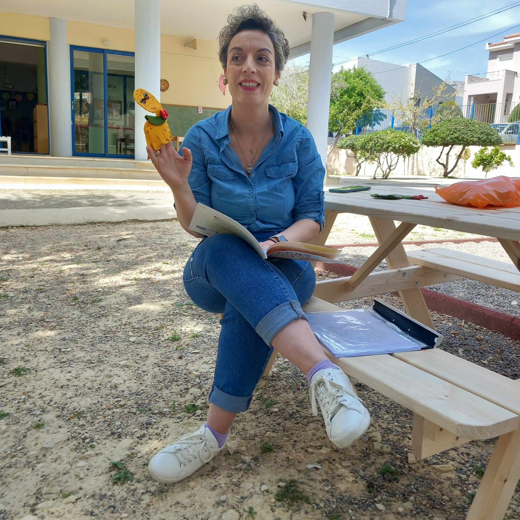 Θυμηθήκαμε όμως, πως 2 Απριλίου γιορτάζεται και η Παγκόσμια Ημέρα Αυτισμού. Τι καλύτερο να τις γιορτάσουμε μαζί προσκαλώντας στην ανοιξιάτικη αυλή μας την κ. Μαρίκα Γιαννίρη, μανούλα μαθητή μας, που ξεκίνησε τη συγγραφική της προσπάθεια εκδίδοντας ένα τρυφερό παραμύθι για τη διαφορετικότητα, με ήρωα τον Τάκη, ένα μικρό αλλά διαφορετικό δεινόσαυρο!