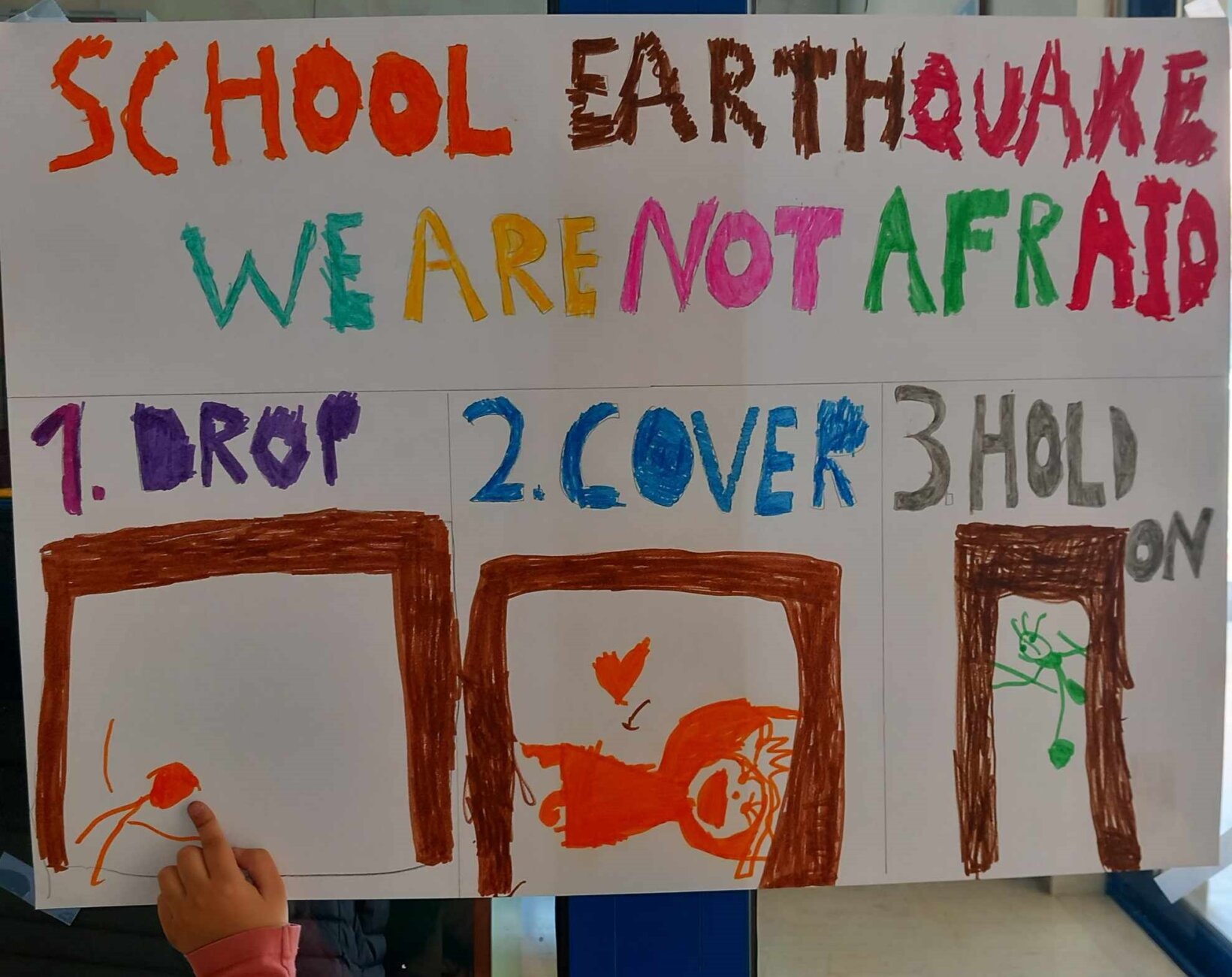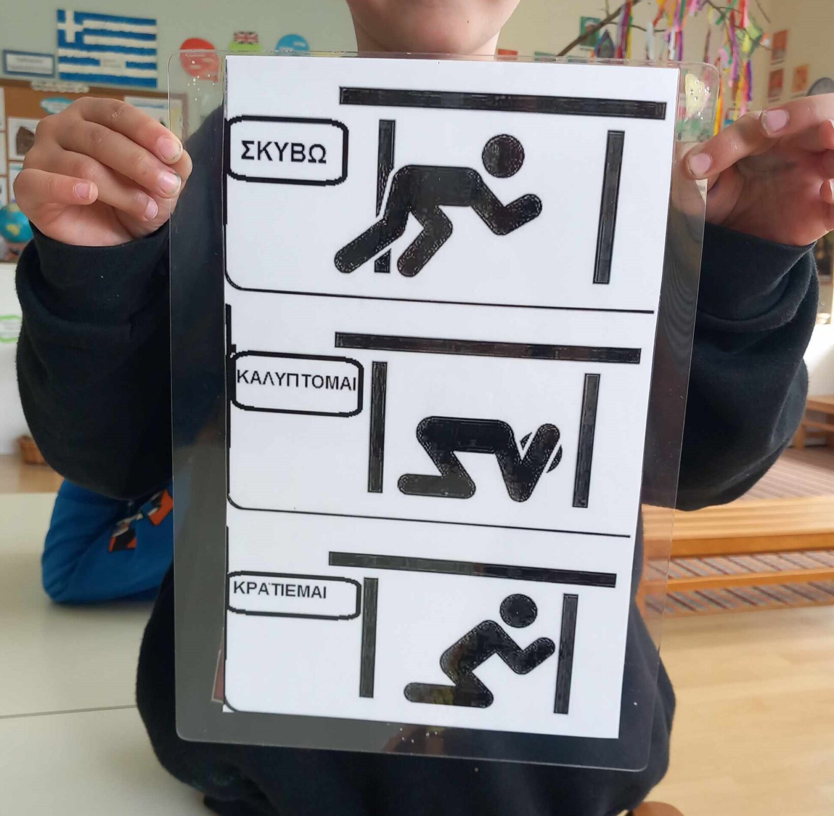 Στη συνέχεια θυμηθήκαμε τα τρία βήματα που θα πρέπει να ακολουθούμε σε περίπτωση σεισμού τόσο στα ελληνικά, όσο και στα αγγλικά, και τα αποτυπώσαμε σε αφίσα!