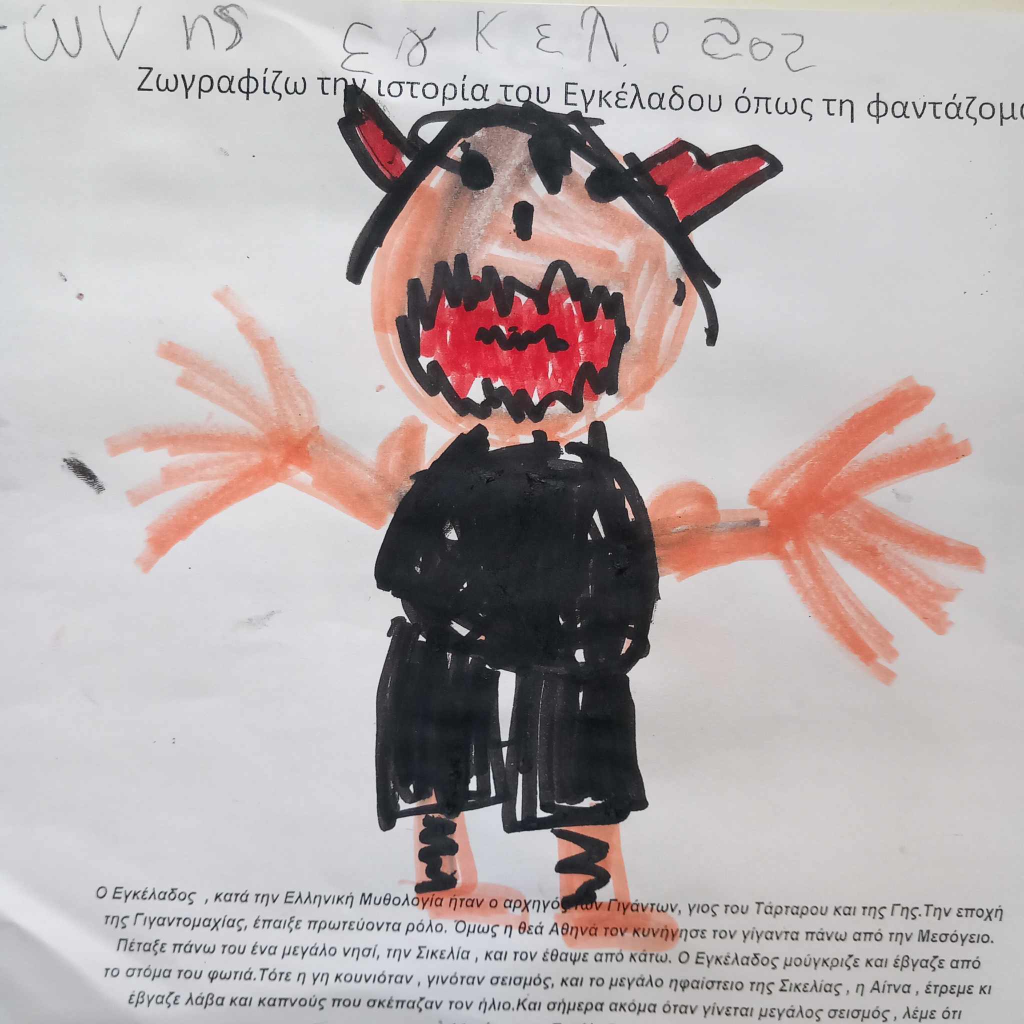 Το φυσικό φαινόμενο του σεισμού μονοπώλησε το ενδιαφέρον μας, δεδομένου ότι ζούμε σε μια σεισμογενή περιοχή. Επικαιροποιήσαμε τις γνώσεις μας σε σχέση με το σεισμό και γνωρίσαμε το μύθο του Εγκέλαδου, θέλοντας να δείξουμε στα παιδιά τον τρόπο που εξηγούσαν οι άνθρωποι τα φυσικά φαινόμενα την εποχή που η επιστήμη δεν είχε ακόμη προχωρήσει.