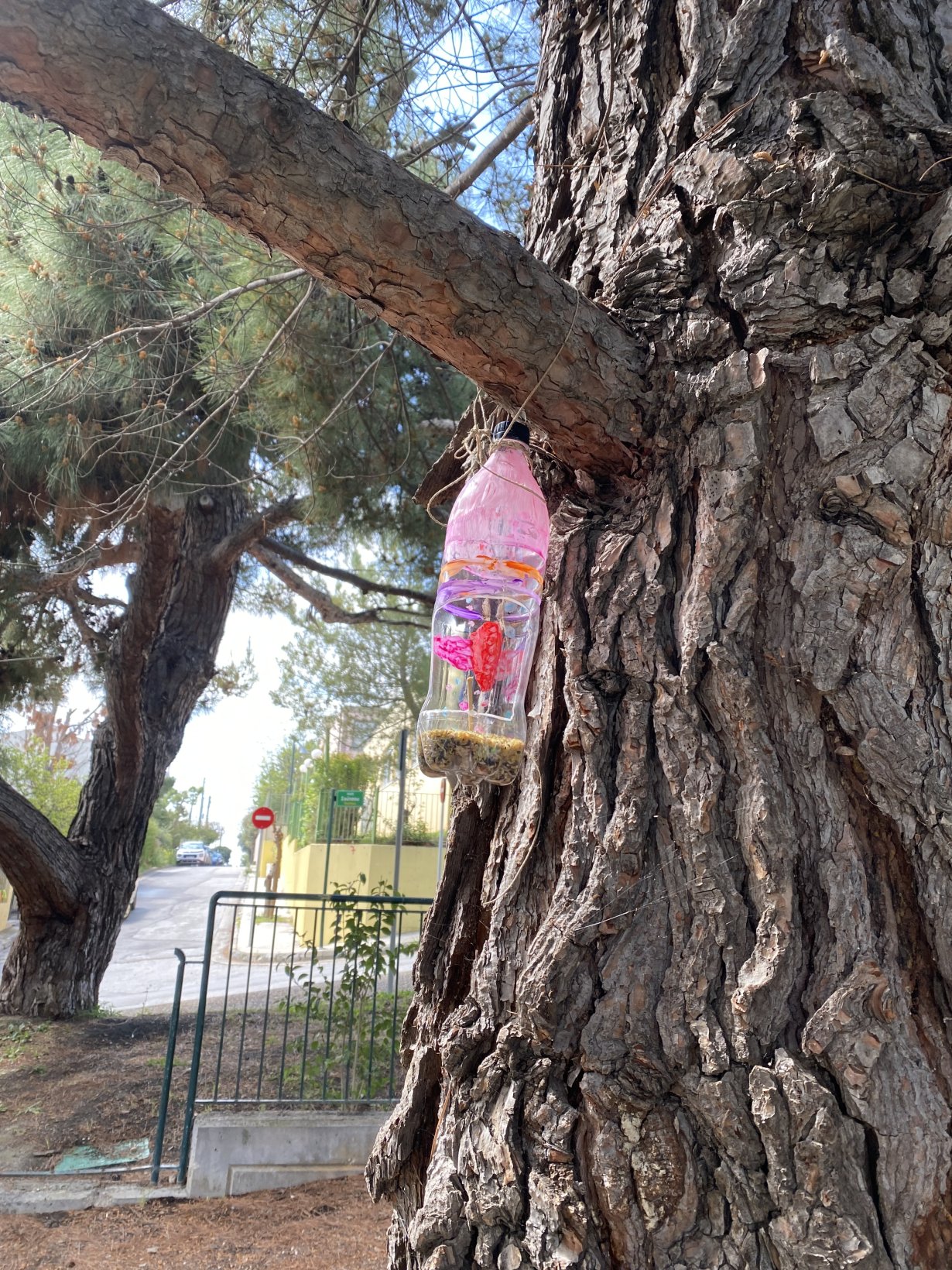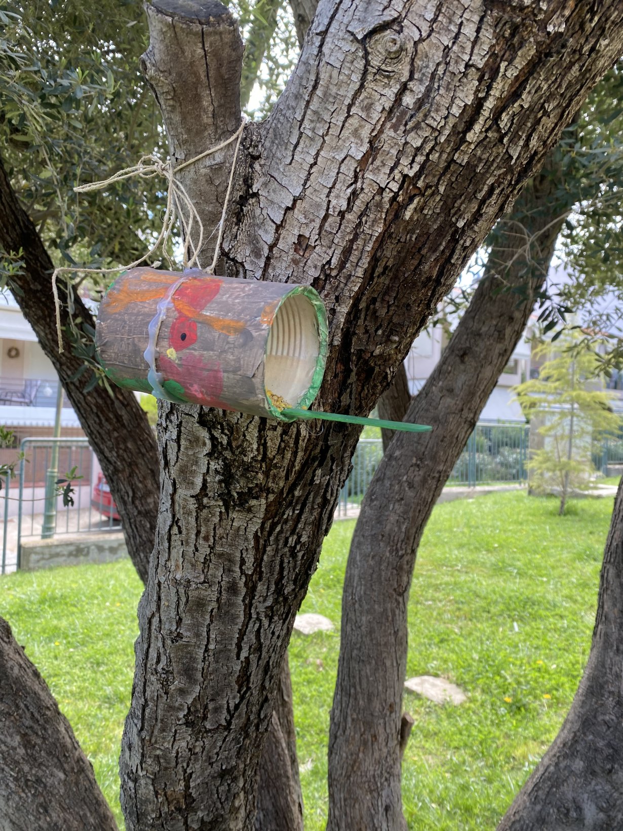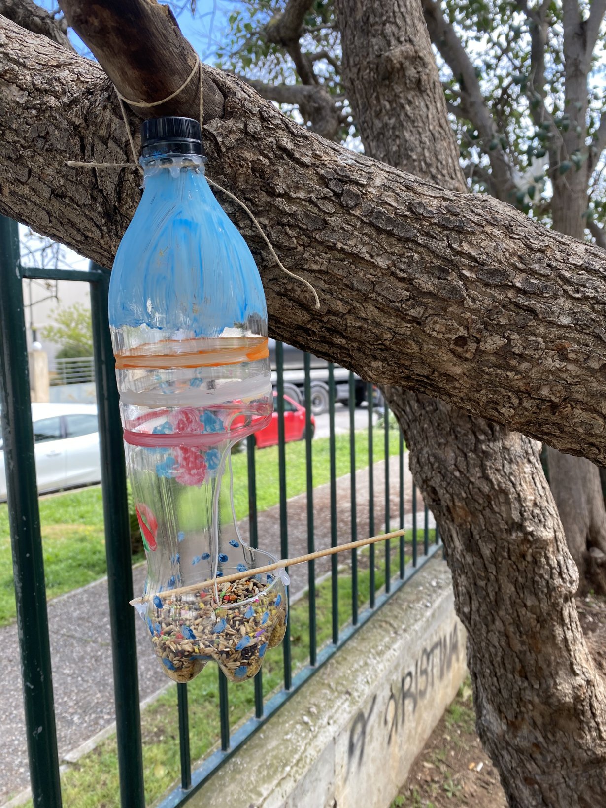 • Κατασκευάσαμε ταΐστρες για τα πουλάκια, χρησιμοποιώντας ανακυκλώσιμα υλικά! Τις τοποθετήσαμε στα δέντρα του πάρκου, ώστε τα πουλιά να βρίσκουν τροφή – ειδικά τις πιο δύσκολες μέρες.