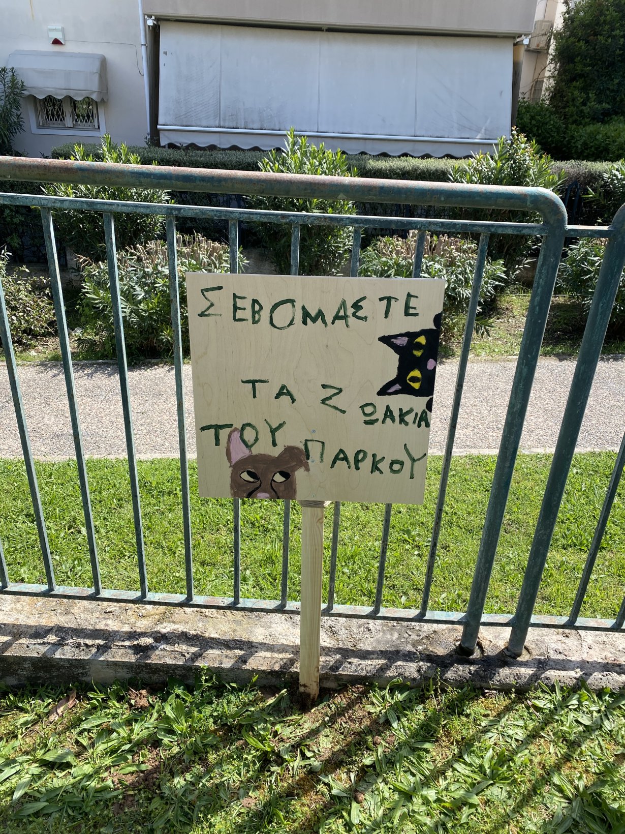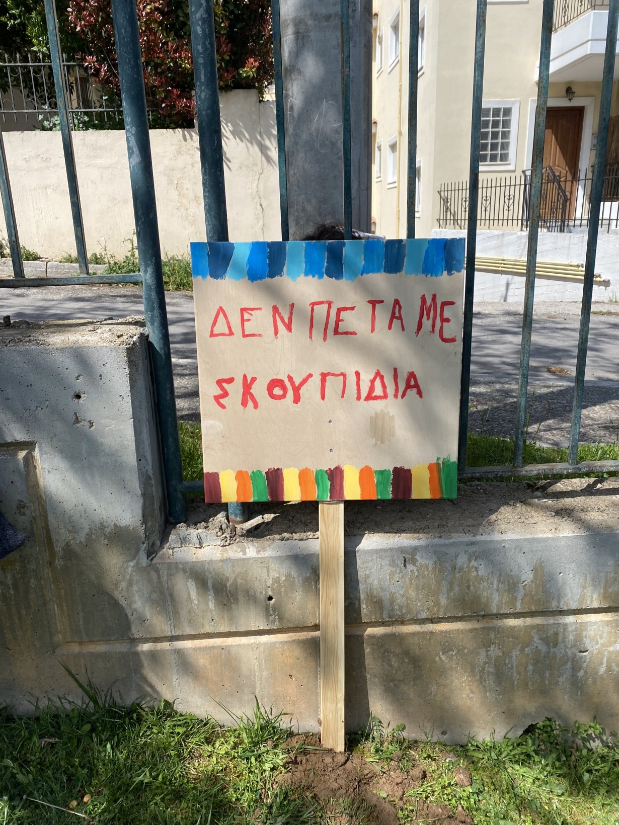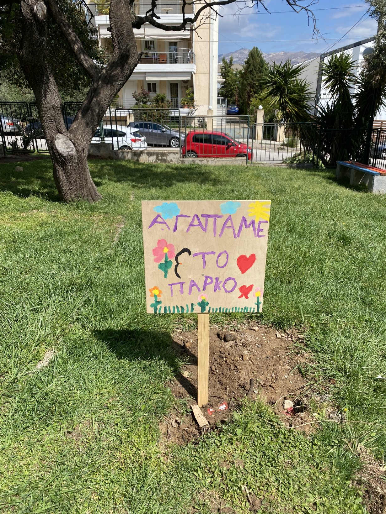 • Φτιάξαμε πινακίδες για την προστασία και την καθαριότητα του πάρκου, με μηνύματα που σχεδιάσαμε και ζωγραφίσαμε εμείς! Οι πινακίδες καλούν μικρούς και μεγάλους να σεβαστούν τη φύση και να διατηρούν το πάρκο καθαρό.