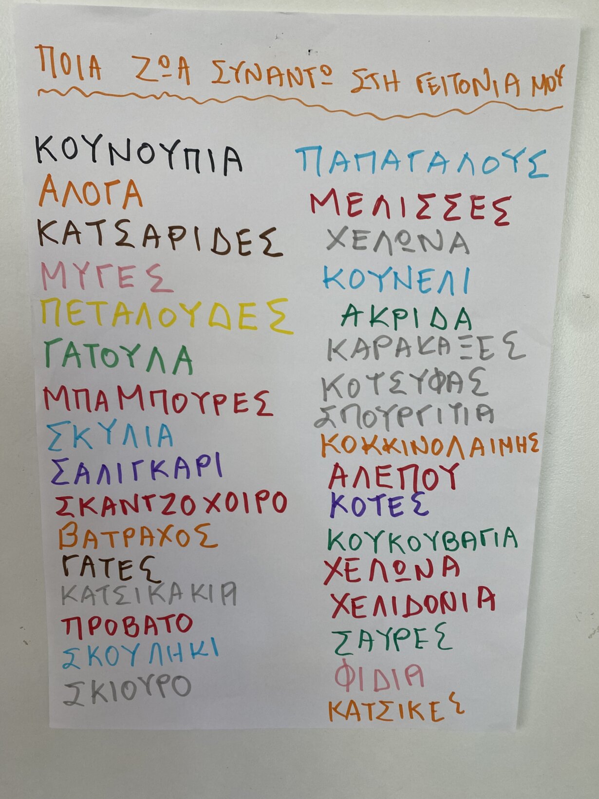 Φτιάξαμε, στην ομάδα, λίστες με τα ζώα που συναντώ στη γειτονιά μου.