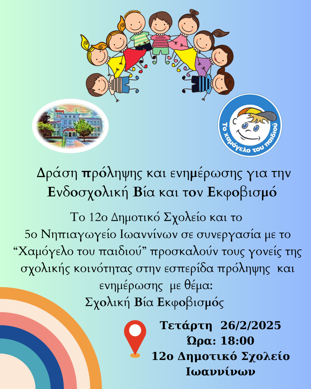 Το 5ο Νηπιαγωγείο, σε συνεργασία με το 12ο Δημοτικό Σχολείο οργάνωσε και πραγματοποίησε τη δεύτερη εσπερίδα πρόληψης και ενημέρωσης για εκπαιδευτικούς με θέμα: «Ενδοσχολική Βία και Εκφοβισμός: Υποστηρίζοντας τον/την Εκπαιδευτικό». Η δράση υλοποιήθηκε με τη συμβολή του οργανισμού «Το Χαμόγελο του Παιδιού», προσφέροντας πολύτιμες γνώσεις και πρακτικές στρατηγικές για την αντιμετώπιση του φαινομένου στο σχολικό περιβάλλον. Επίσης συμμετείχαν το 4ο Ειδικό Δημοτικό Σχολείο, το Δημοτικό Σχολείο Κρανούλας και τα Νηπιαγωγεία Κρανούλας και 34ο Ιωαννίνων,